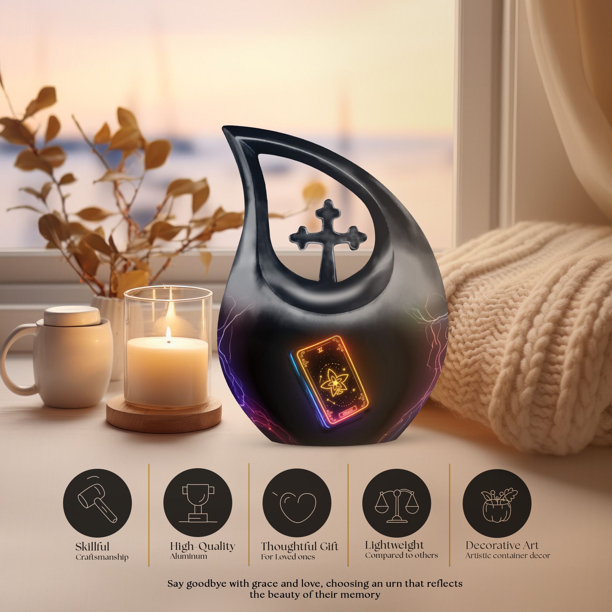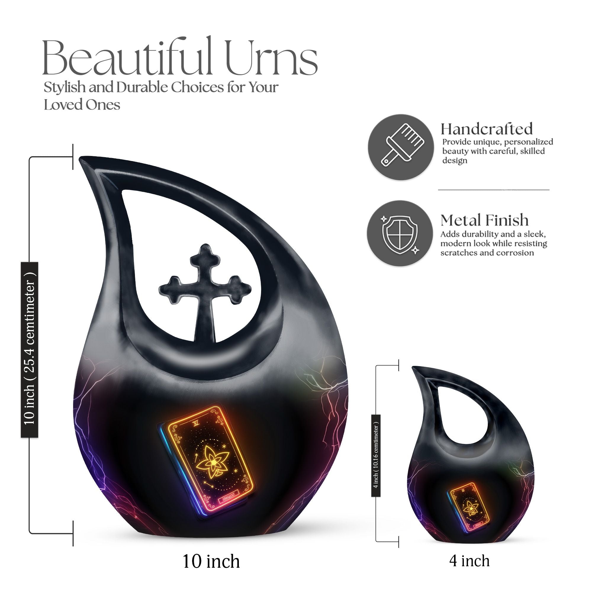 Experience a deeper, more profound connection to your lost loved ones with our magnificent Tarot Urn. This stunning masterpiece, crafted with diligence, serves beyond mere funeral options; it's an engaging symbol of the love you shared. Our 10-inch Cross Drop Urn showcases detail and quality, constructed from robust aluminium. It's an extraordinary piece, standing at an imposing 10 inches in height, with a weight of just 3.3 pounds and a generous capacity of 200 cubic inches. Safeguard precious tokens or ashes in our complimentary velvet pouch, a reminder of treasured memories. Exhibiting a radiant Tarot theme, this large urn subtly speaks volumes about cosmo mysteries and the voyage of life and death. Add a personalised touch with our unique custom engraving options. This urn elegantly fits into the ‘Decorative Urns For Ashes’ or 'Beautiful Urns' categories, making it not just an urn, but a heartfelt keepsake. Search terms include ‘Urn For Mom’ and ‘Funeral Urns For Ashes.'