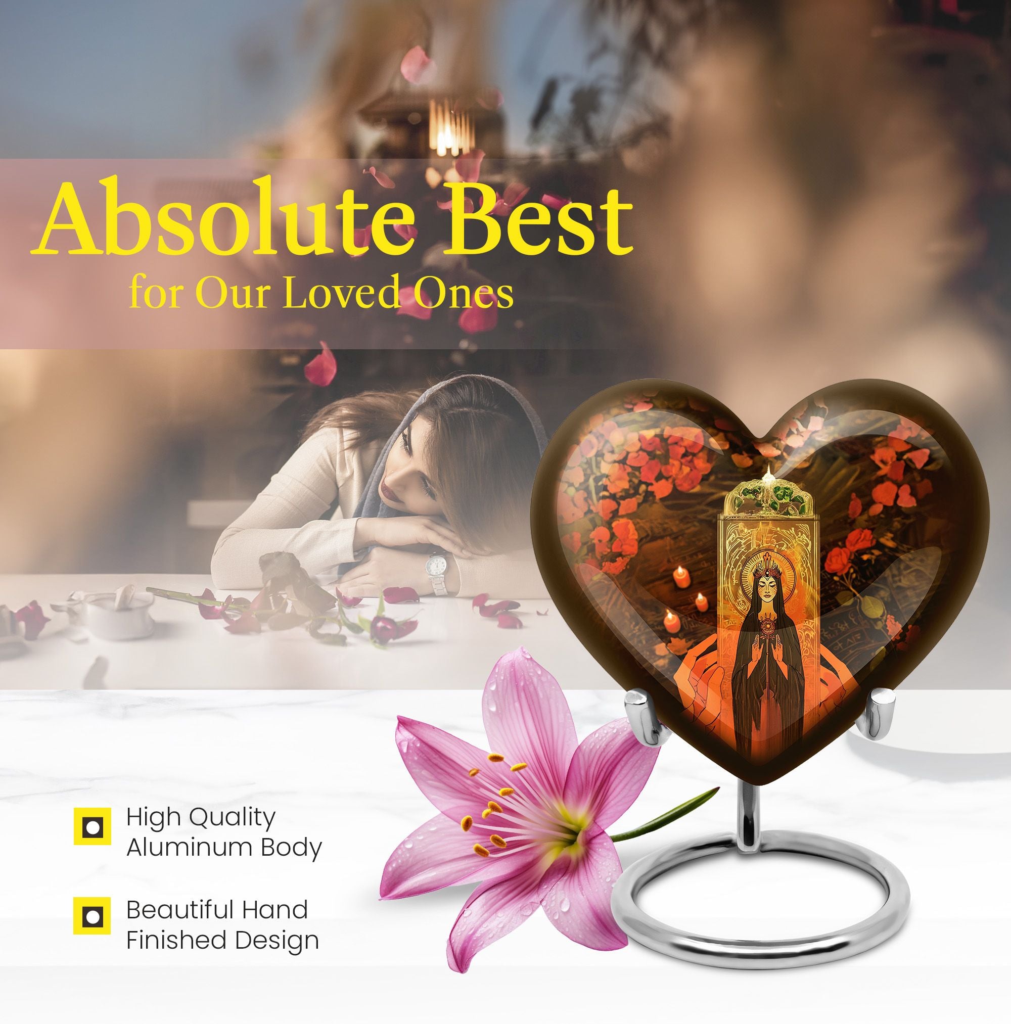Introducing our meticulously crafted Tarot Urn, a beautiful, substantial memorial forever urn that seamlessly blends an abstract theme with an intricately designed heart finish, making it an icon of remembrance. Built with premium aluminium, this large urn has an imposing height of 10 inches and comes with a gently weighted feel of 3.3 pounds. It has a substantial capacity, accommodating up to 200 cubic inches of ashes. Add a further layer of meaningfulness to this irreplaceable item with our customization feature that allows for engraved names. Each Tarot Urn is tastefully sent with a velvet pouch that provides a soft, respectful containment for the ashes. From funeral urns for human ashes adult to human cremation urn, our scope of products understands the nuances of your sentiments. Please note, due to the sensitivity of our work, we avoid marketplace terminologies in our interactions.