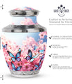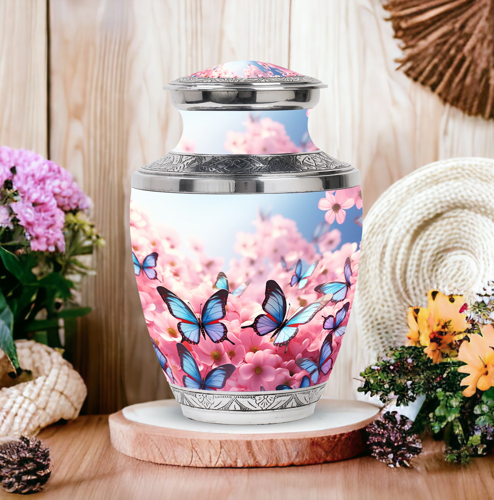 The Blue Butterfly Cremation Urn Tribute for Ashes combines the serenity of butterfly symbolism with the gentle beauty of pink floral patterns, creating a memorial that reflects peace, love, and eternal remembrance. This large cremation urn is crafted to last, designed with precision and care for families who seek both elegance and strength.
