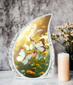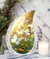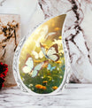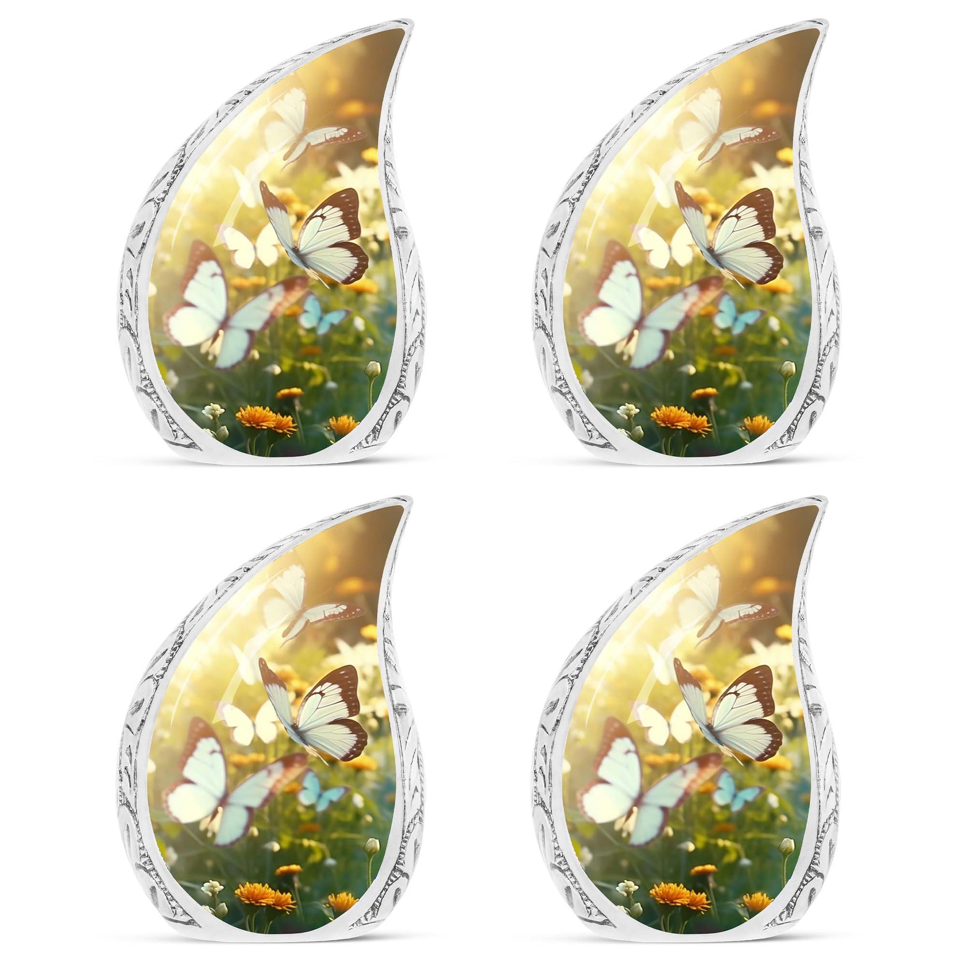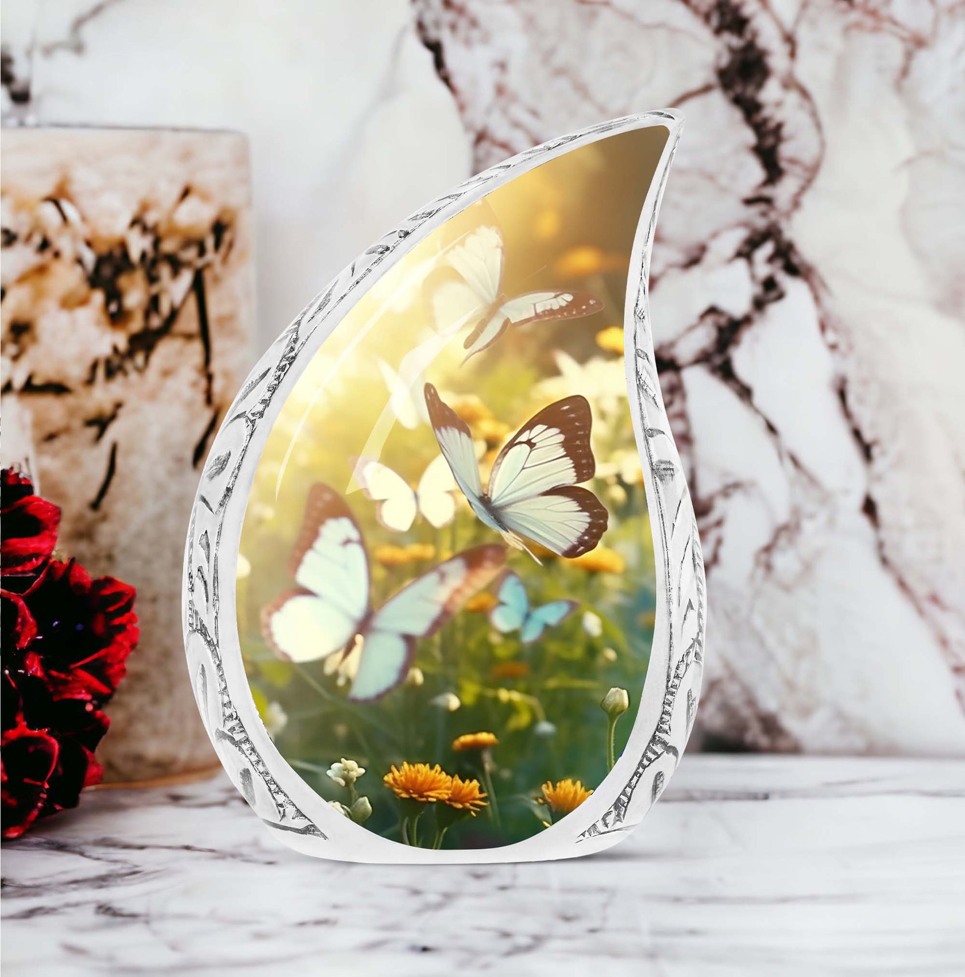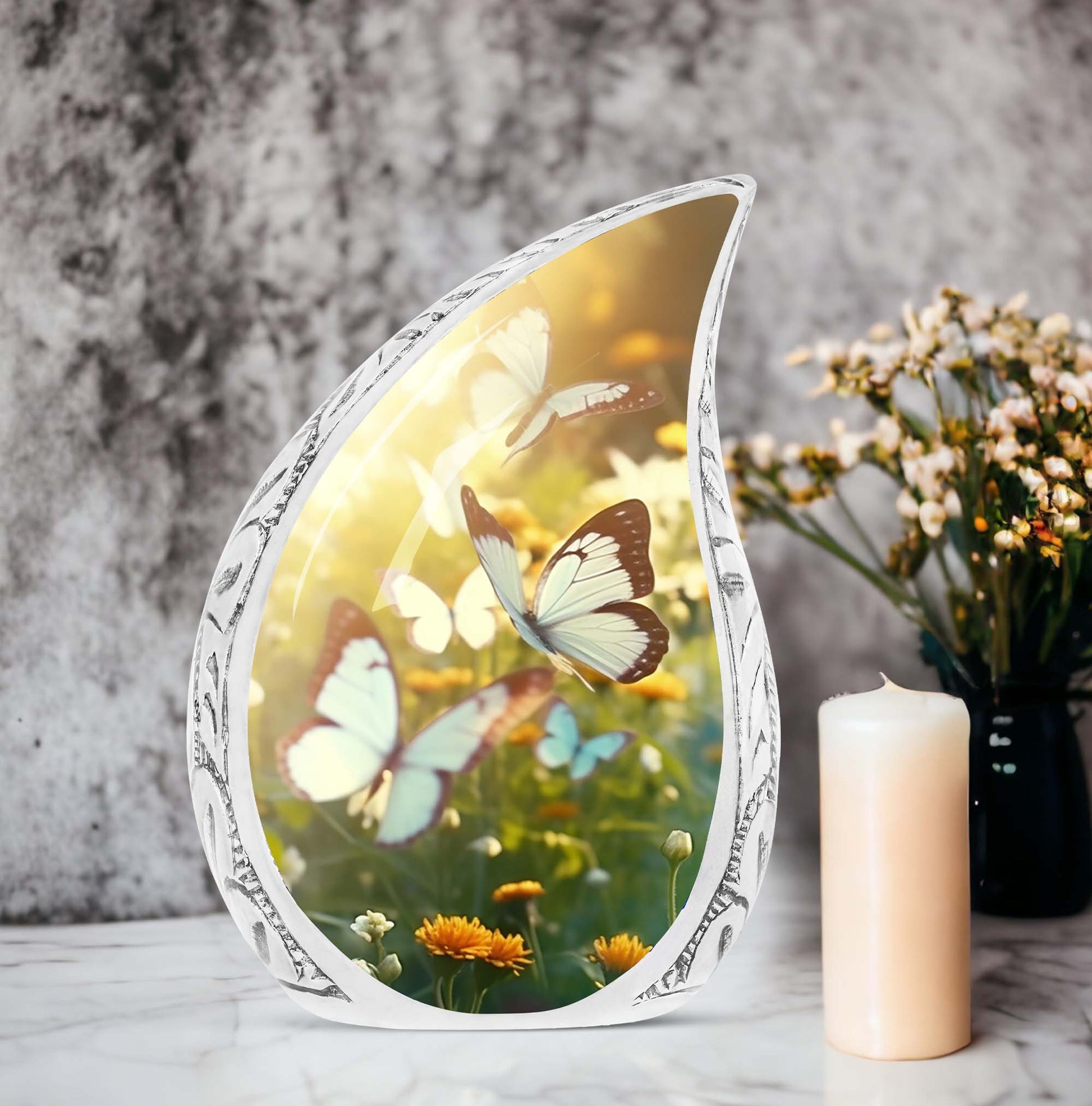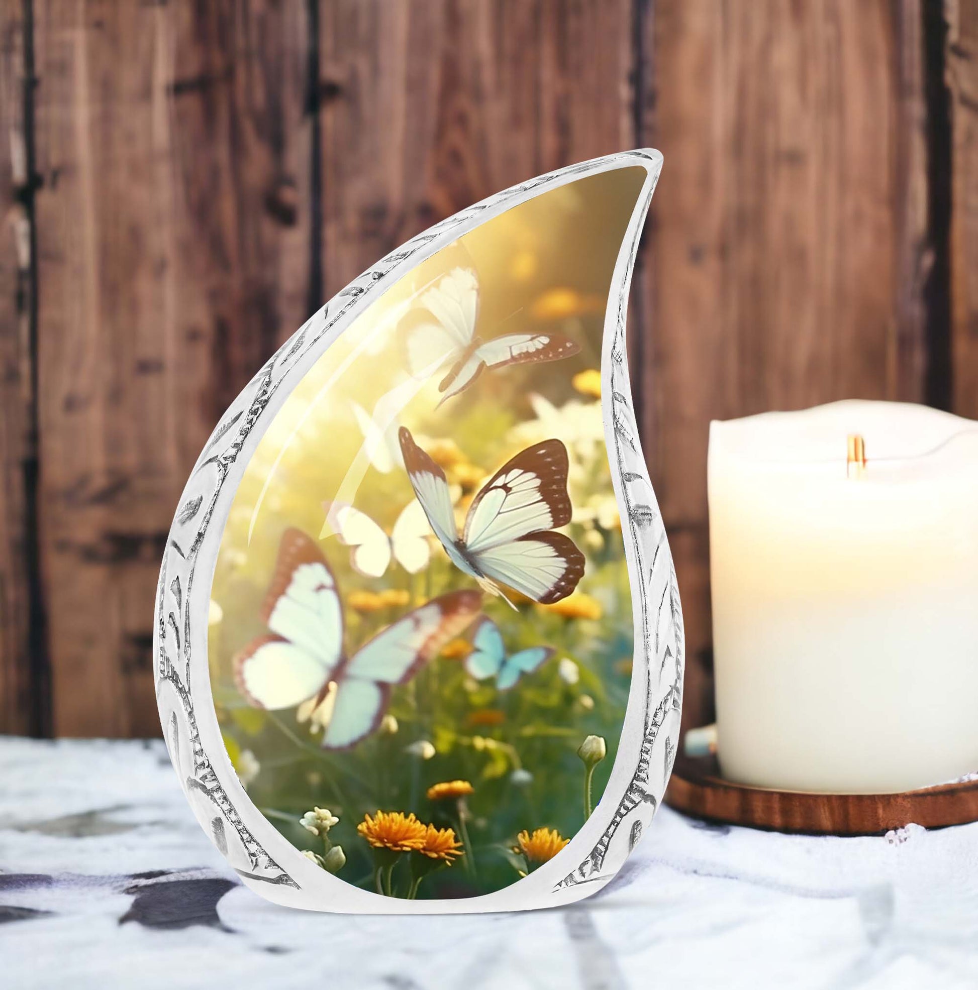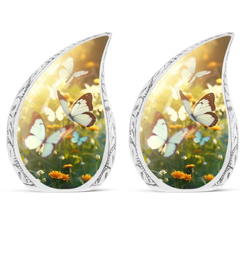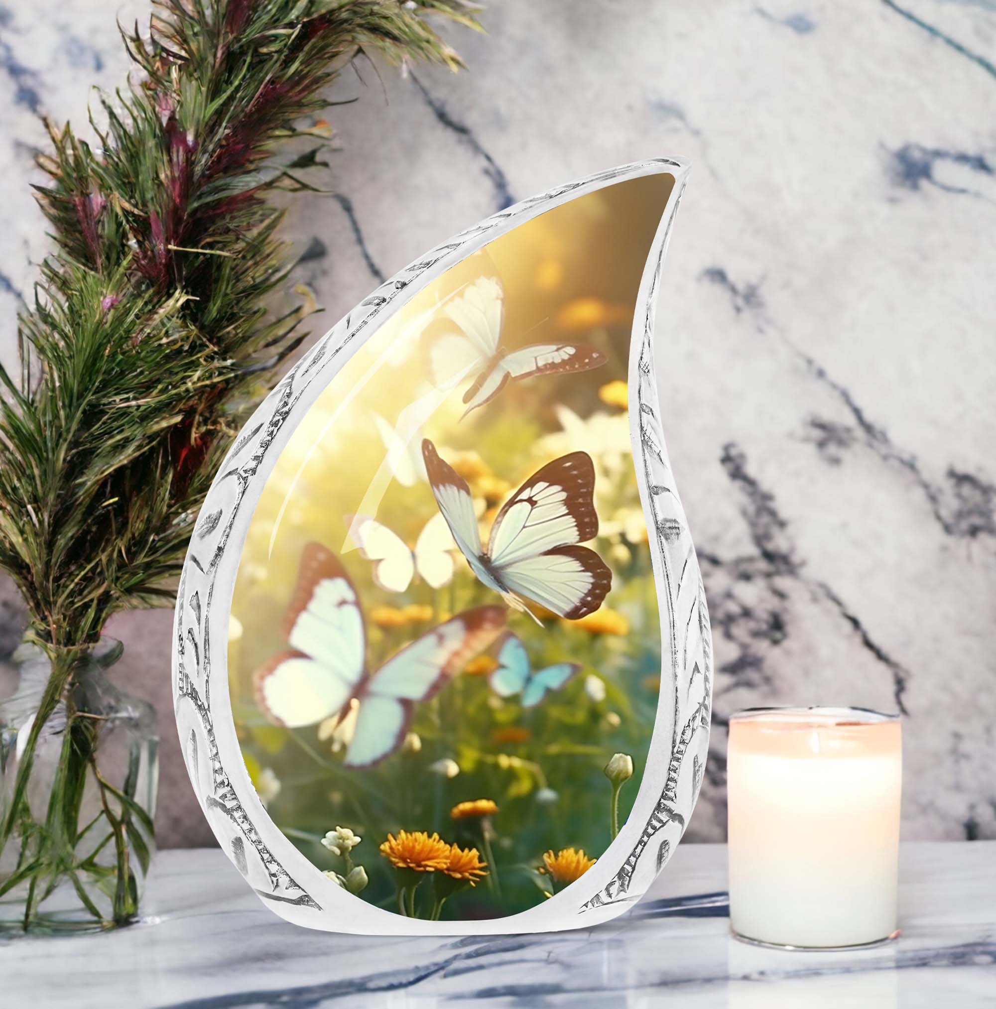 Experience the serenity of a tastefully designed final resting place with the Pieridae Butterflies Memorial Urn, the perfect homage to your loved one. This large urn is crafted of high-quality aluminium which imparts durability, ensuring a timeless memorial that lasts the ages. It stands elegantly at 10 inches in height and gracefully accommodates up to 200 cubic inches of cremation ashes. With this urn for ashes, one can feel the weight of memories, love, and respect in its 3.3 pounds. Personalize it with engraved names for that unique and intimate touch. The thoughtful packaging includes a velvet pouch providing a respectful containment for the ashes. Whether it's for human cremation ashes or you're looking for modern personalized metal urns, this urn deserves your consideration.