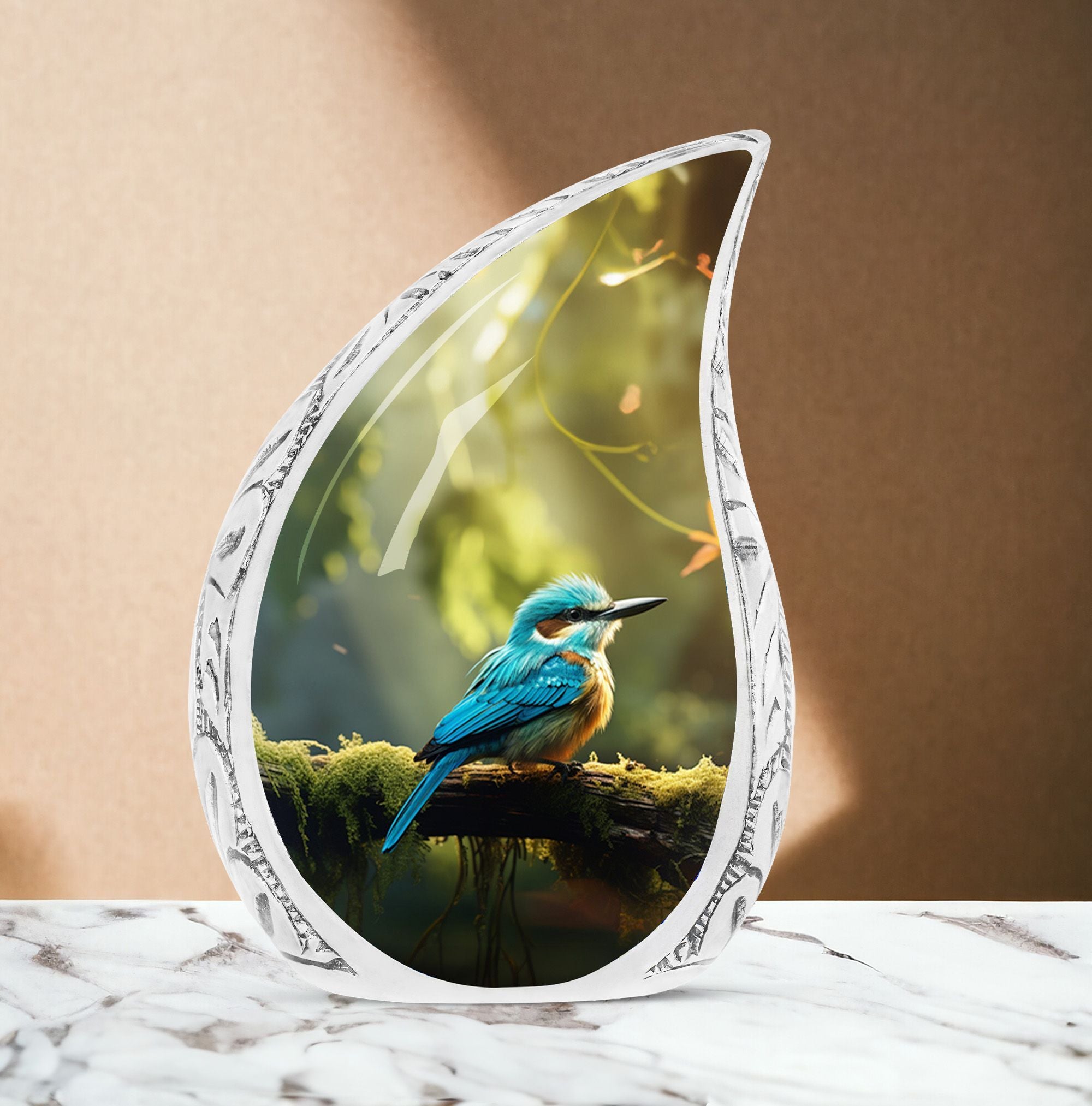 Celebrate a lifetime of memories with our 'Blue Sparrow Urn', a timeless, large urn that is an embodiment of remembrance and respect. Crafted with precision from sturdy aluminium, this urn weighs 3.3 pounds and stands 10 inches tall. Its large size bolsters a capacity of 200 cubic inches, ample space to safeguard the ashes of your beloved. Our cremation urns come packaged with a velvet pouch, providing a dignified containment for the remains. This 3-inch memorial urn serves not just as an ashes holder but a tribute to the life spent. For a truly unique urn for ashes, we offer the service to personalize this piece with engraved names, adding that special touch. With the Blue Sparrow Urn, you carry close the precious vestiges and memories of your loved ones. Please note, the design is a Classic Urn, making it a perfect addition to your memorial ceremony supplies. Remember and cherish, with our personally customizable, large urns for ashes.