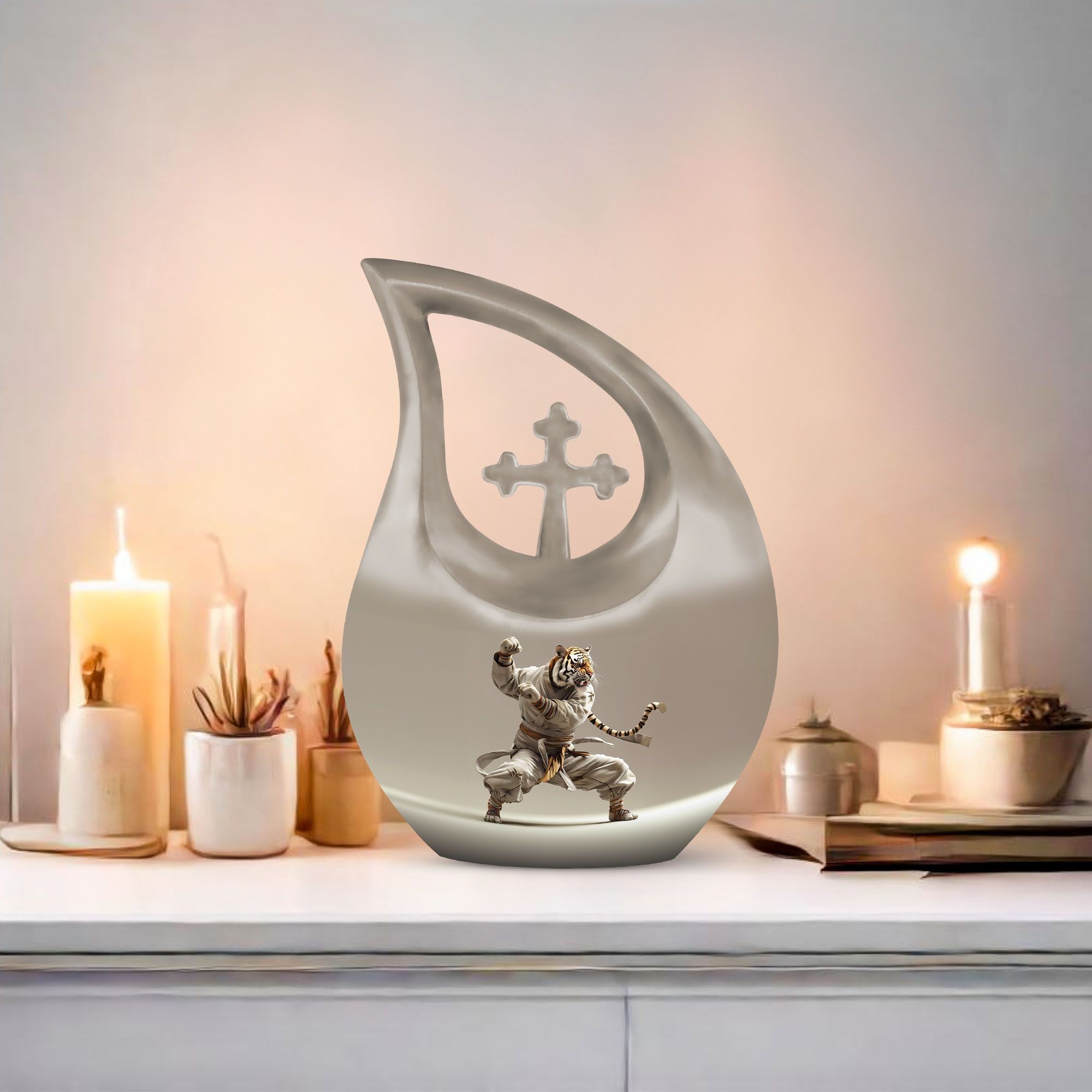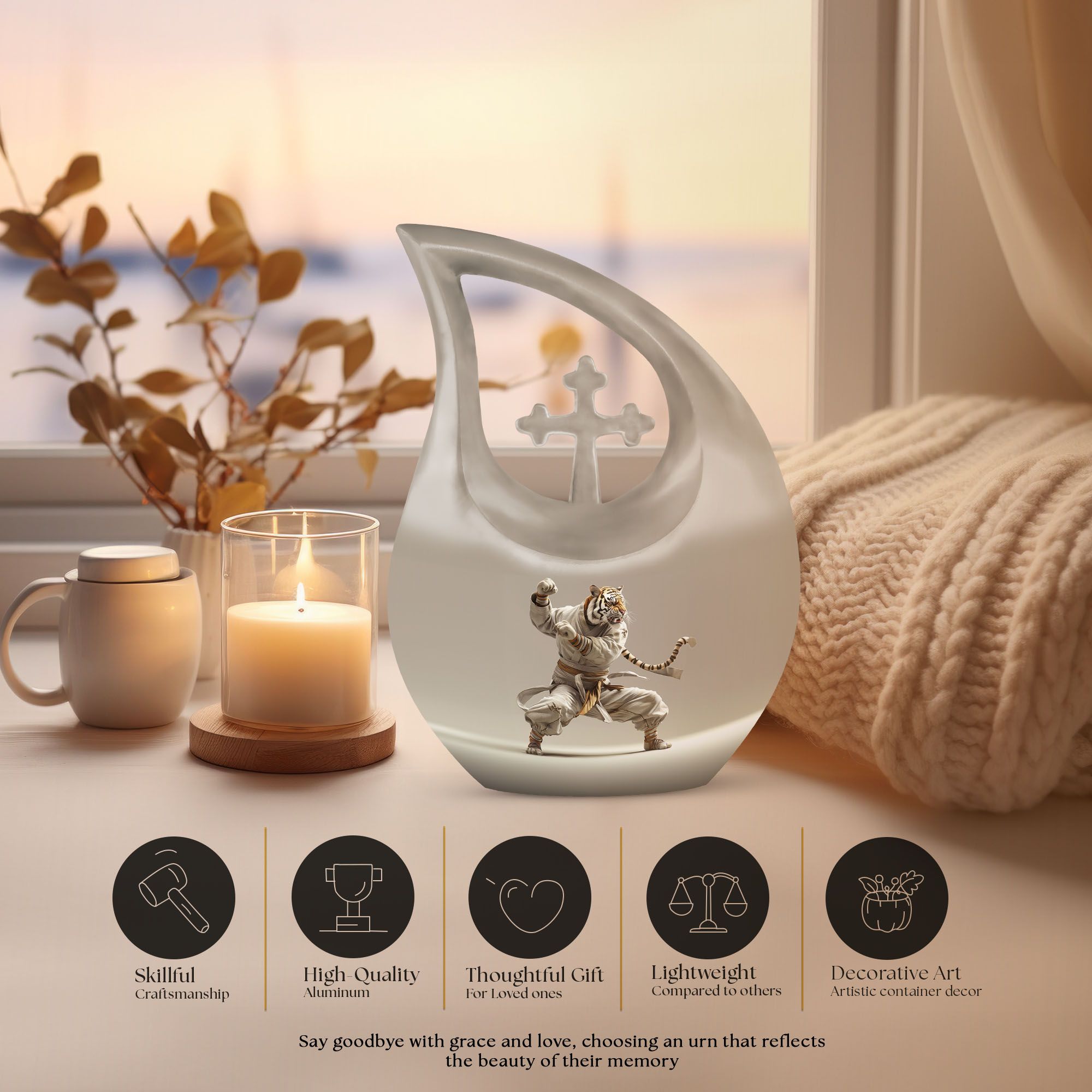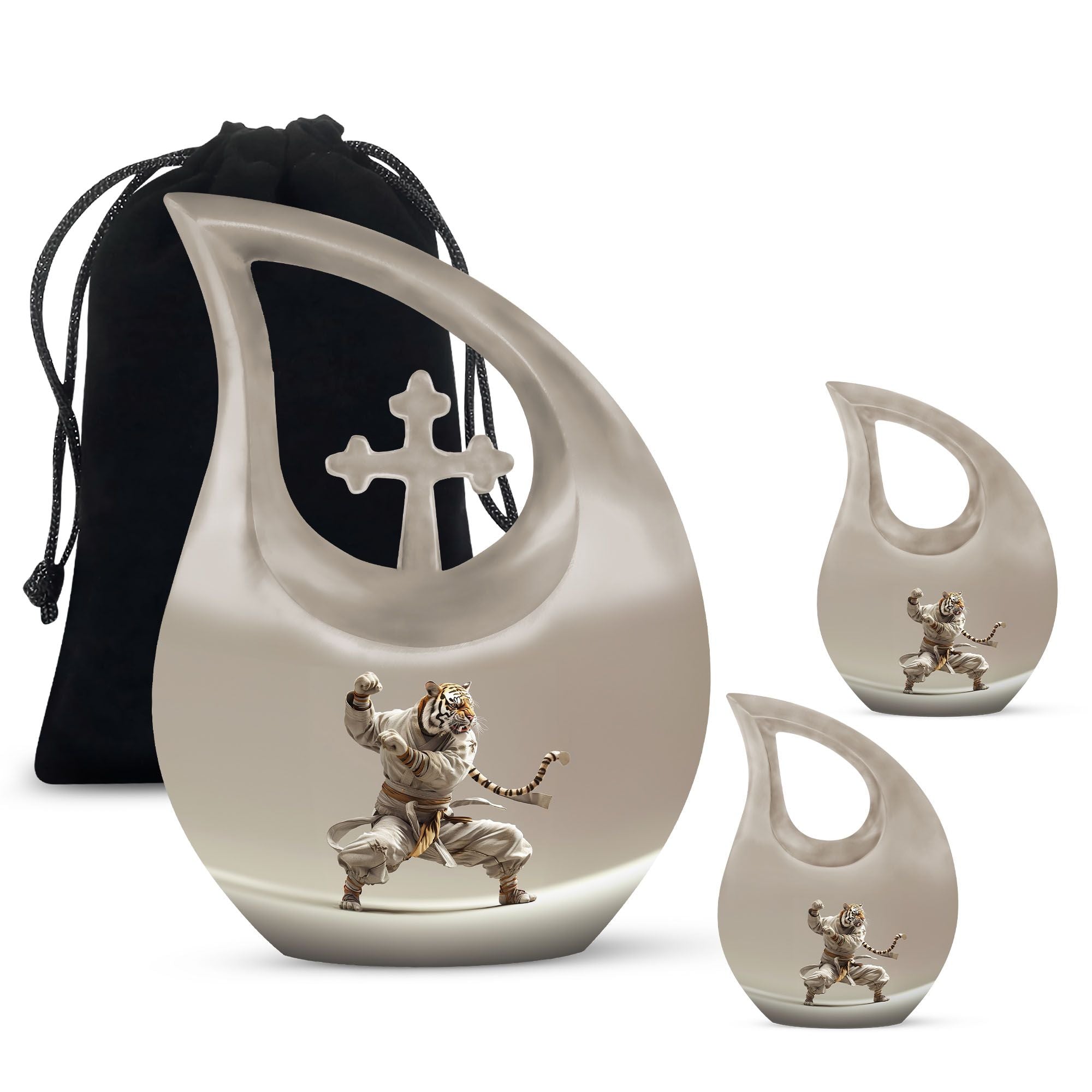 Honor your loved one's memory in a unique way with our striking Tiger-themed Large Urn. Specially designed as an online exclusive item, this 10-inch memorial urn is delicately crafted from exceptional quality aluminium and is sturdy enough to weigh 3.3 pounds. Its mesmerizing 'Cross Drop' design ingredient is a gentle reminder of love, loss, and remembrance. Every detail, from its impressive 200 cubic inches capacity to its meticulous form, is unequivocally captivating. For added convenience, each purchase includes a plush velvet pouch, precisely designed to safeguard the precious ashes of your beloved. Your personal touch can be added by engraving names, effectively transforming this urn into a poignant keepsake memory box. With Tiger Urn, memorializing is not just an act, but an exquisite journey of recollection. Unparalleled in its class, our Large Urn is a testament to the enduring bond of love and an artful alternative to traditional cremation boxes for adults. Explore and purchase urns online from our exclusive range today.
