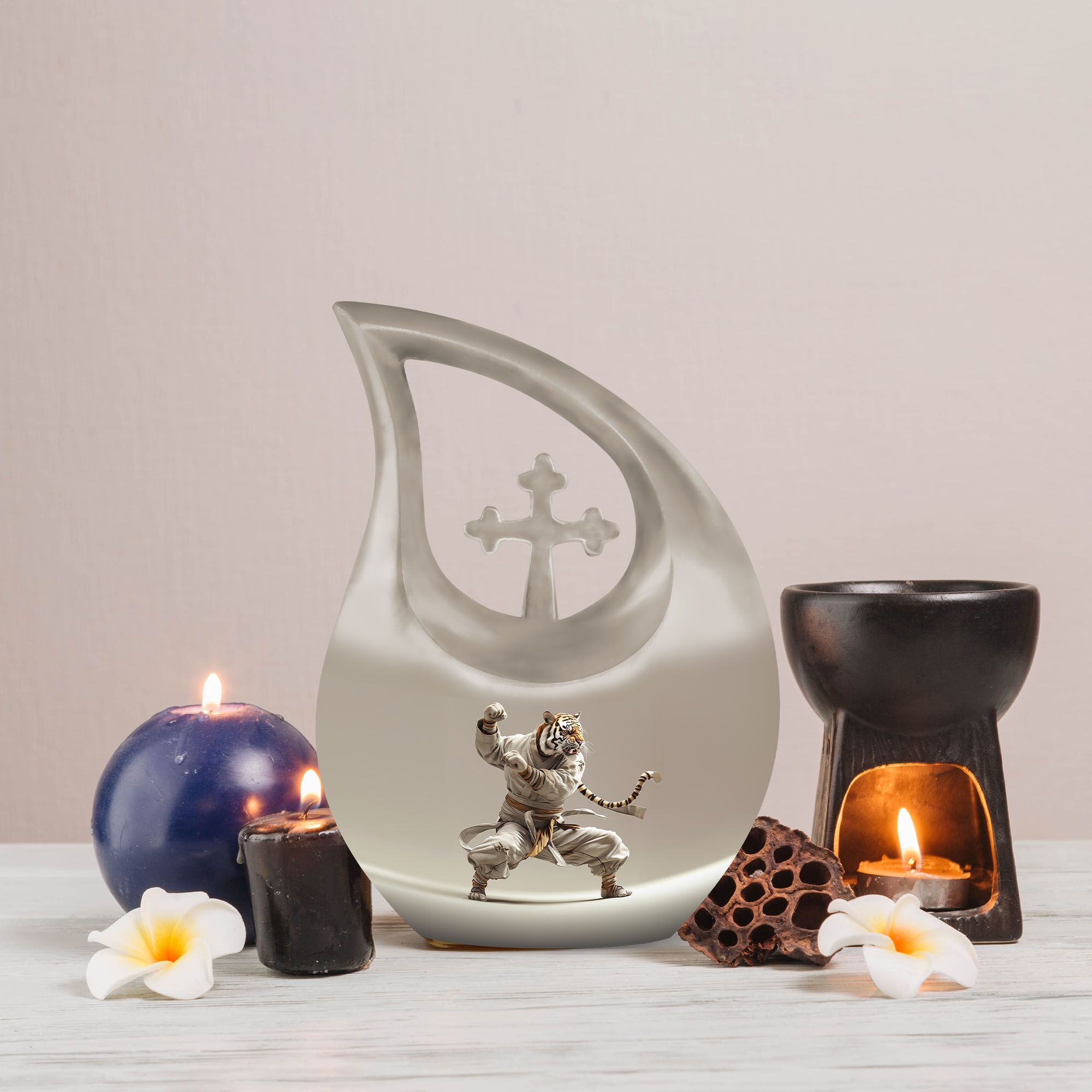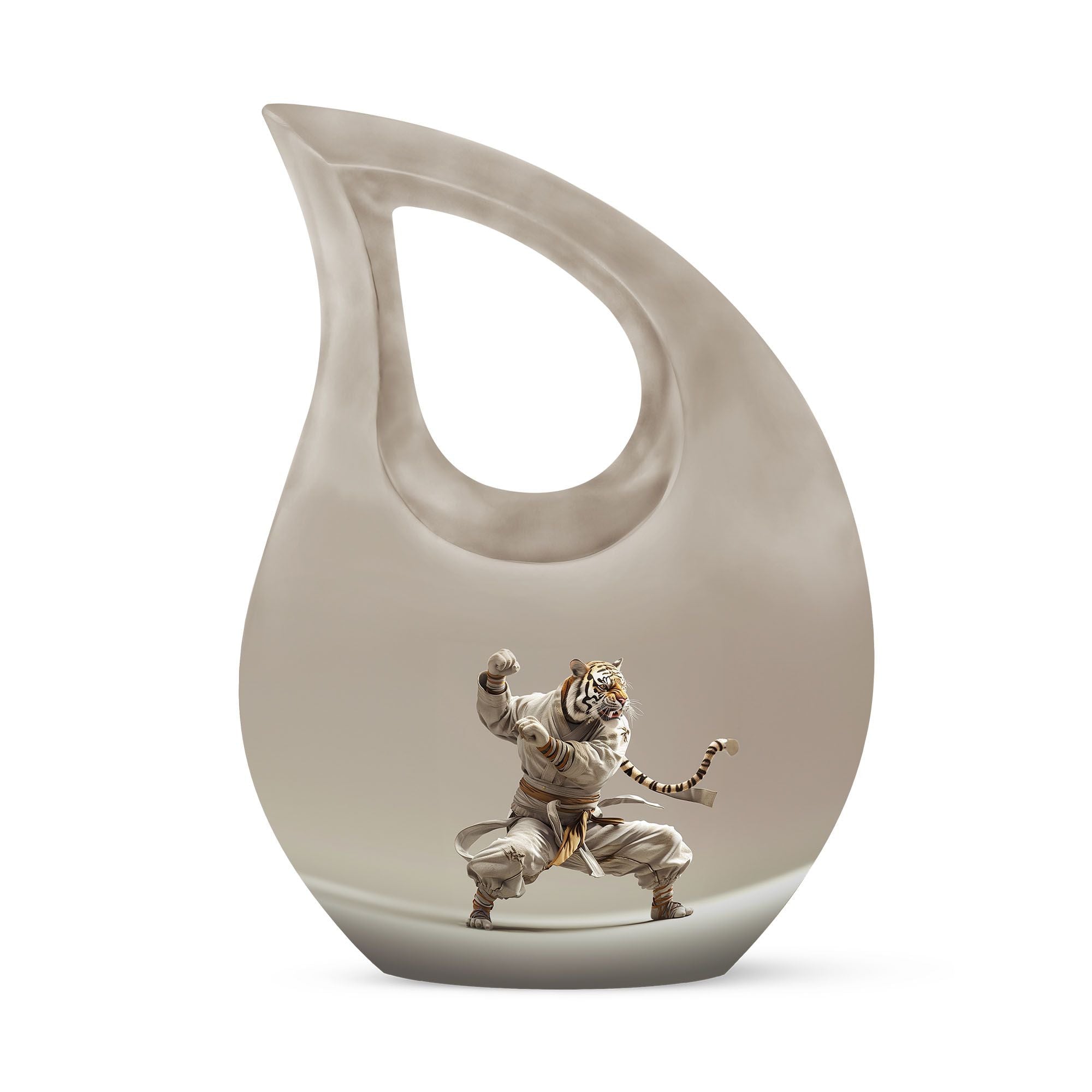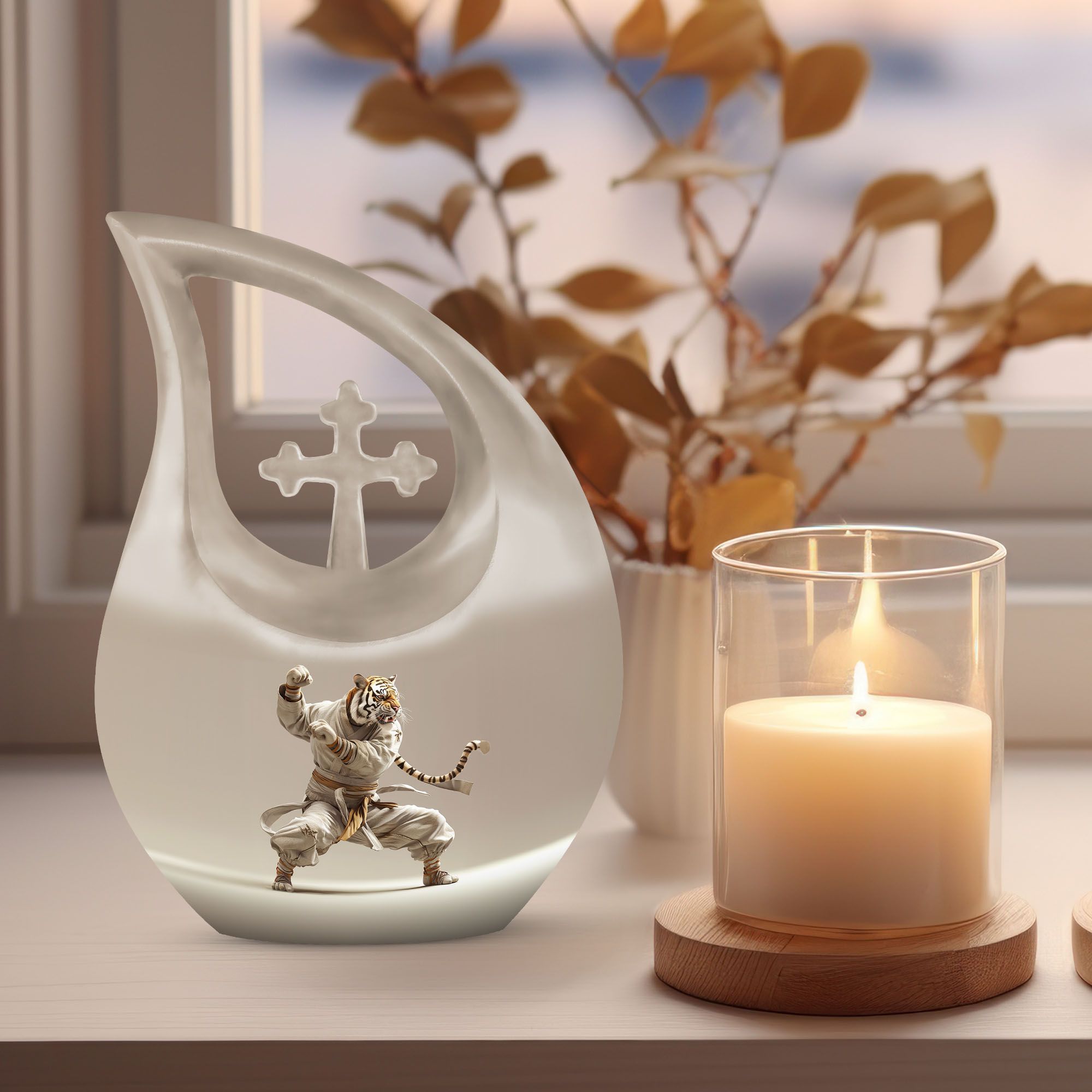 Honor your loved one's memory in a unique way with our striking Tiger-themed Large Urn. Specially designed as an online exclusive item, this 10-inch memorial urn is delicately crafted from exceptional quality aluminium and is sturdy enough to weigh 3.3 pounds. Its mesmerizing 'Cross Drop' design ingredient is a gentle reminder of love, loss, and remembrance. Every detail, from its impressive 200 cubic inches capacity to its meticulous form, is unequivocally captivating. For added convenience, each purchase includes a plush velvet pouch, precisely designed to safeguard the precious ashes of your beloved. Your personal touch can be added by engraving names, effectively transforming this urn into a poignant keepsake memory box. With Tiger Urn, memorializing is not just an act, but an exquisite journey of recollection. Unparalleled in its class, our Large Urn is a testament to the enduring bond of love and an artful alternative to traditional cremation boxes for adults. Explore and purchase urns online from our exclusive range today.