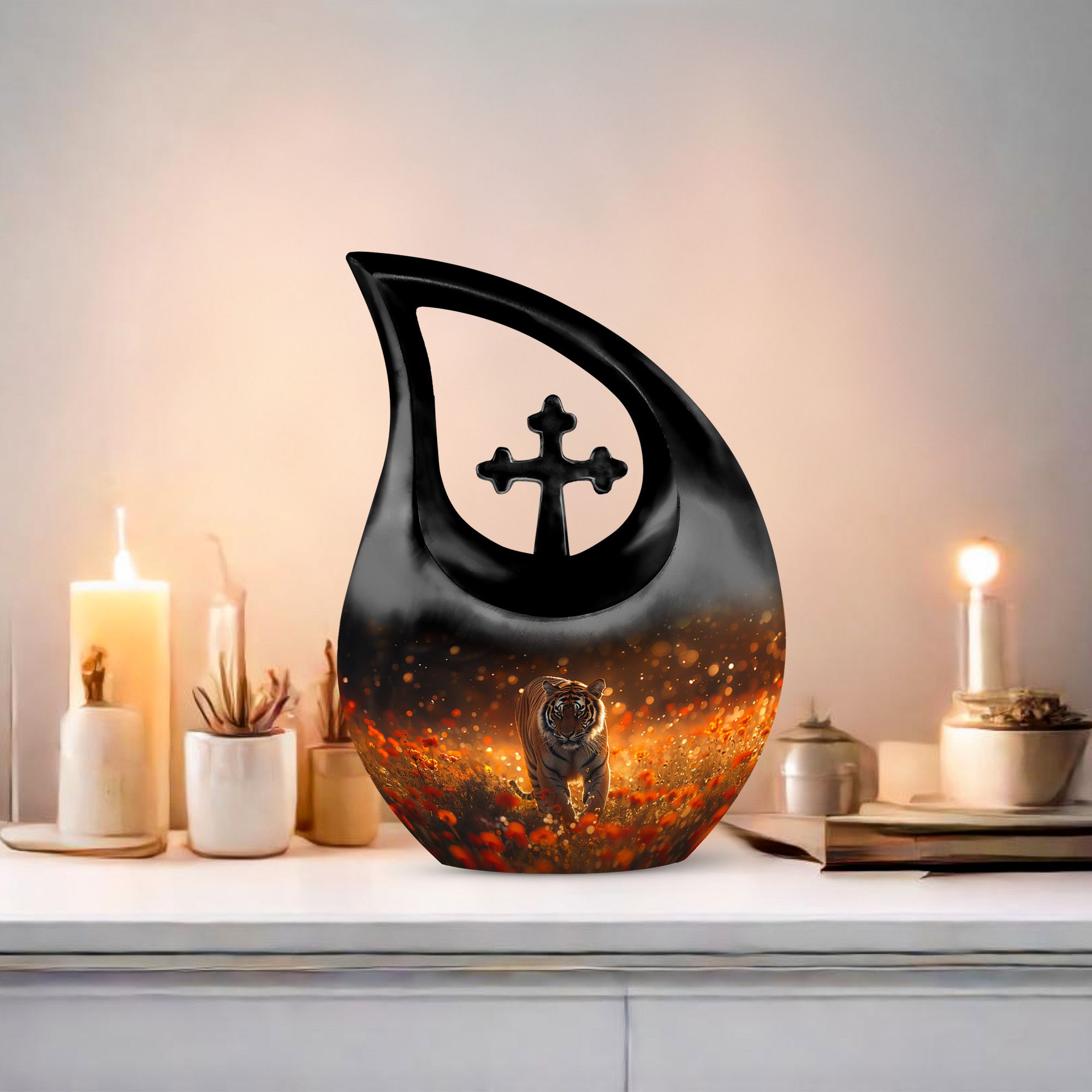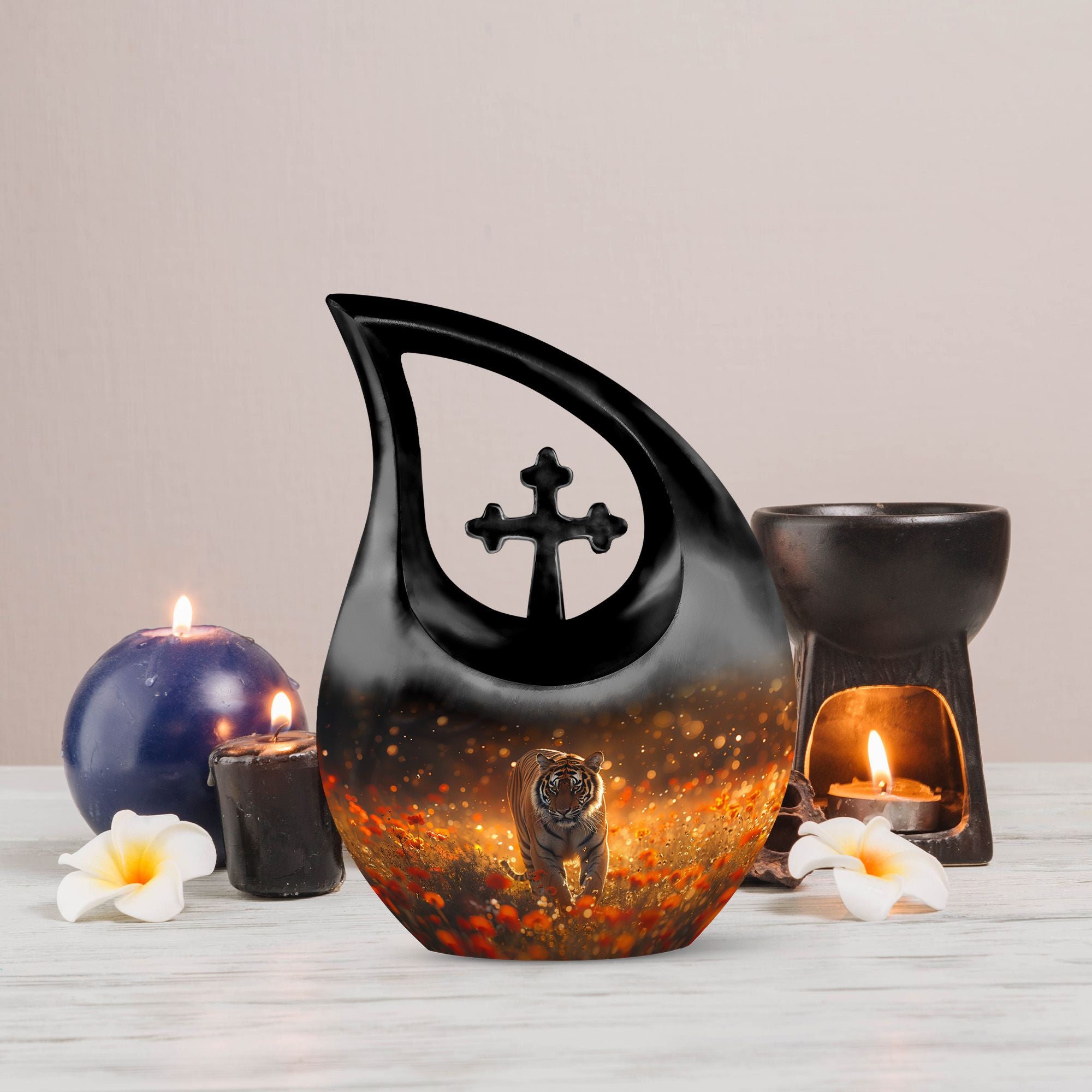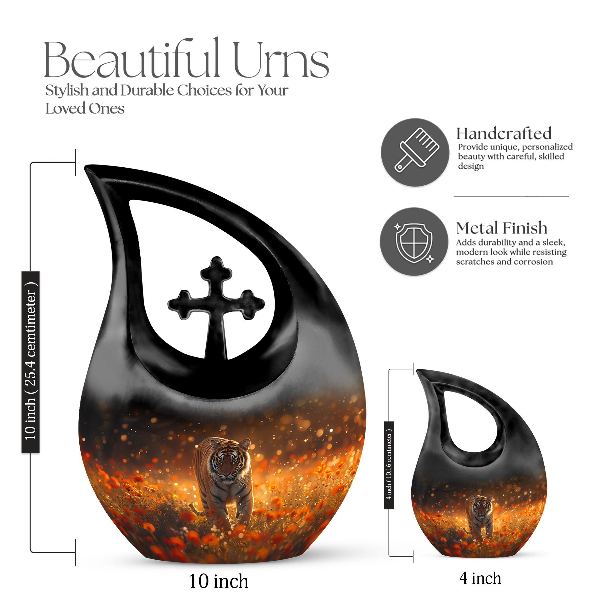 Discover a uniquely crafted Sunset Tiger Solace Urn that offers a dignified home for your loved one's ashes. This elegantly designed large urn is a part of our precious memorial urns collection. Standing at a size of 10 inches, the urn's material boasts high-quality aluminum for assured durability and longevity. It has a robust weight of 3.3 pounds, exhibiting its substantial quality. This urn vase for ashes presents an accommodating capacity of 200 cubic inches. The Sunset Tiger Solace Urn enchants with its Cross Drop theme, reflecting a symbol of faith and hope. The customization option enables you to personalize it with carefully engraved names, adding a more intimate touch to this memorial piece. The package also includes a velvet pouch which becomes a safe containment for the ashes. Opt for this unique urn, whether it's a medium urn or a custom-made urn for human ashes you're looking for, we guarantee pristine quality and heartfelt solace.