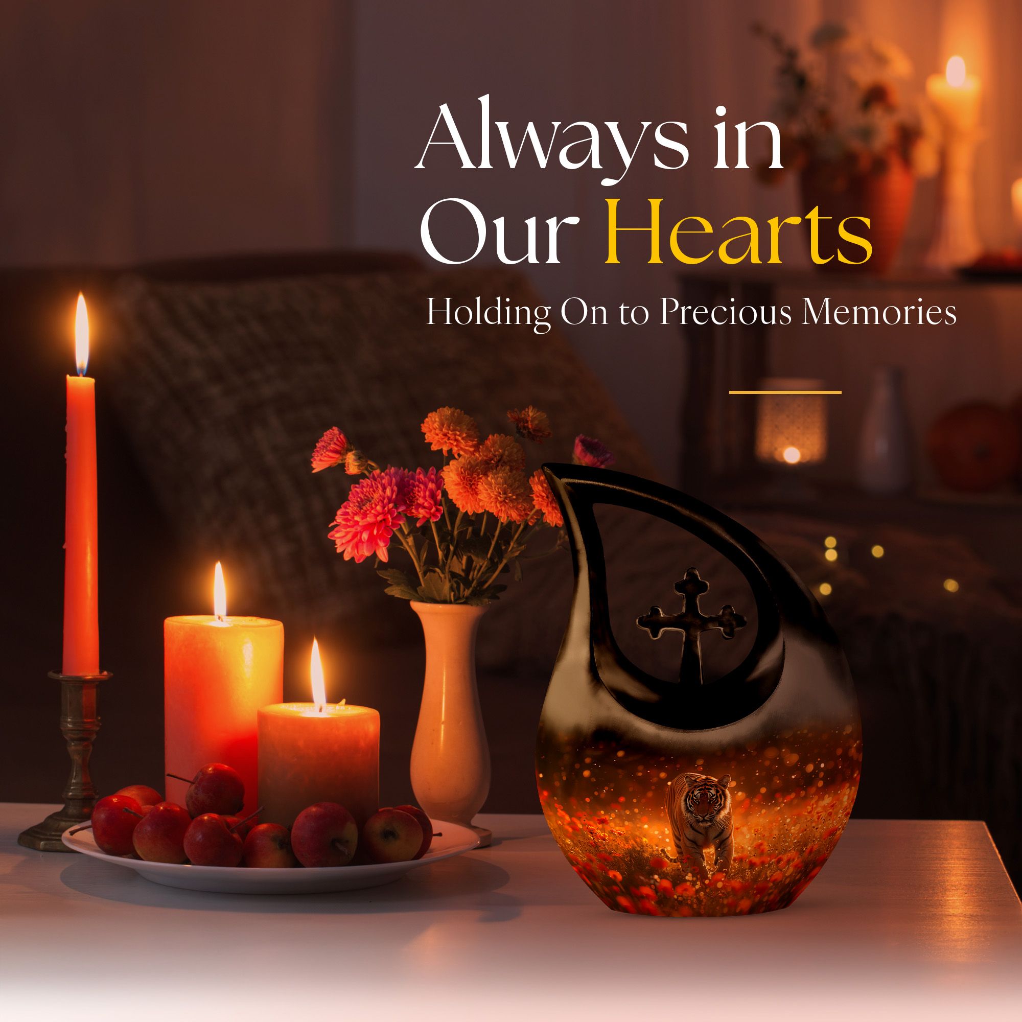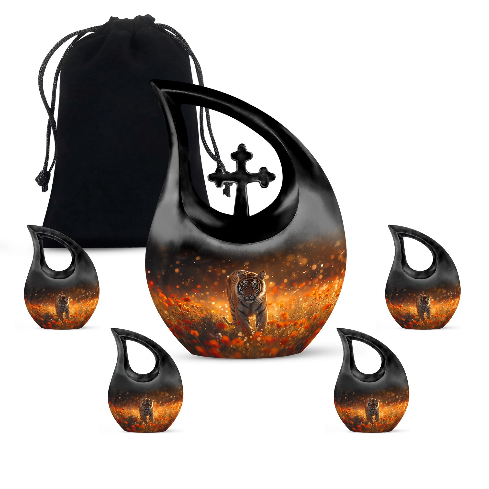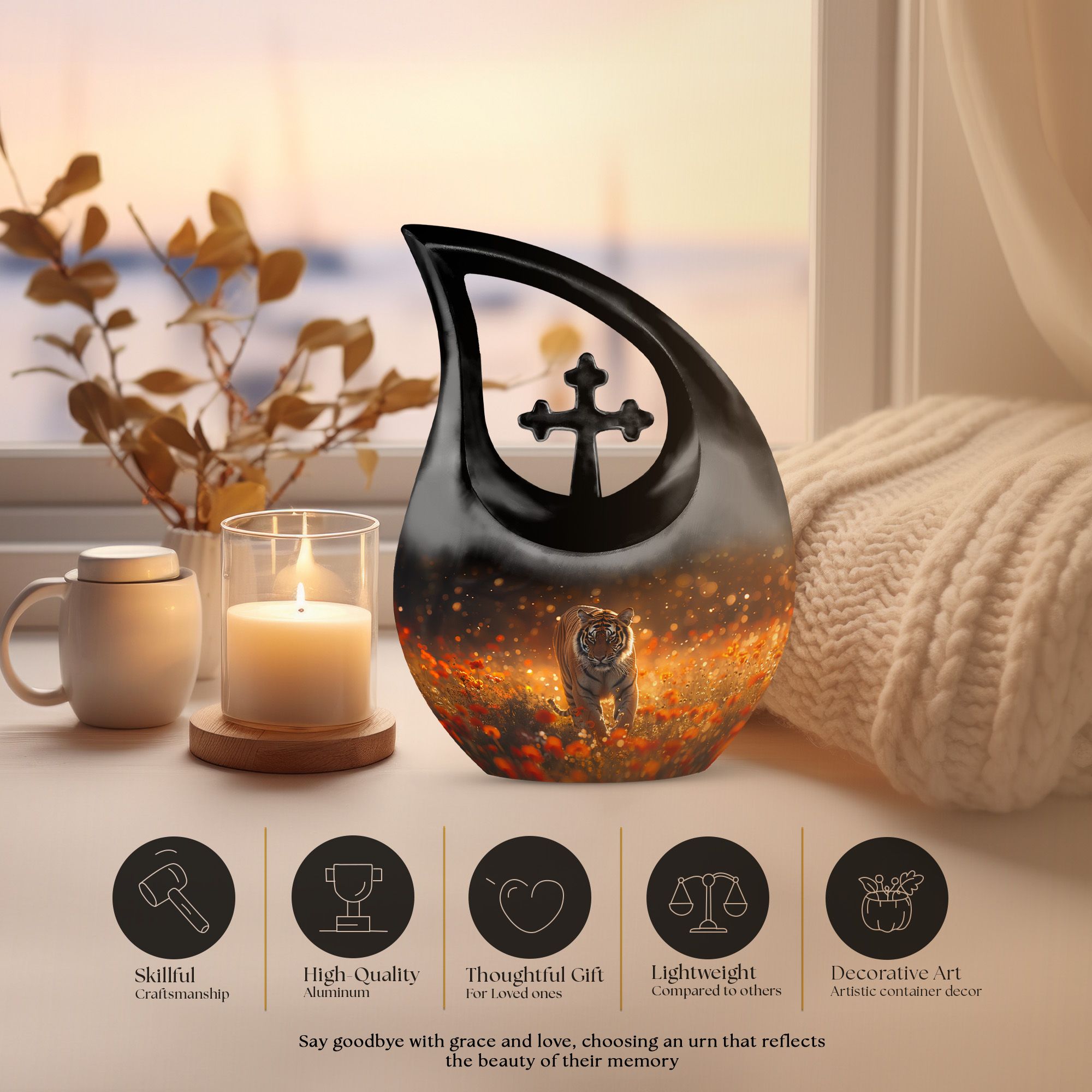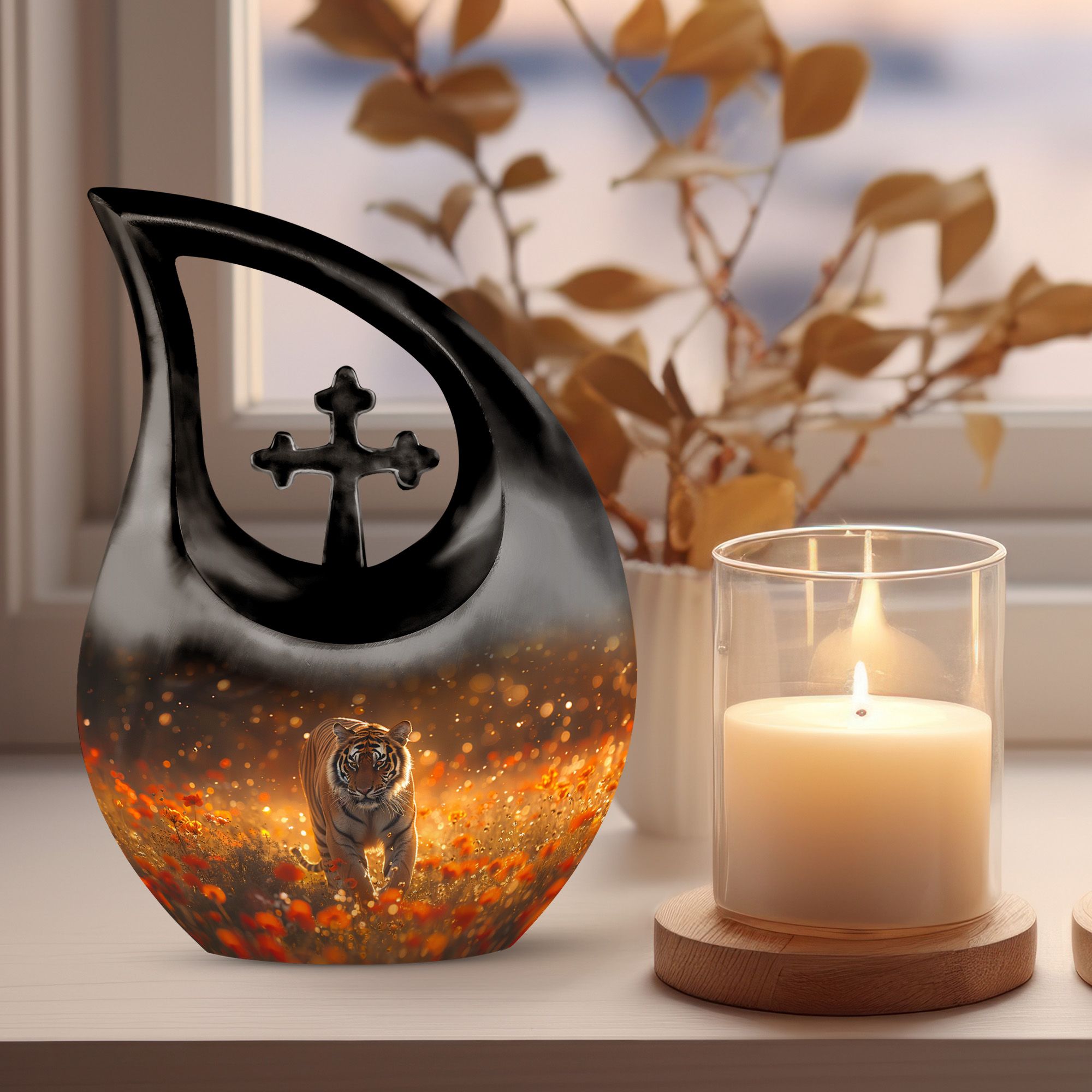 Discover a uniquely crafted Sunset Tiger Solace Urn that offers a dignified home for your loved one's ashes. This elegantly designed large urn is a part of our precious memorial urns collection. Standing at a size of 10 inches, the urn's material boasts high-quality aluminum for assured durability and longevity. It has a robust weight of 3.3 pounds, exhibiting its substantial quality. This urn vase for ashes presents an accommodating capacity of 200 cubic inches. The Sunset Tiger Solace Urn enchants with its Cross Drop theme, reflecting a symbol of faith and hope. The customization option enables you to personalize it with carefully engraved names, adding a more intimate touch to this memorial piece. The package also includes a velvet pouch which becomes a safe containment for the ashes. Opt for this unique urn, whether it's a medium urn or a custom-made urn for human ashes you're looking for, we guarantee pristine quality and heartfelt solace.