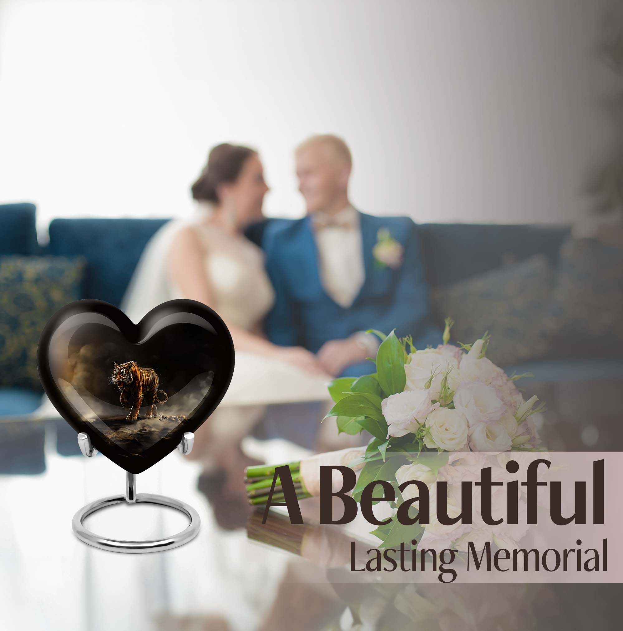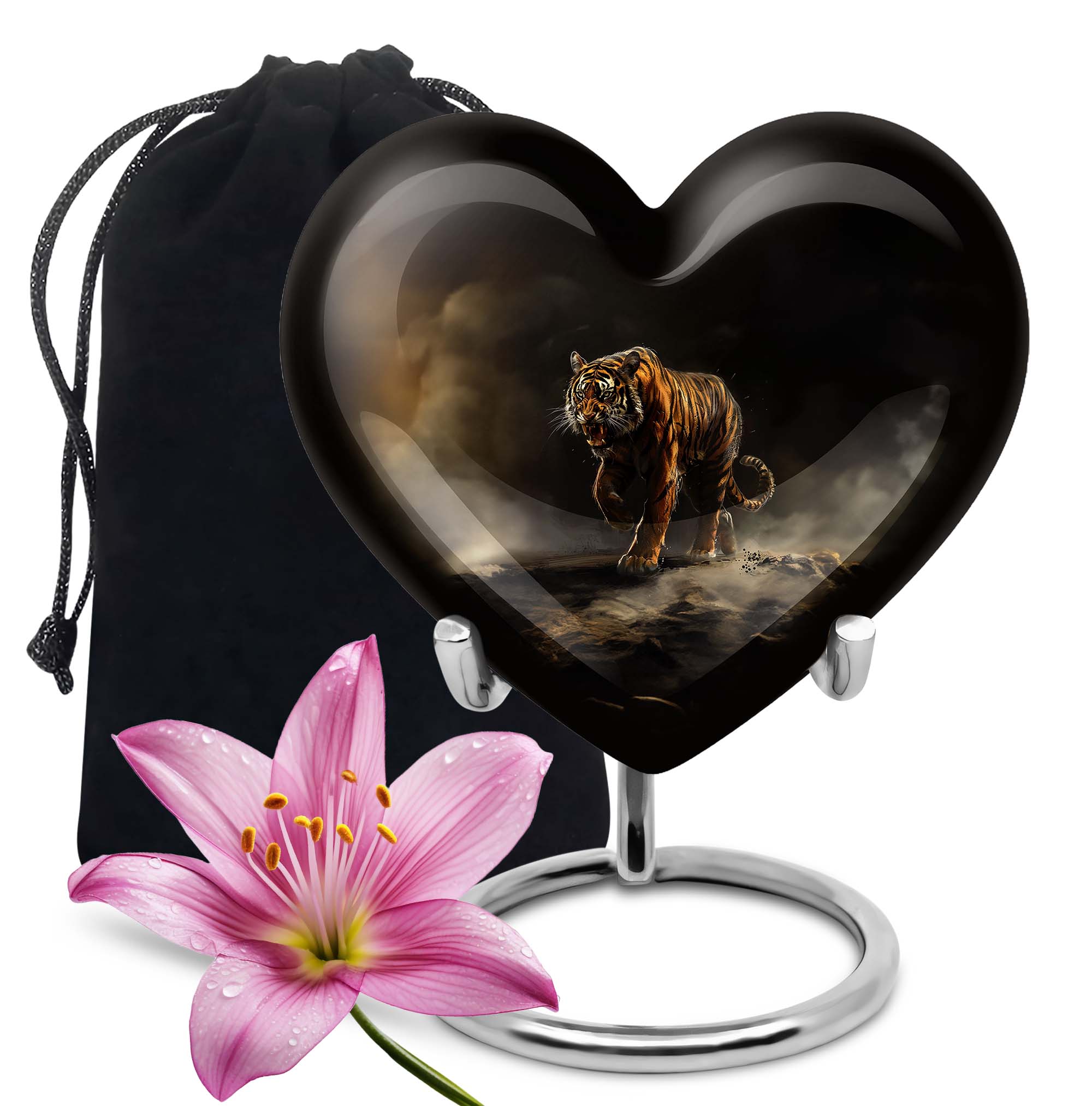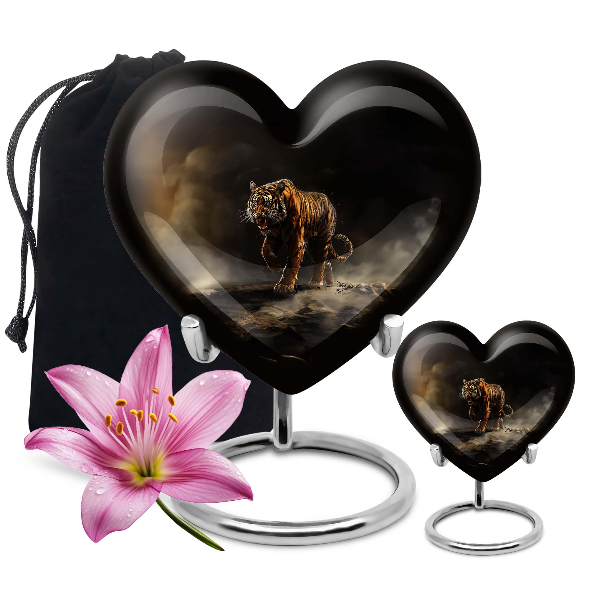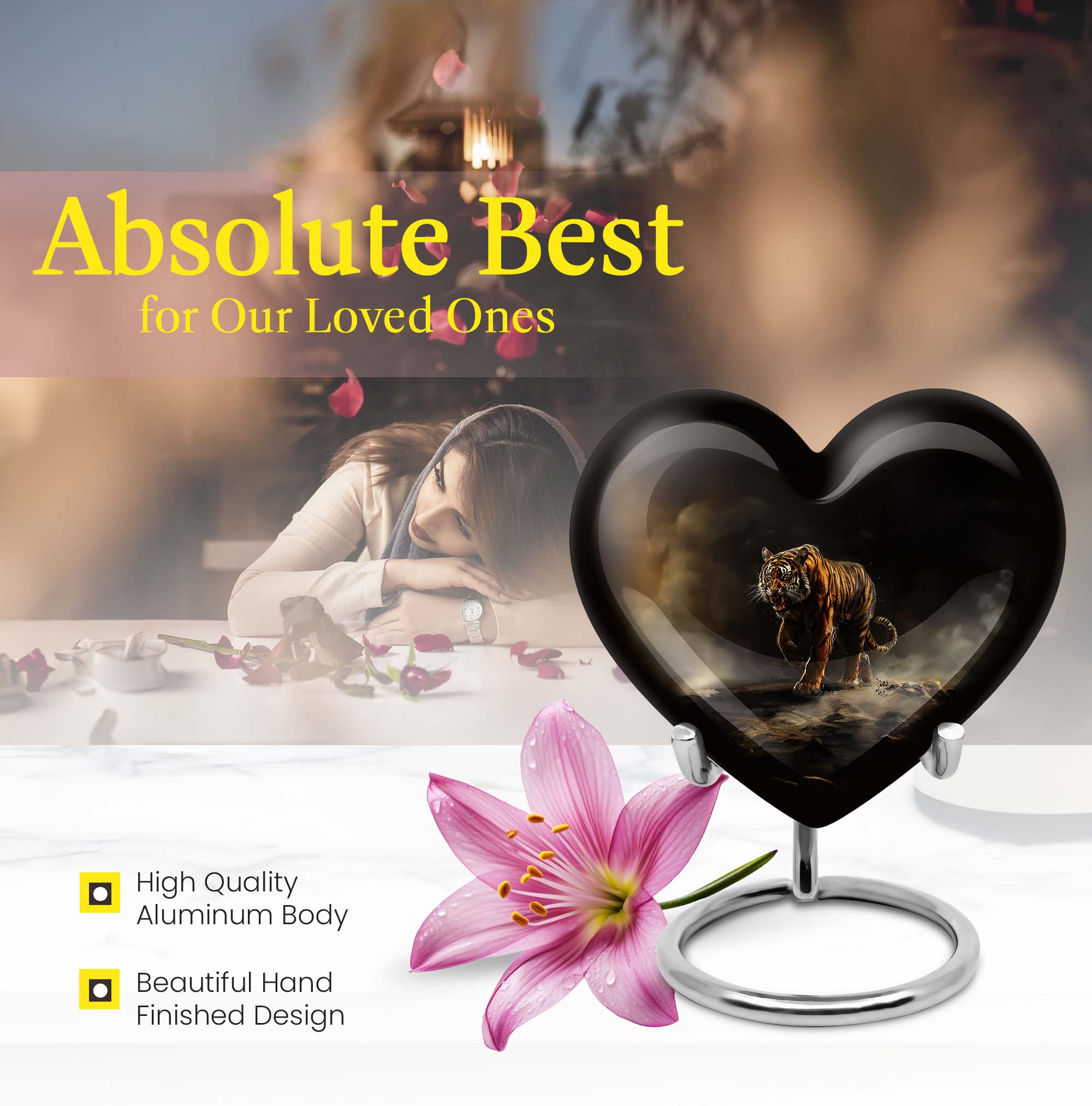 Bereaved loved ones can honor the memory of deceased family members with our exquisite tiger urn. This larger-than-life 10-inch funeral cremation urn is meticulously crafted from high-quality aluminium and designed for women. It stands out with its heart-shaped theme adorned with delicate flowers, which uniquely represents an eternal bond of love and tranquillity. The urn has a capacity of 200 cubic inches, making it ideal for accommodating adult ashes securely. Our package also includes a soft velvet pouch for safeguarding the contained ashes during transit. The urn boasts a lightweight design, weighing only 3.3 pounds, that makes it easy to move or transport, if necessary. To add a personal touch, buyers are offered the option to personalize the urn with engraved names. This urn serves as a poignant symbol of remembrance, providing a fitting resting place for your beloved. Our tiger urn is not just a funeral cremation urn, but rather a memorial urn that keeps your loved one close to you even after their passing. Kindly note that the keyword phrases for the urn include 'memorial urns' and 'memorial large urns for ashes'. Other relevant search terms include 'ash urn', 'urn shaped' and 'funeral urns for adult ashes'.