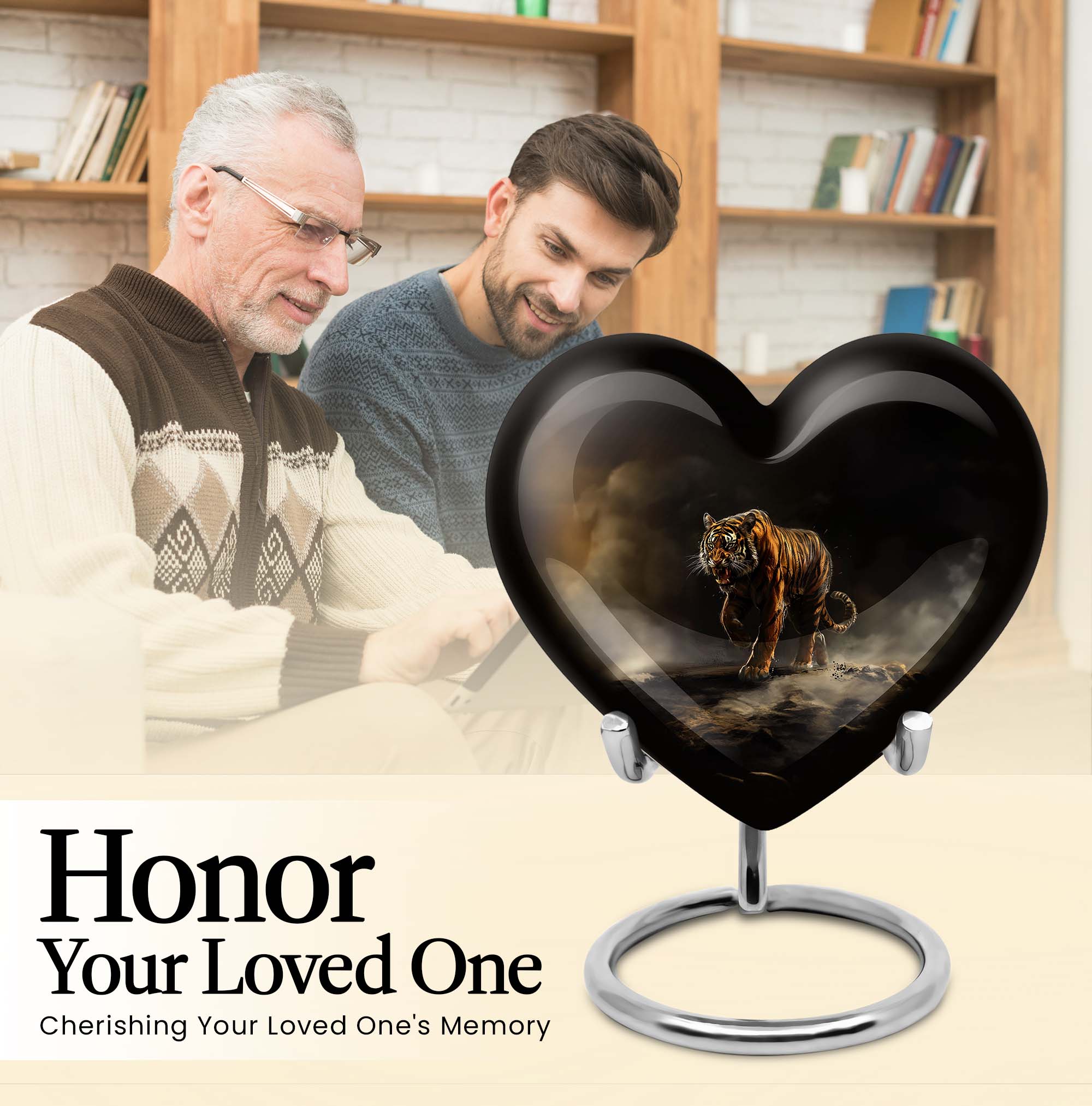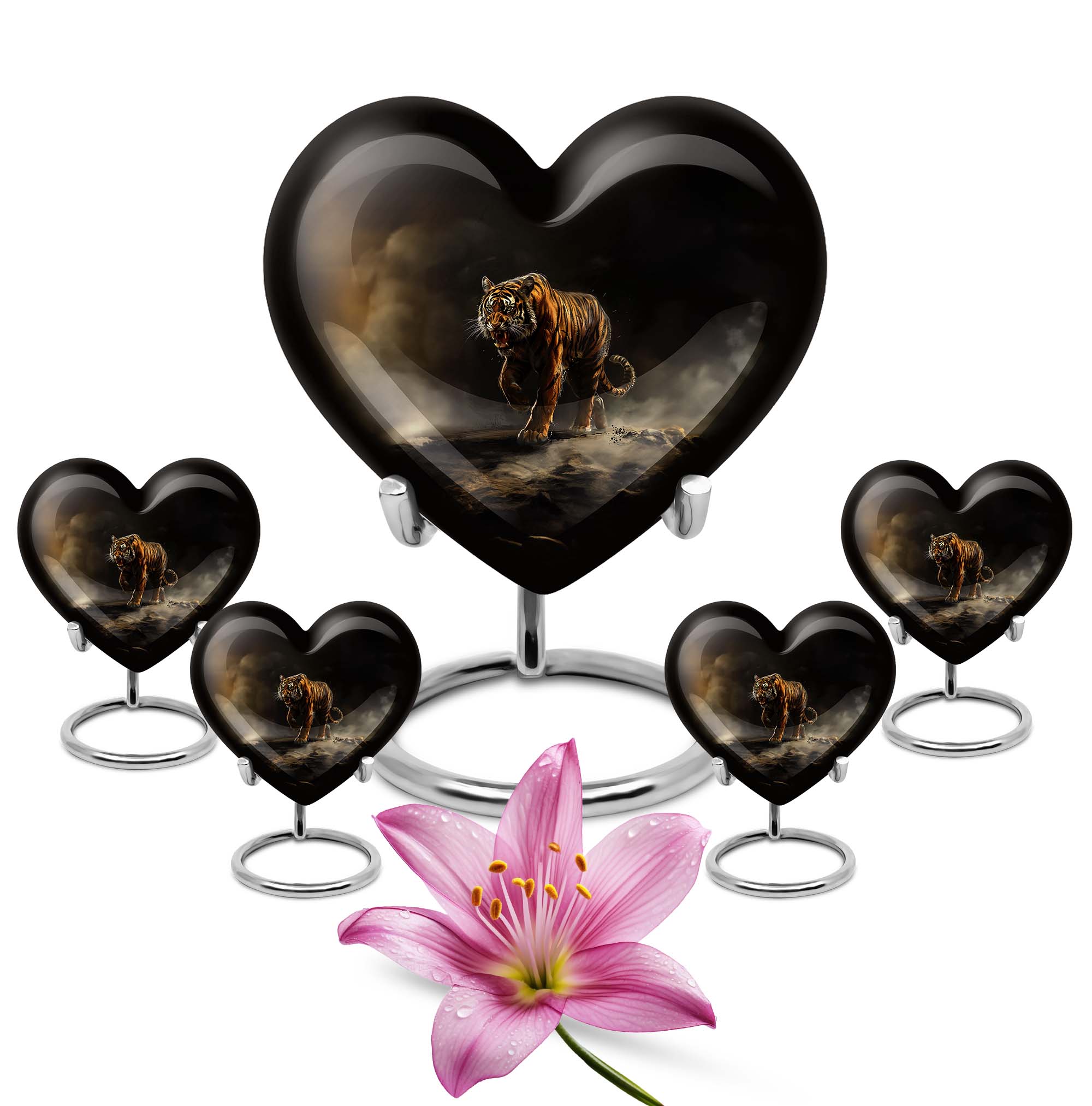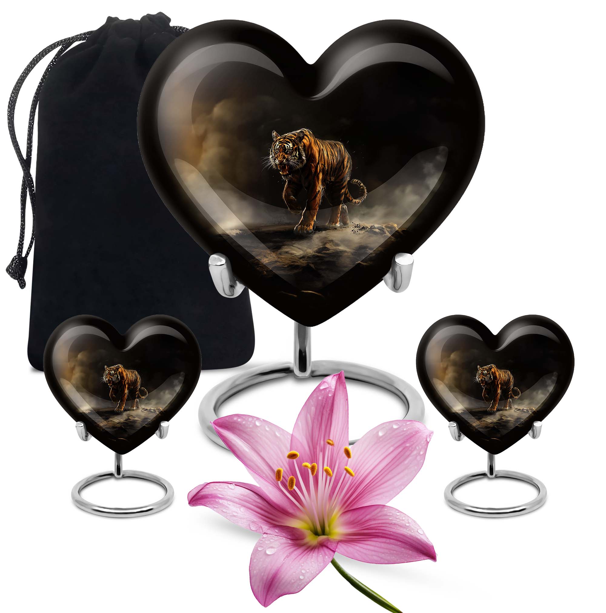 Bereaved loved ones can honor the memory of deceased family members with our exquisite tiger urn. This larger-than-life 10-inch funeral cremation urn is meticulously crafted from high-quality aluminium and designed for women. It stands out with its heart-shaped theme adorned with delicate flowers, which uniquely represents an eternal bond of love and tranquillity. The urn has a capacity of 200 cubic inches, making it ideal for accommodating adult ashes securely. Our package also includes a soft velvet pouch for safeguarding the contained ashes during transit. The urn boasts a lightweight design, weighing only 3.3 pounds, that makes it easy to move or transport, if necessary. To add a personal touch, buyers are offered the option to personalize the urn with engraved names. This urn serves as a poignant symbol of remembrance, providing a fitting resting place for your beloved. Our tiger urn is not just a funeral cremation urn, but rather a memorial urn that keeps your loved one close to you even after their passing. Kindly note that the keyword phrases for the urn include 'memorial urns' and 'memorial large urns for ashes'. Other relevant search terms include 'ash urn', 'urn shaped' and 'funeral urns for adult ashes'.