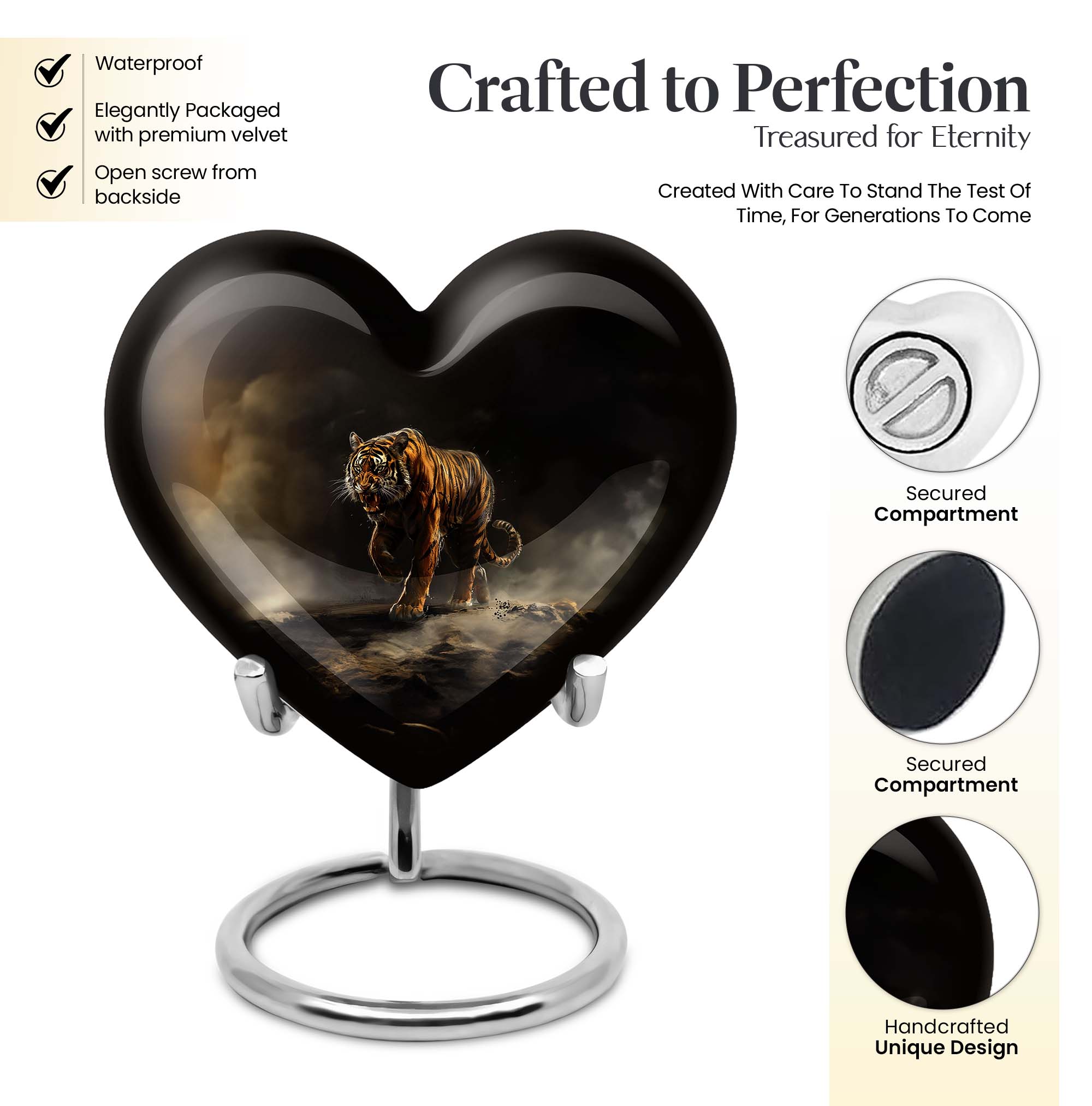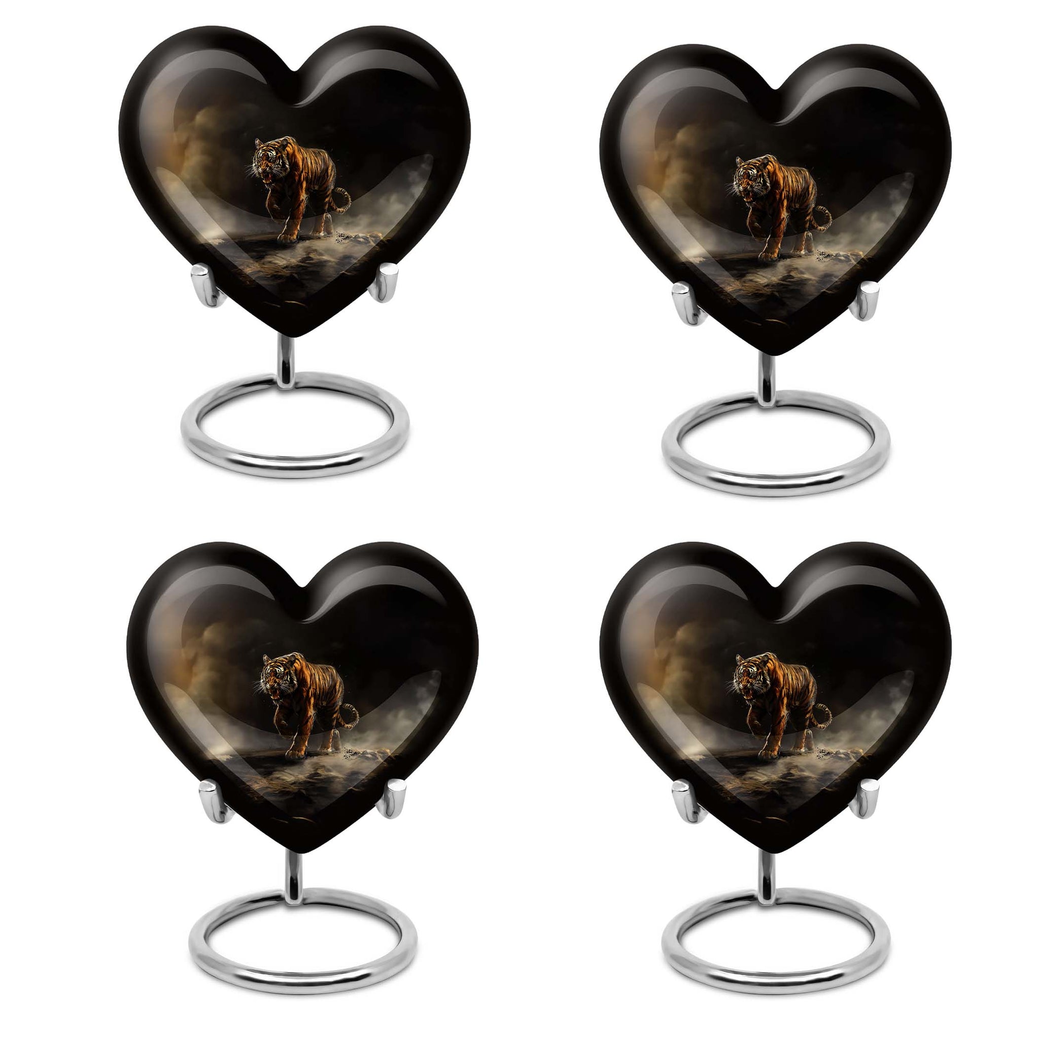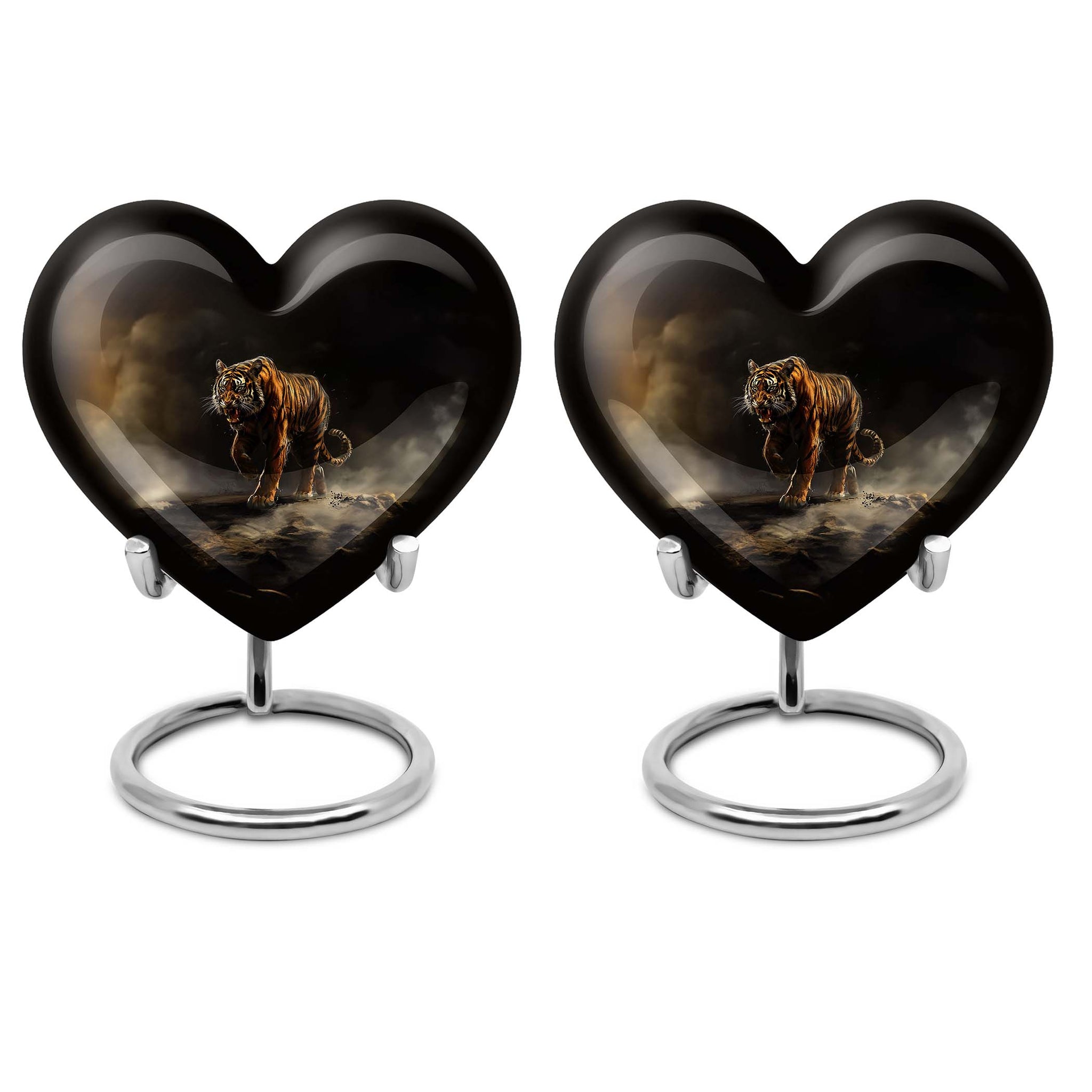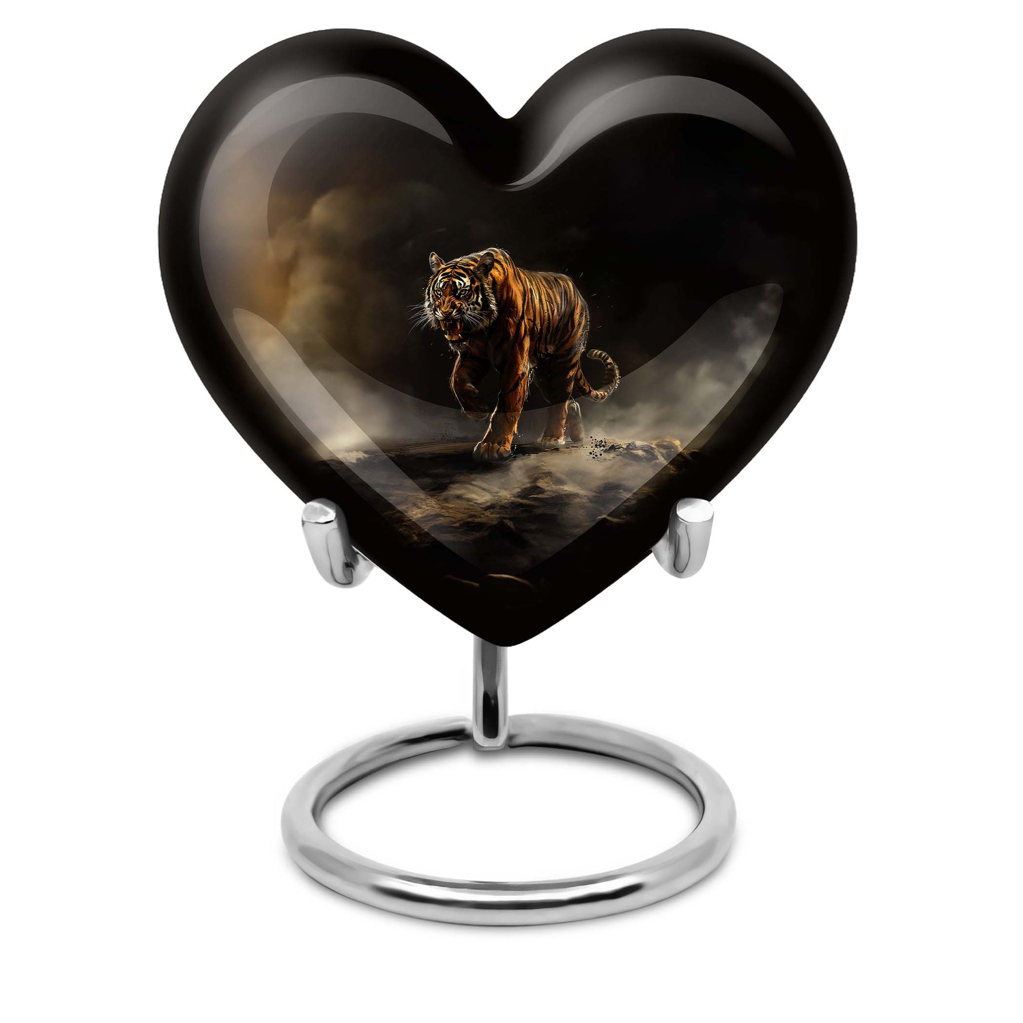 Bereaved loved ones can honor the memory of deceased family members with our exquisite tiger urn. This larger-than-life 10-inch funeral cremation urn is meticulously crafted from high-quality aluminium and designed for women. It stands out with its heart-shaped theme adorned with delicate flowers, which uniquely represents an eternal bond of love and tranquillity. The urn has a capacity of 200 cubic inches, making it ideal for accommodating adult ashes securely. Our package also includes a soft velvet pouch for safeguarding the contained ashes during transit. The urn boasts a lightweight design, weighing only 3.3 pounds, that makes it easy to move or transport, if necessary. To add a personal touch, buyers are offered the option to personalize the urn with engraved names. This urn serves as a poignant symbol of remembrance, providing a fitting resting place for your beloved. Our tiger urn is not just a funeral cremation urn, but rather a memorial urn that keeps your loved one close to you even after their passing. Kindly note that the keyword phrases for the urn include 'memorial urns' and 'memorial large urns for ashes'. Other relevant search terms include 'ash urn', 'urn shaped' and 'funeral urns for adult ashes'.