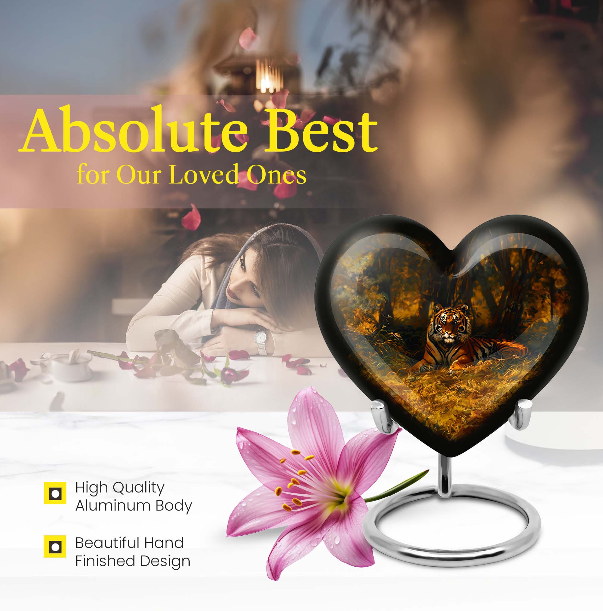 Uplift your spirit with our captivating Tiger Heart Urn, a striking dedication to commemorate the life of your cherished ones. Designed in a beautifully sleek 10-inch size, this exquisite item stands out with its floral theme and large, 200 cubic inch capacity—making it a prime selection for adults. This urn is crafted from durable aluminium, featuring a solid weight of 3.3 pounds that signify its robustness. Our memorial urn captures the essence of life, allowing you to personalize it further with engraved names, creating an everlasting symbol of respect, love, and honor. Apart from the ornate urn itself, the package encompasses a velvet pouch for a dignified containment of ashes. Whether you need funeral urns for human ashes or cremation urns, this urn encapsulates a world of emotions in a single artefact. Please note, the unique design of our urn disregards normative 'shaped jar' structures, confessing an original appeal. Remember your loved ones in a respectful and elegant way with our Tiger Heart Urn.