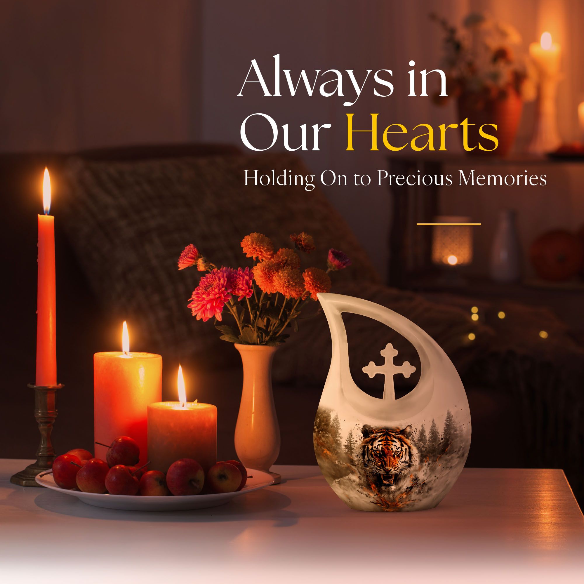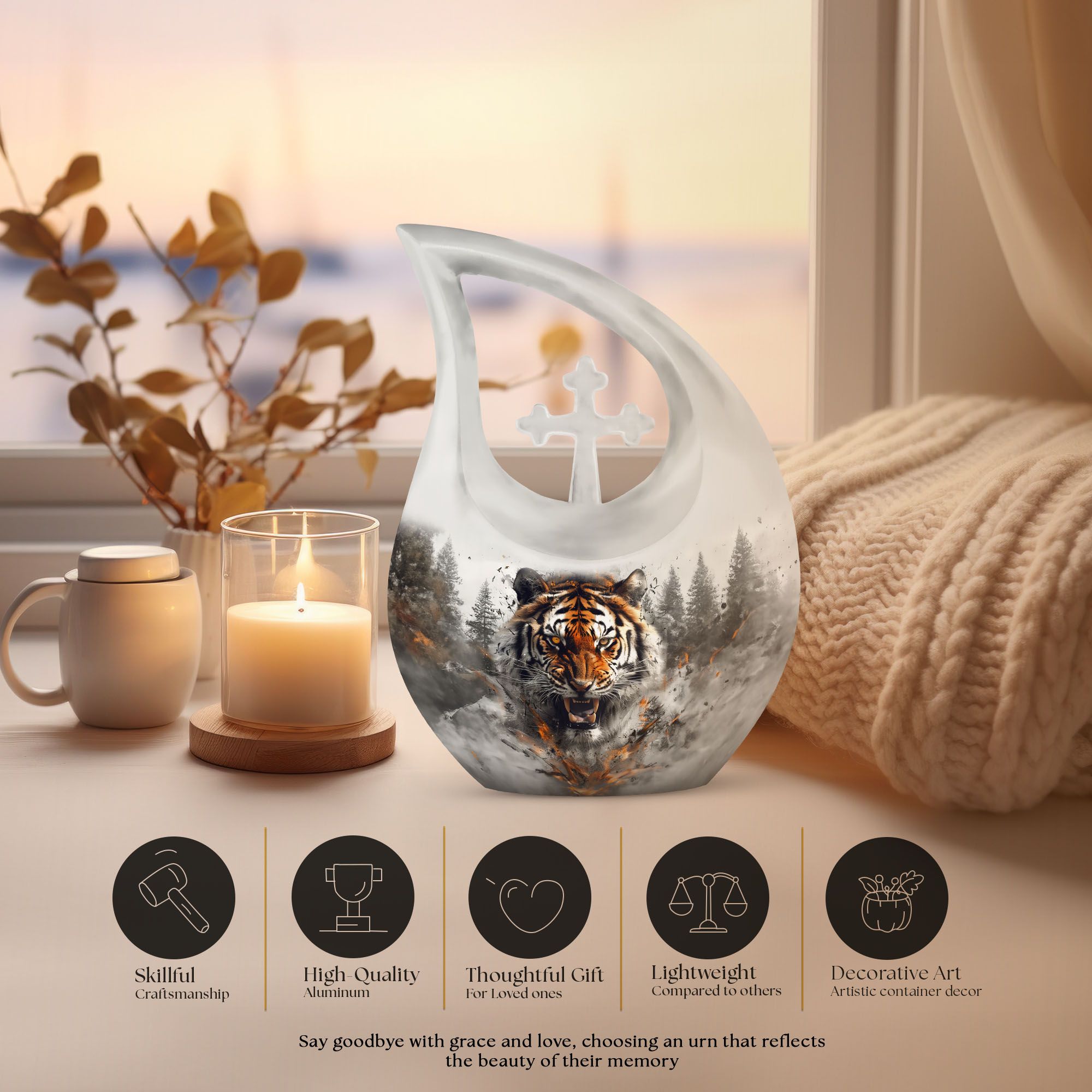 Let this Tiger Urn work as a vessel to cherish the memories of your loved ones. Our elegantly designed Cross Drop 10-inch Cremation Container fuses sentiment with timeless style. Crafted from durable Aluminium, it weighs around 3.3 pounds, ensuring longevity and preserving the sanctity of memorial urns. With a capacity of 200 cubic inches, it is adequately sized for large urns or a smaller, more intimate containment. Each urn comes with a soft velvet pouch, providing a dignified enclosure for the ashes. Add a personal touch with our customization options – you can engrave names of your cherished ones, enhancing the remembrance. Intended for those in search of urn for dad or large urns for ashes, this tiger-themed urn blends the ritualistic need with a tasteful aesthetic. Discover the quiet grace of our Tiger Urn as it stands testament to the love you carry.