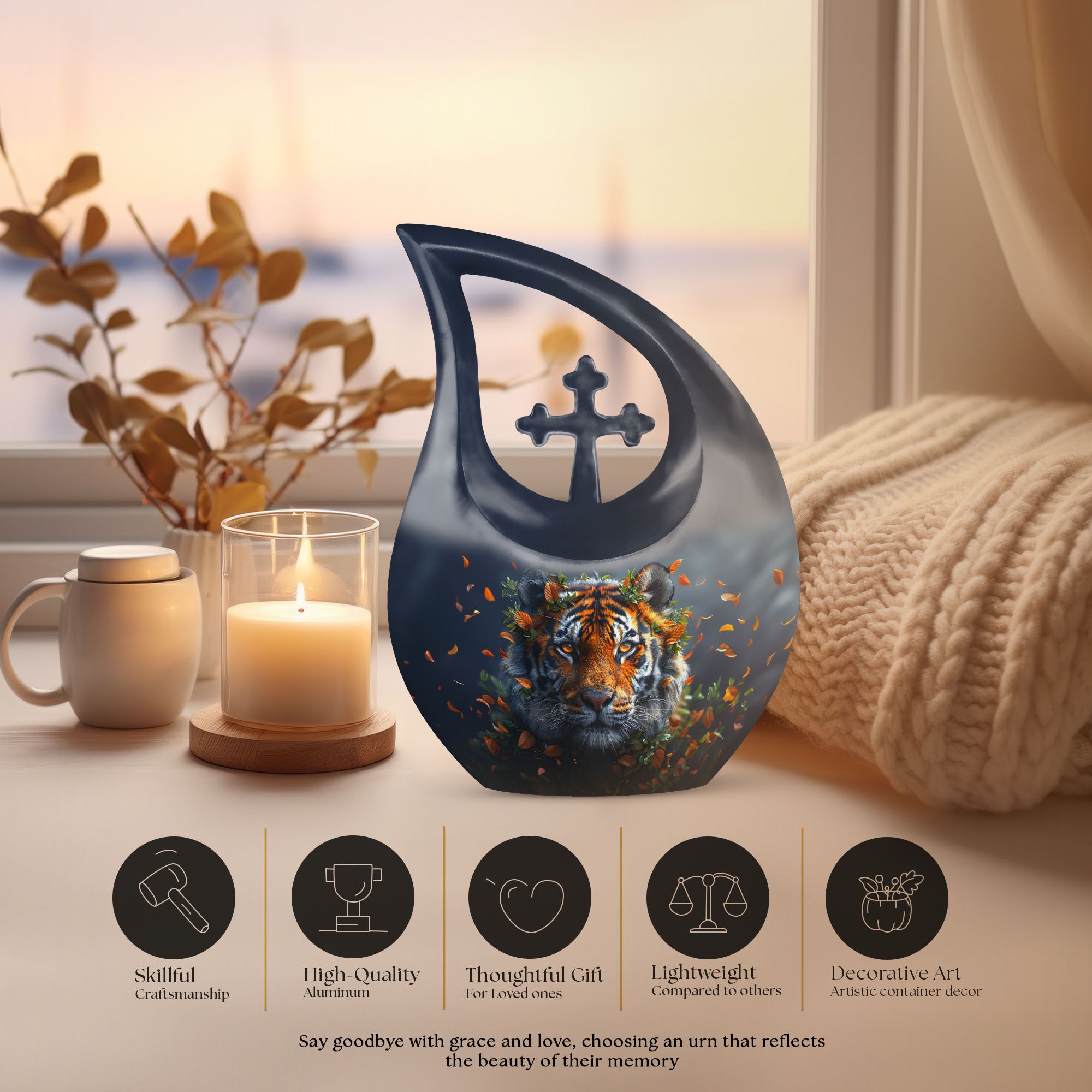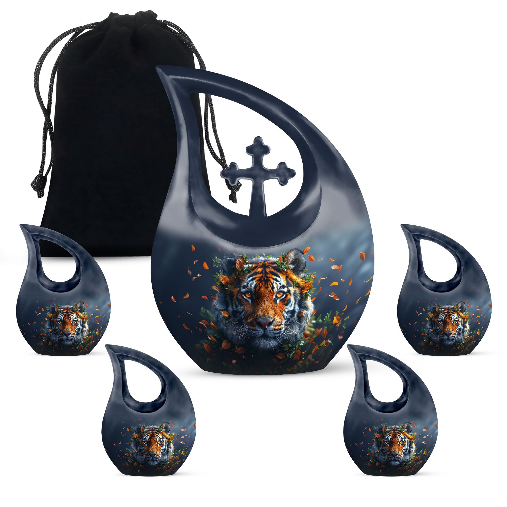 Chart the final journey of your loved ones in a fitting way with our tiger-themed 'Tiger Urn', an exquisitely crafted masterpiece in the 'Companion Urns For Adults' category. This large urn, standing at 10 inches, is an embodiment of skillful artistry and the finest quality Aluminium. It is meticulously crafted to hold 200 cubic inches of ashes, making it a fitting tribute to your dearly departed. The unique 'Cross Drop' urn design honors a resilient spirit, encouraging us to forge ahead with strength in our hearts. Furthermore, incorporating 'memorial urns' to evoke respect and celebrate the life lived. Each package comes with a velvet pouch for secure containment of ashes. Personalize this magnificent resting place with engraved names of the deceased, crafting your mark of respect and undying love. This urn is a considerate choice for those seeking 'Box Urns For Human Ashes', 'Urn For Dad', 'Cremation Containers', or 'Unique Urns For Dad'. Our Tiger Urn evokes a sense of peace and respect, ensuring your loved ones are remembered and honored accordingly.