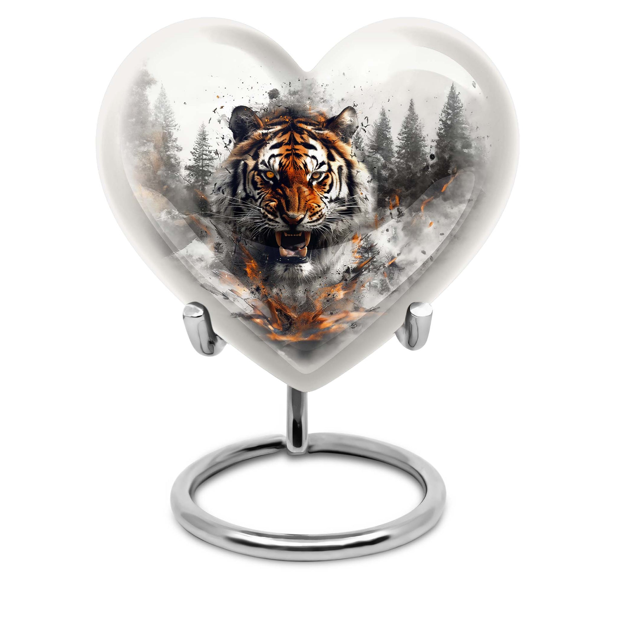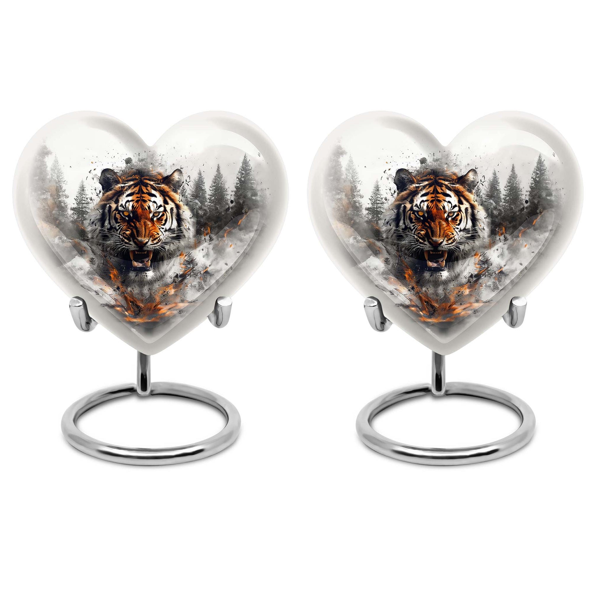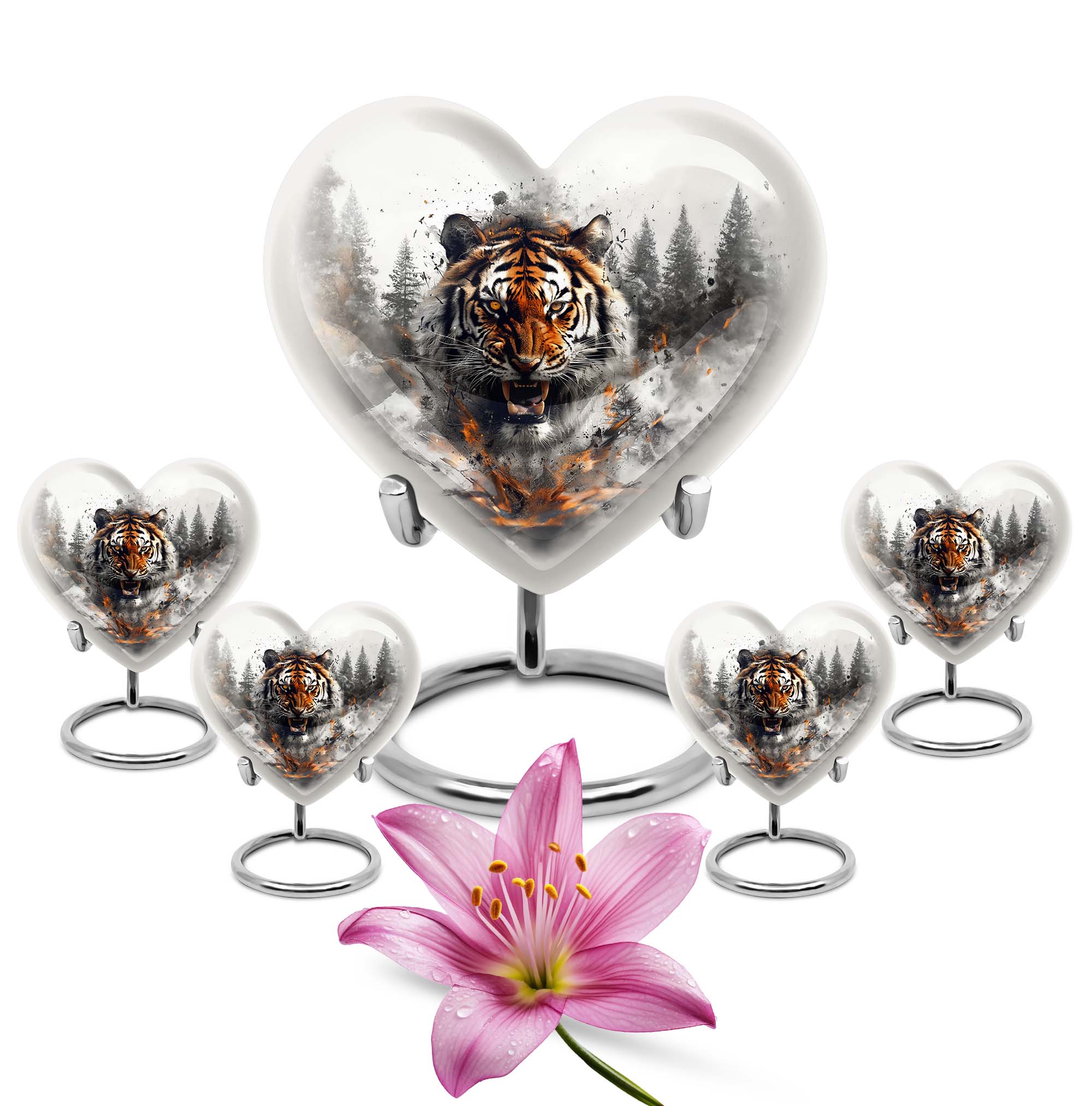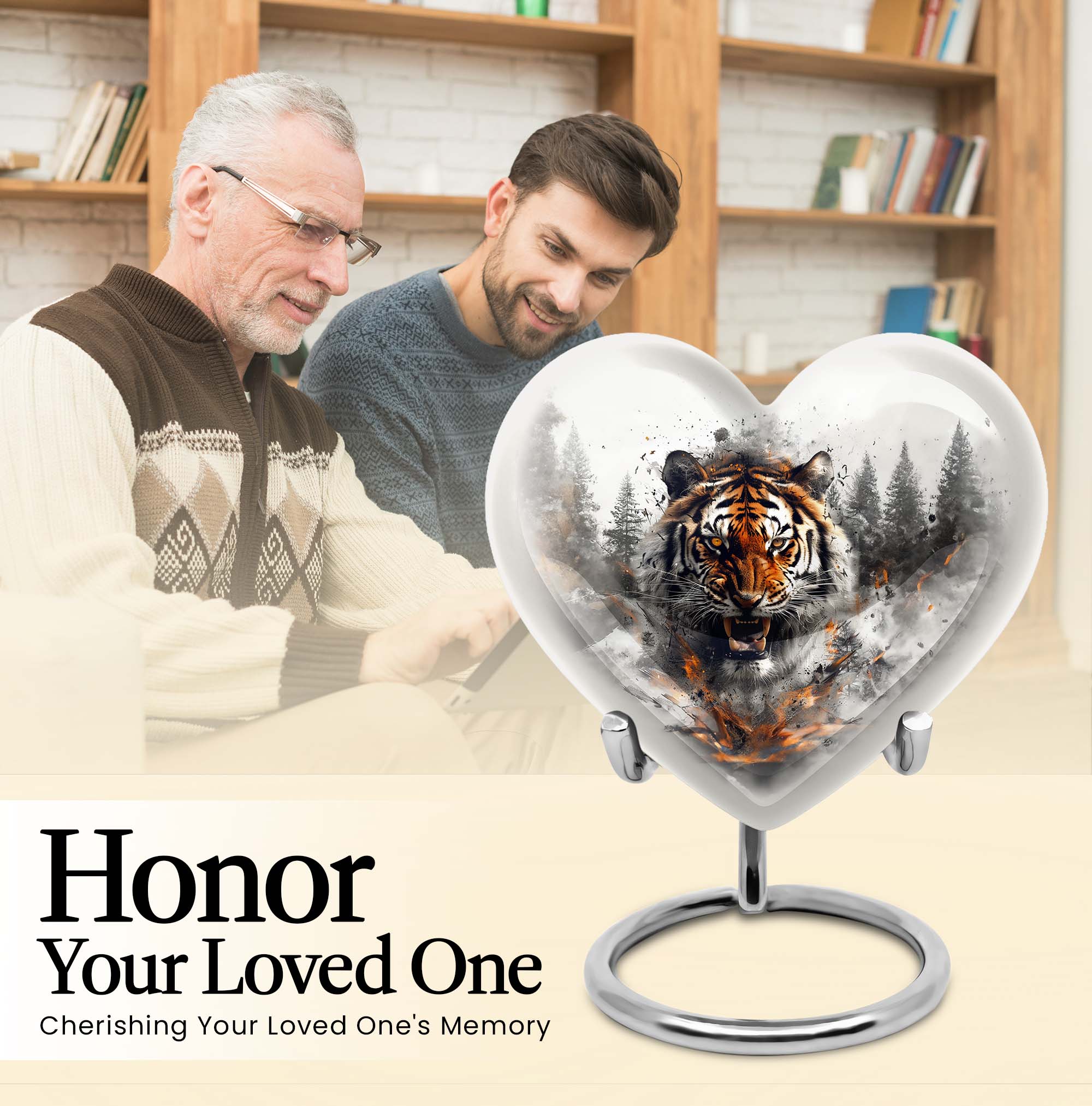 Experience the serenity and peace of this remarkable 10-Inch Tiger Urn, an elegant resting place for your loved ones. This cremation urn has a unique Heart Urn design, beautifully adorned with a floral theme, emanating a sense of tranquility and comfort. Crafted meticulously from high-grade Aluminium that is durable and sophisticated, this funeral urn has the capacity to contain 200 cubic inches of ashes, ensuring your dear one gets a fitting space. With a weight of 3.3 pounds and a height of 10 inches, this Large Urn is an appropriate size for a dignified tribute. The urn comes packed in a soft velvet pouch, providing safety and respect for the cremation ashes. Personalize it with engraved names for a thoughtful touch. This urn is ideal for adult man or female use. The Tiger Urn, one of our Innovative Modern Urns for Human Ashes, embodies our commitment to offering respectful, high-quality urns for cremation ashes.