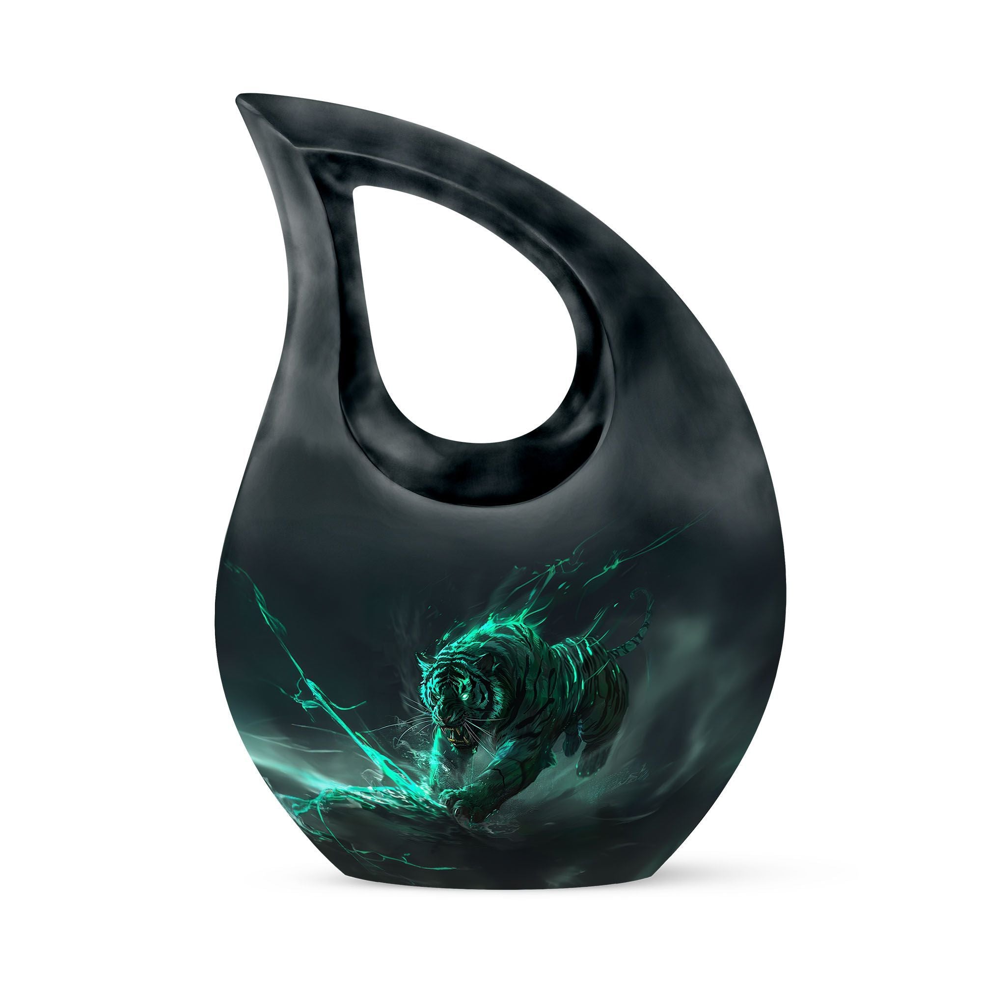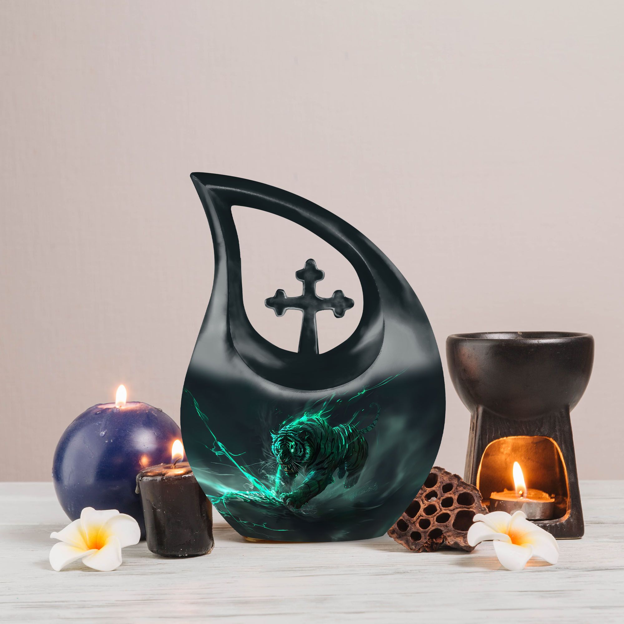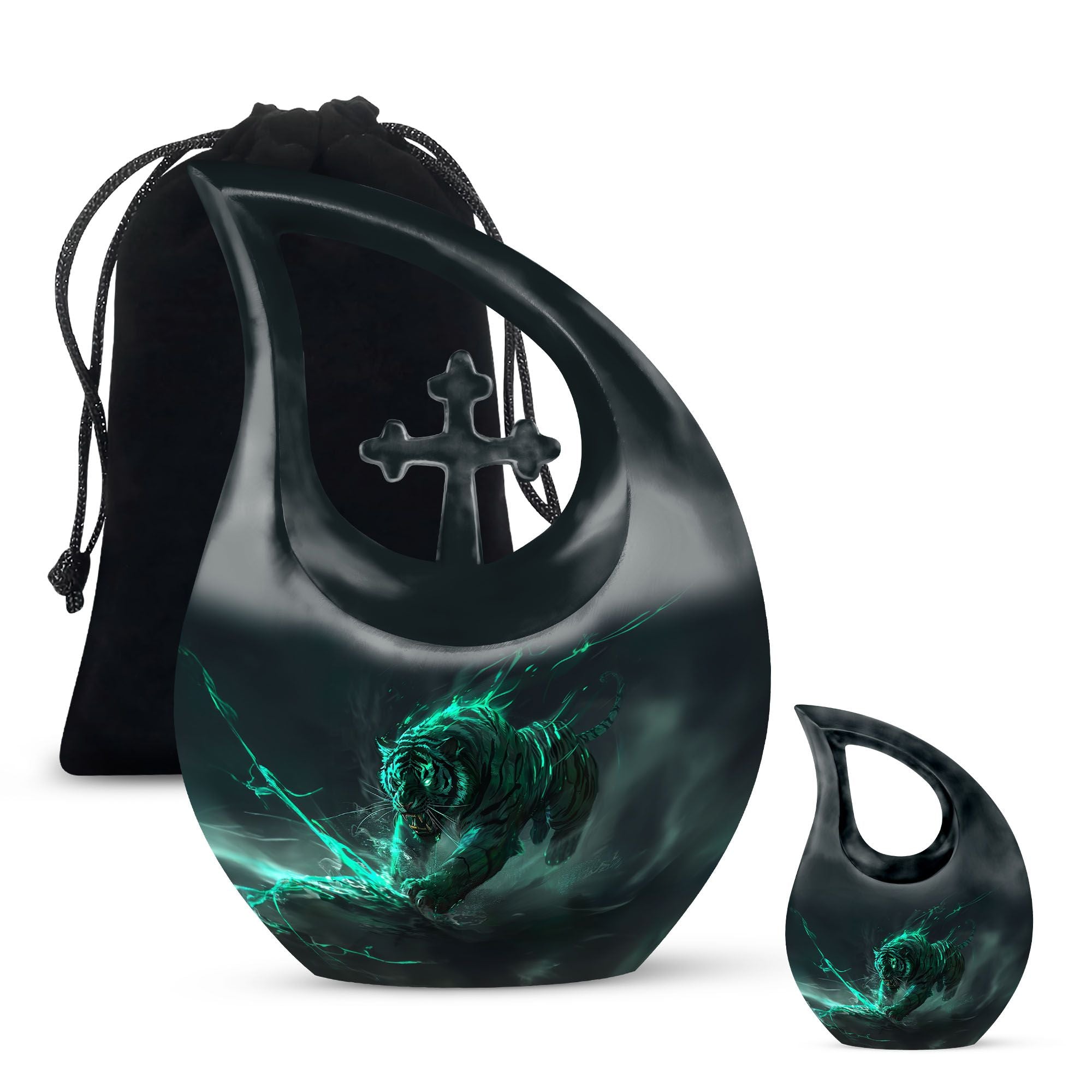 Honor a beloved dad with our exquisite Tiger urn, a uniquely designed memorial urn for the keepsake of your cherished one's ashes. This large urn is meticulously crafted from high-quality aluminum, ensuring sturdy, durable containment designed to last. Measuring 10 inches in height and weighing 3.3 pounds, this urn provides a capacity of 200 cubic inches; perfectly suitable for adults and seniors. The package comes with a delicate velvet pouch to securely house the ashes inside the urn. Special attention has been paid to the theme of the urn, depicting a compelling Tiger symbol, adding an emotional, symbolic touch. The urn allows for personalization, offering you the opportunity to engrave the names of your loved one. Our Cross Drop urn stands apart from conventional cremation containers, miniature urns, box urns for human ashes and small urns, offering a unique tribute to the life lived. Please note the urn design does not accommodate a 'Cross Drop' feature.