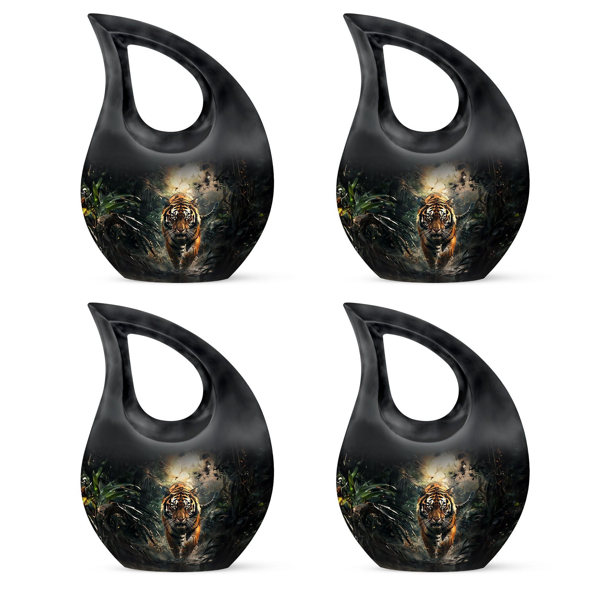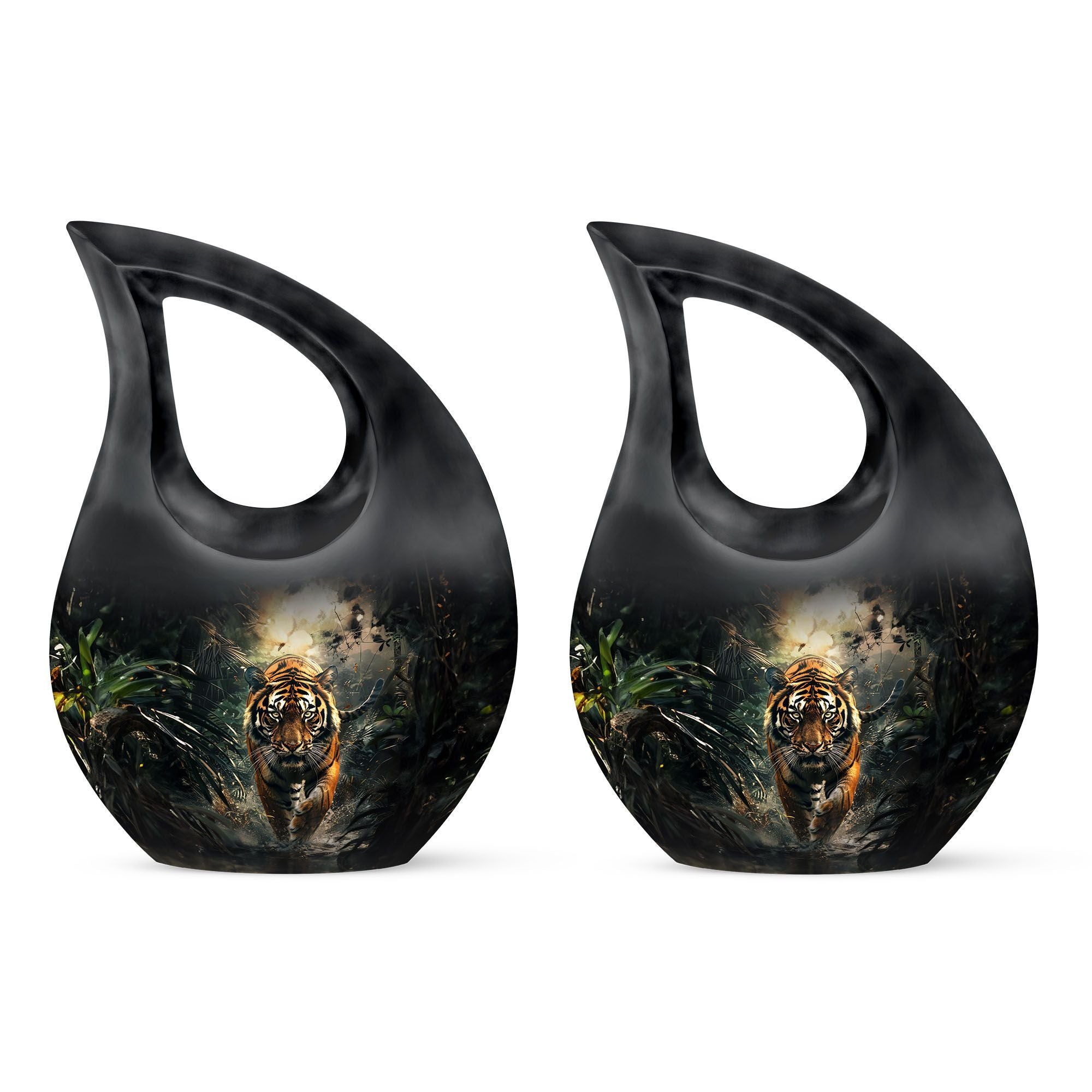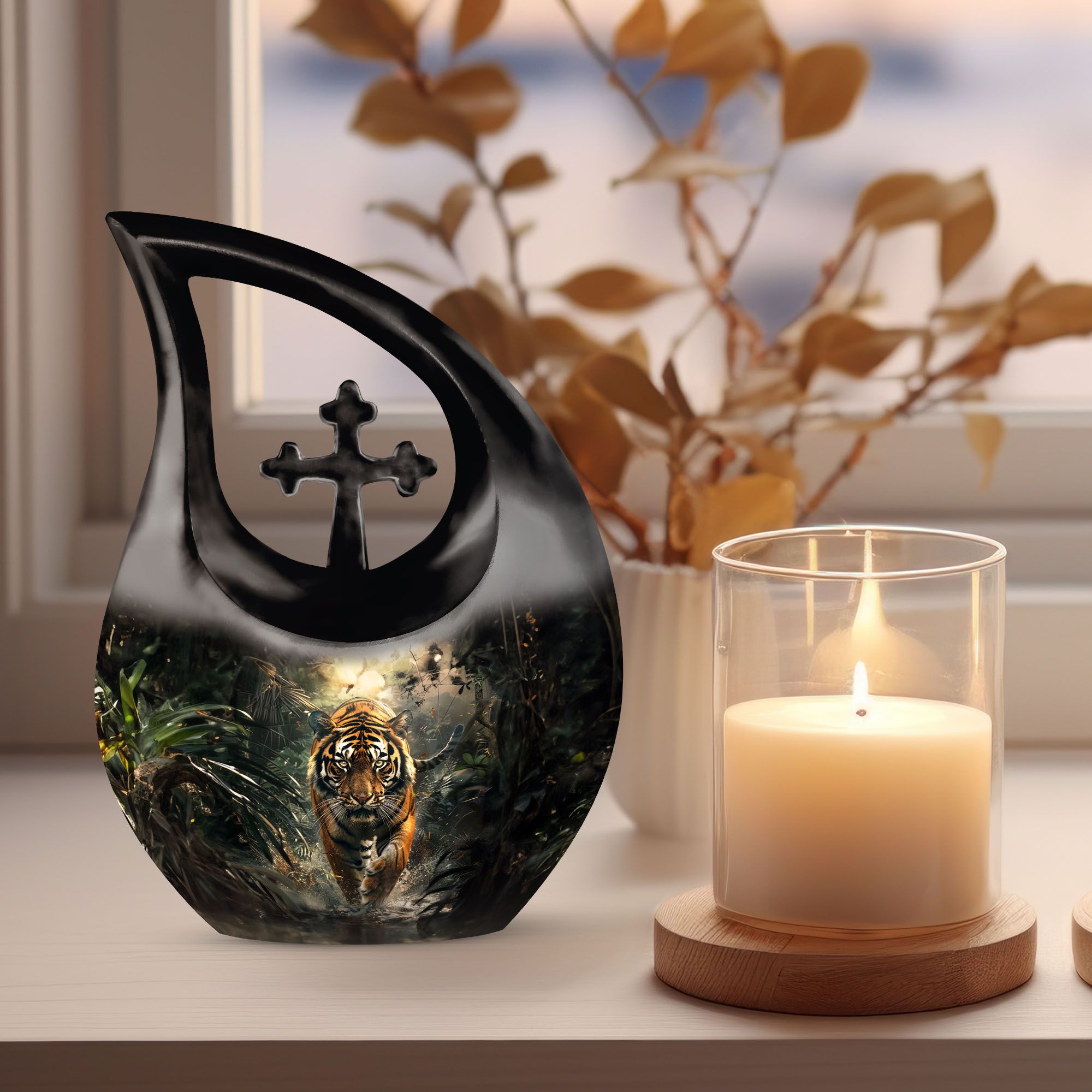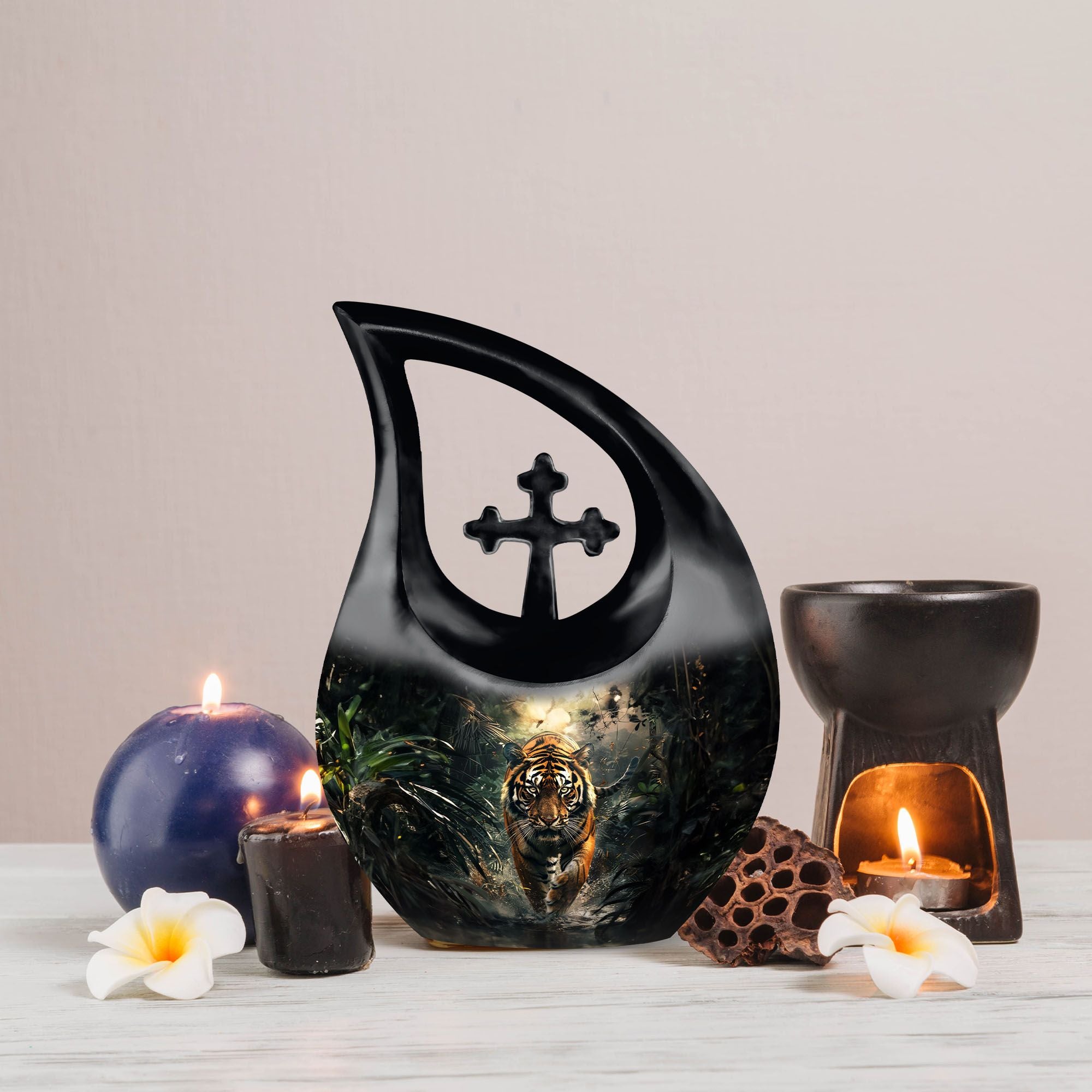 Immerse yourself in the gentle reminder of your loved one's presence with our Large Tiger Themed Urn, with a unique cross drop design that transcends commonality. This artisan-crafted memorial urn is designed to hold 200 cubic inches of memories, carrying an impressive weight of 3.3 pounds. The masterfully dimensioned, 10-inch height pays homage to the grandeur and strength of your beloved. Made with high-quality aluminium, it ensures long-lasting durability and care. We offer customization options to make this resting place even more remarkable by engraving names, pushing our product beyond the usual 'urns for men's ashes', toward something deeply personal. The urn comes packaged with a velvet pouch, providing a secure and respectful containment for the ashes. We've thoughtfully combined tradition with a touch of contemporary aesthetics, creating more than just 'companion urns' or 'cool urns' – rather, we offer a dedication to respect and timeless memories.