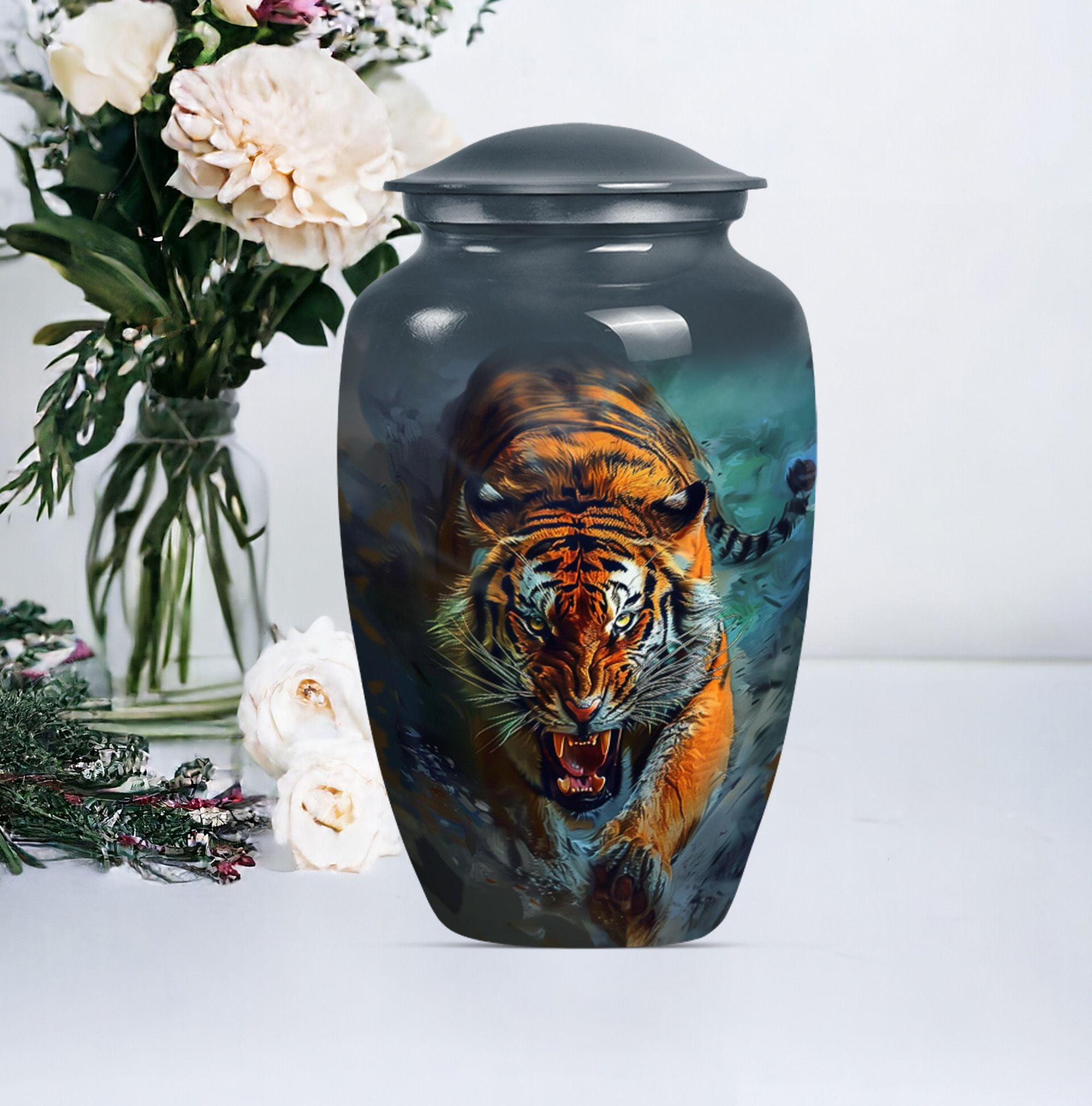 Presenting our meticulously crafted Tiger Urn, an ideal choice for memorial urns for ashes. This large, aluminium made cremation urn stands 10 inches tall, epitomizing the refined artwork with an underlying theme of Flowers. With a sturdy weight of 3.3 pounds and a remarkable capacity of 200 cubic inches, it ably accommodates the ashes, keeping them preserved. Make it unique through the personalized engraved feature, adding beloved names to it. The package comes with a velvet pouch for containment of ashes, ensuring respectful treatment of cherished memories. Our Tiger Urn signifies more than a burial accessory; rather, it's a tribute to loved ones who'll always be remembered. This lasting memento, perfect for urns for burial or funeral metal urns, is a perpetual reminder of the love and respect you carry for the departed. Let your expression of remembrance be as unique as they were, with our specialize shaped ashes urn.