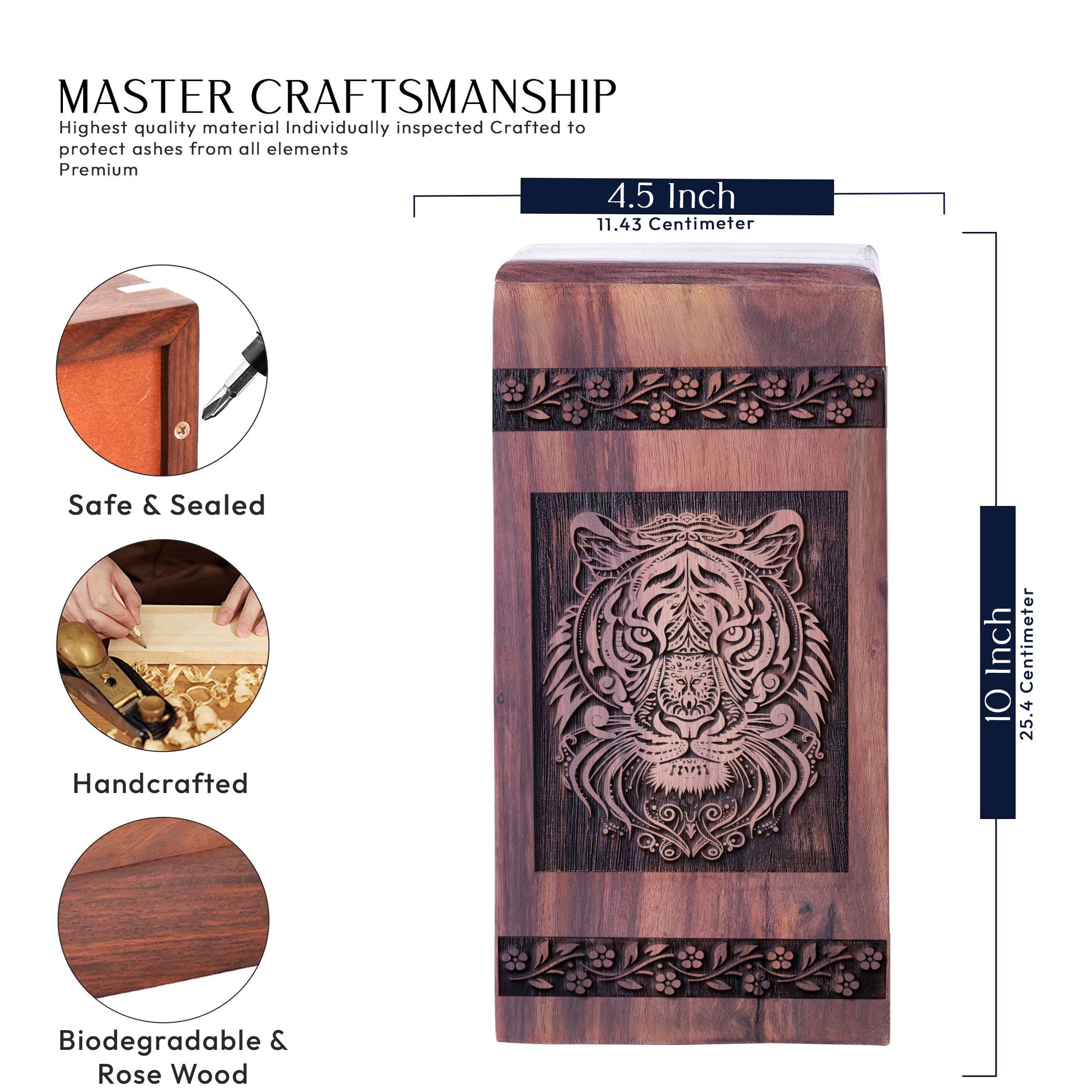Cherish your loved one with our exquisitely carved Tiger Urn. This unique, masterfully crafted wooden cremation urn embodies elegance and place of solace that offers a symbolic tribute to honor the memory of your loved one. Our painstakingly designed urn is a timeless masterpiece, offering a balance of sophistication and sentimentality that makes it one of a kind in our collection. Specifically tailored for adults and seniors, this medium-sized urn can comfortably hold human ashes and can be easily ported around, offering you the chance to keep a cherished part of your loved one close. Its unique design also makes it suitable for ground burial. With 'Urns For Burial In Ground', 'Unique Urns' and 'Portable Urns For Human Ashes' among the most searched terms in the memorial ceremonial supplies category, our Tiger Wood Cremation Urn stands head and shoulders above its counterparts in providing a dignified resting place for those who have passed on. It’s more than an urn, it’s a reverence for those we hold dear.