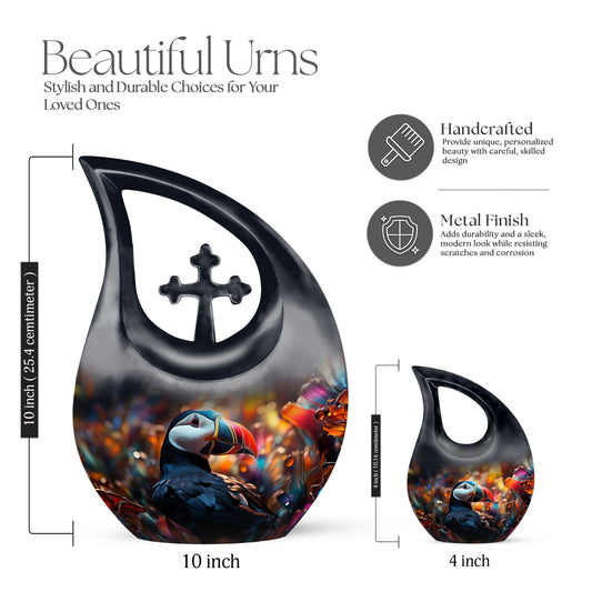 Crafted from premium aluminum, these cremation urns are built for both elegance and longevity. Each design showcases vivid imagery or illustrations of the toucan, often perched among lush jungle leaves or accompanied by bright tropical accents—capturing nature's beauty and the warmth of treasured memories.