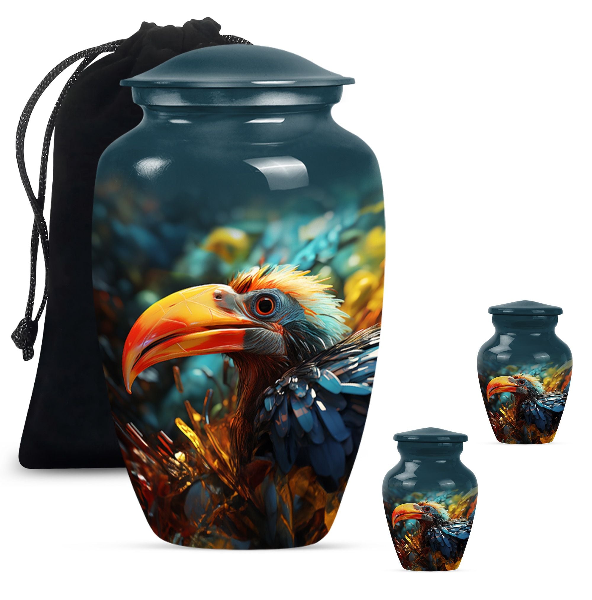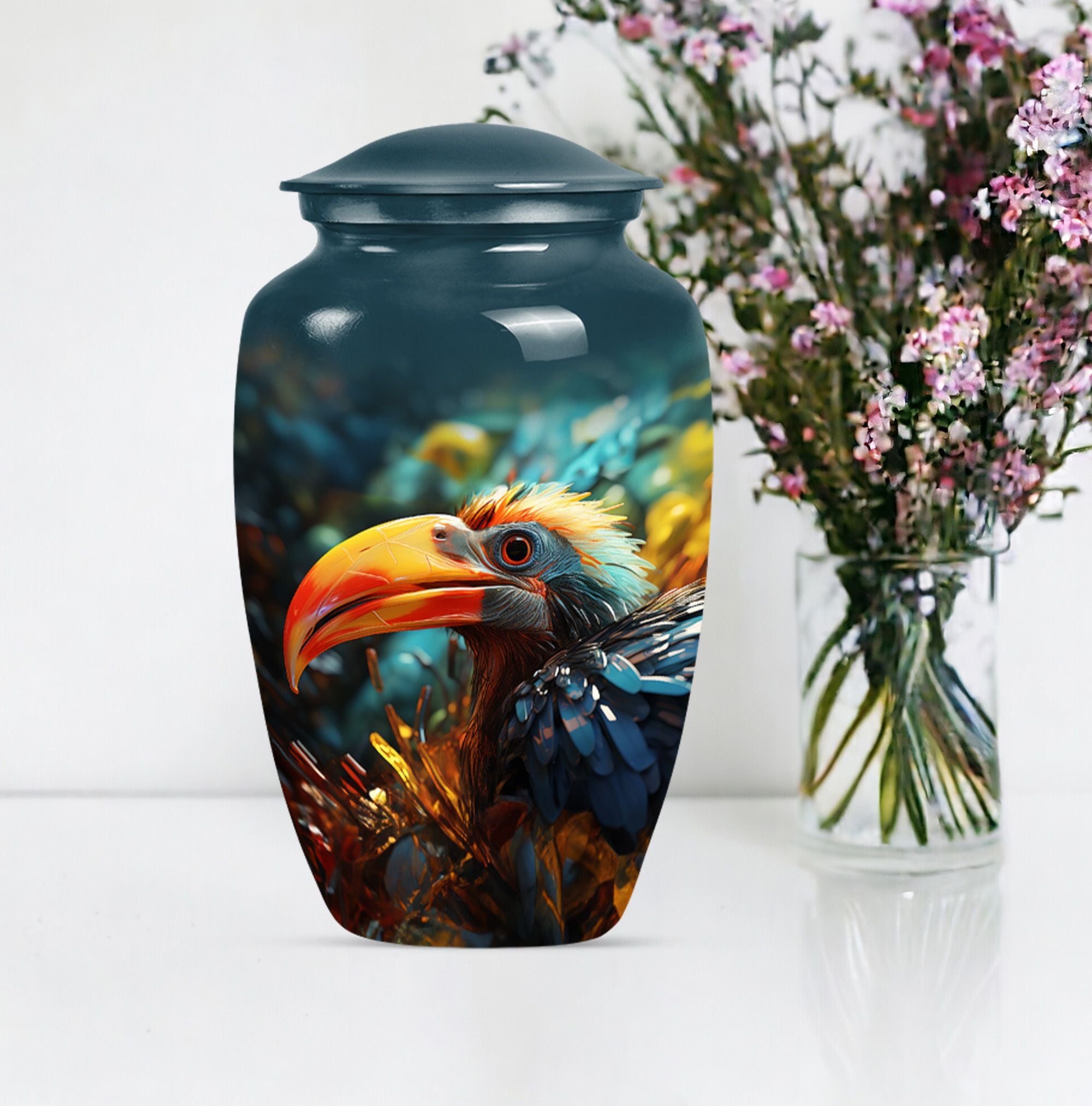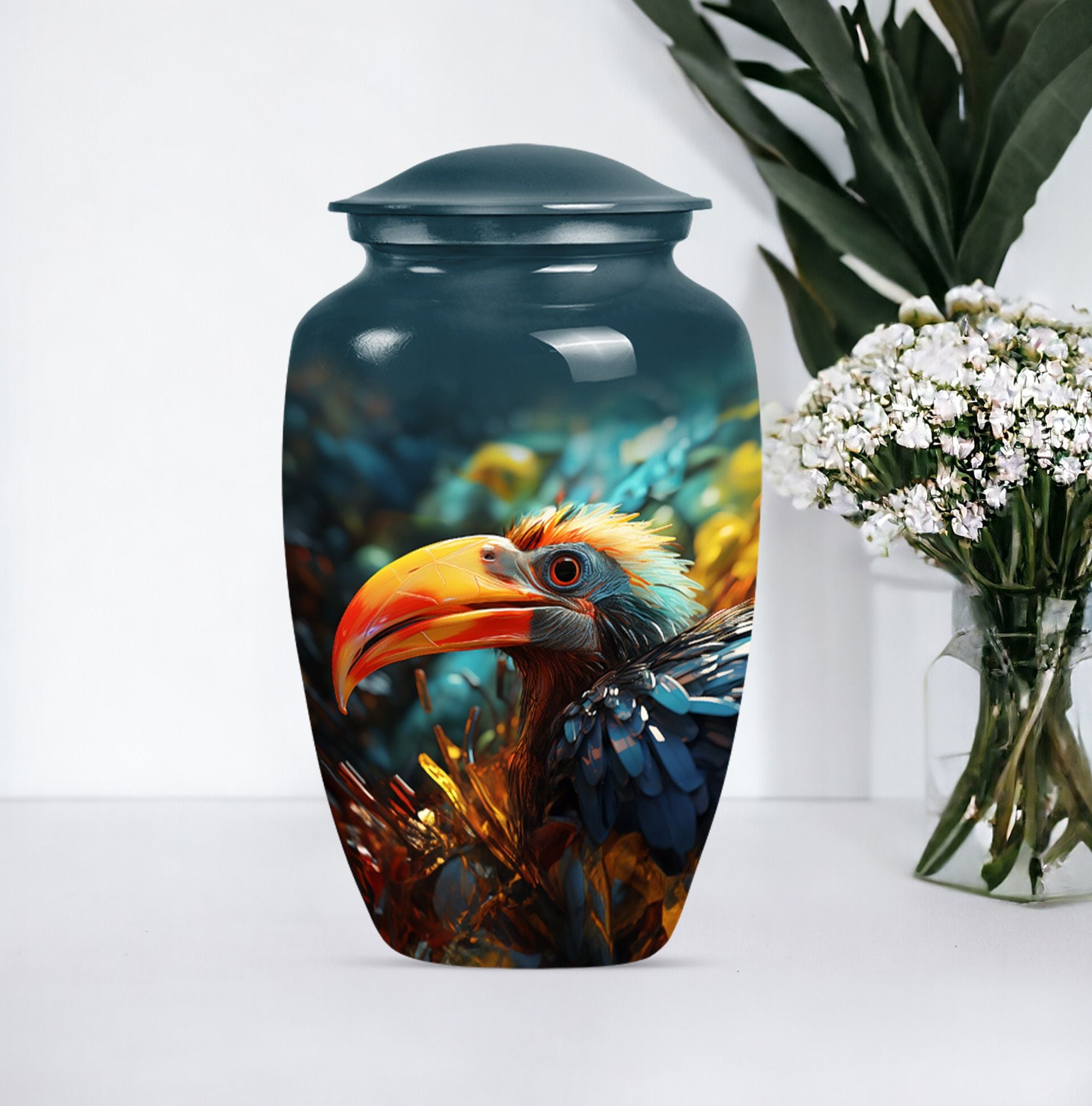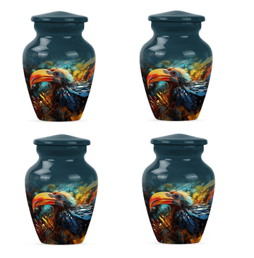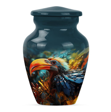 Wander into serene reminiscence with our elegantly designed, 10-inch Toucan Urn, an ideal cremation urn for adult male ashes. Meticulously crafted from aluminium for long-lasting durability, this sizable urn is fit for those seeking a meaningful and personal testament to their loved ones. Our abstract-themed, memorial urn's robust construction weighs a substantial 3.3 pounds, embodying a physical and metaphorical solidity that can safeguard your cherished memories up to 200 cubic inches. Our Toucans Urn comes bundled with a velvet pouch that provides graceful containment for the ashes. Exuding a stately charm, this portable urn is convenient for travels, facilitating you to carry your loved ones' presence wherever you go. Reflect on your heartfelt emotions with the advantage of personalizing this urn, optimally engraved with names. While primarily a urn designed for male, its universal abstract theme and classical appeal also make it suitable as human urn for woman. Transition your mourning phase with our specially curated range of large urns, convey your after-life tribute with dignity and grace.