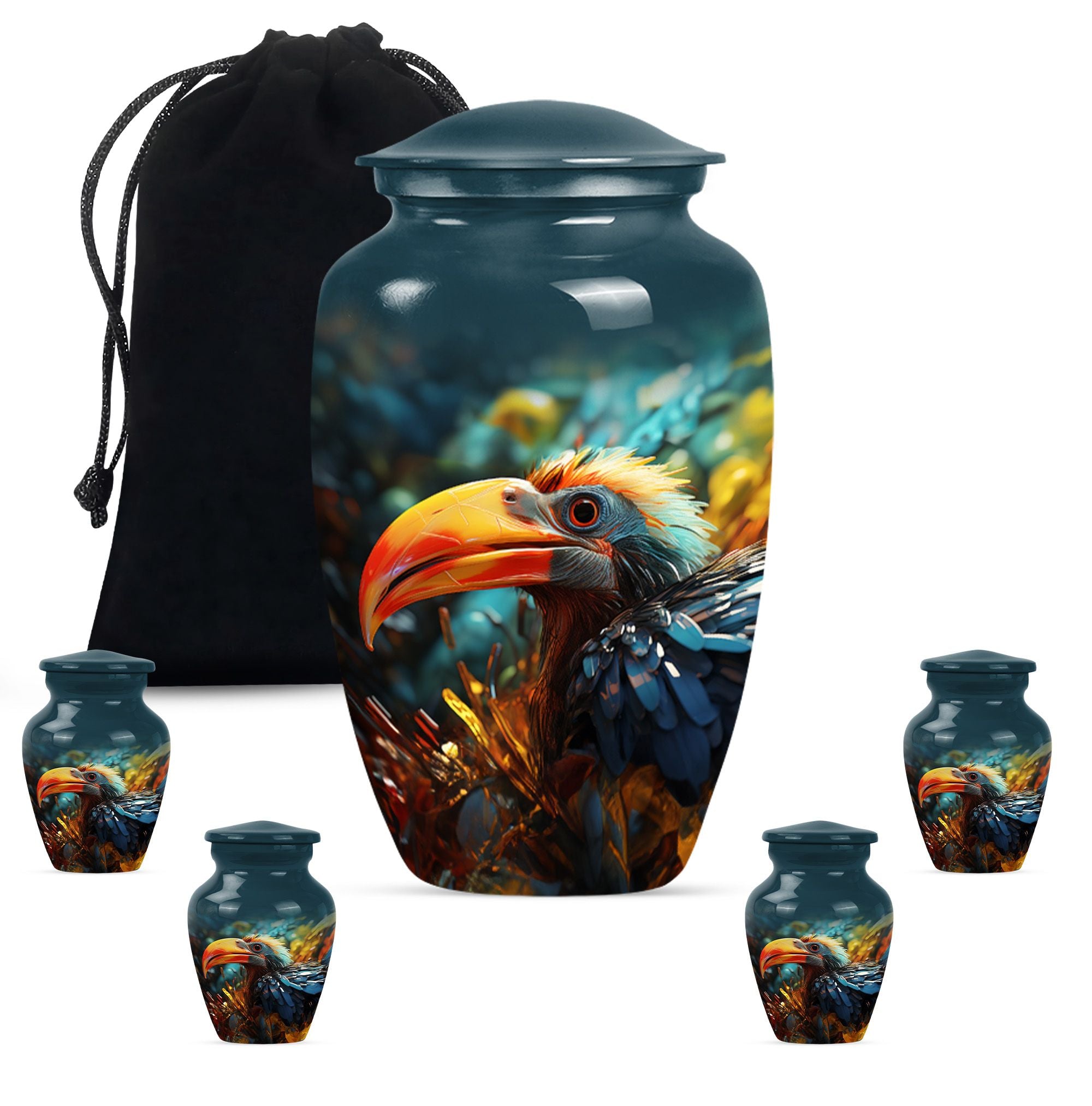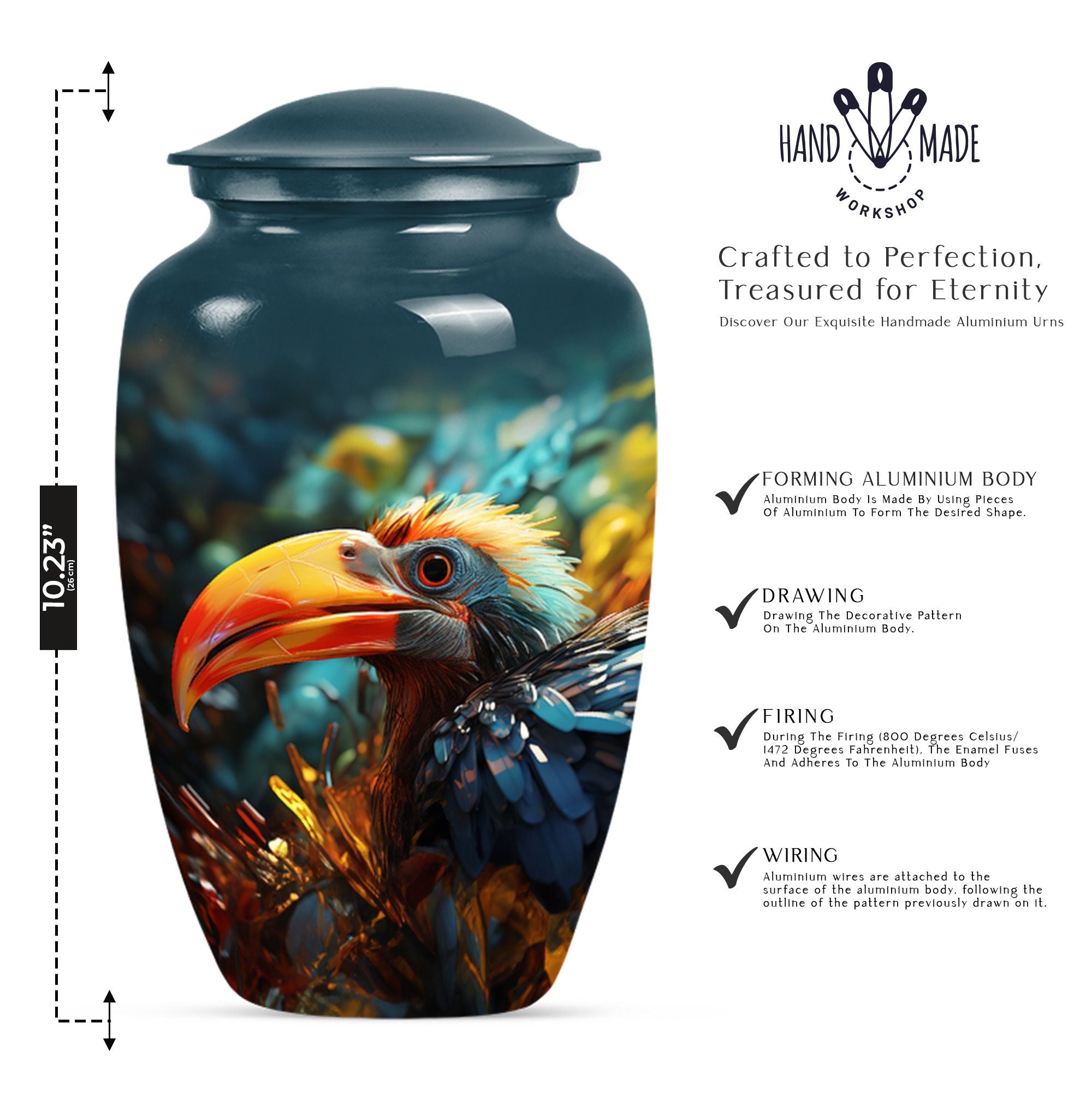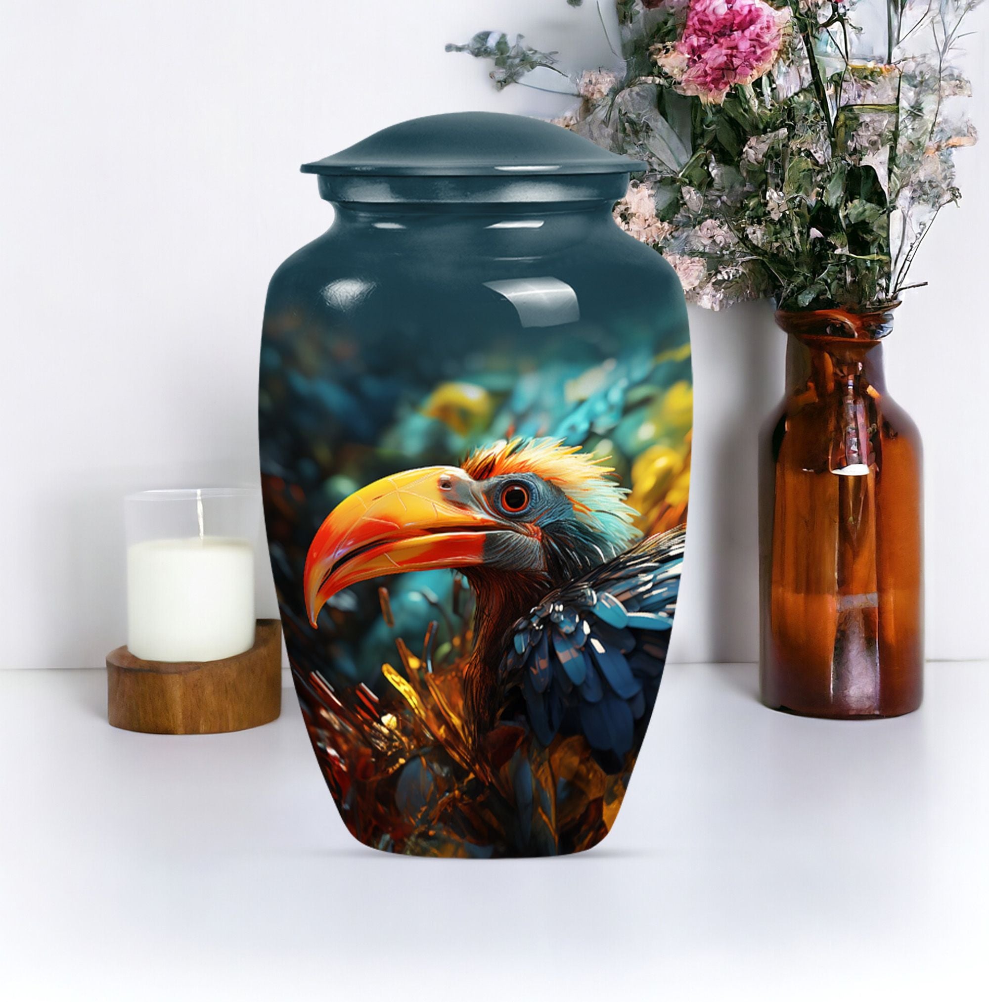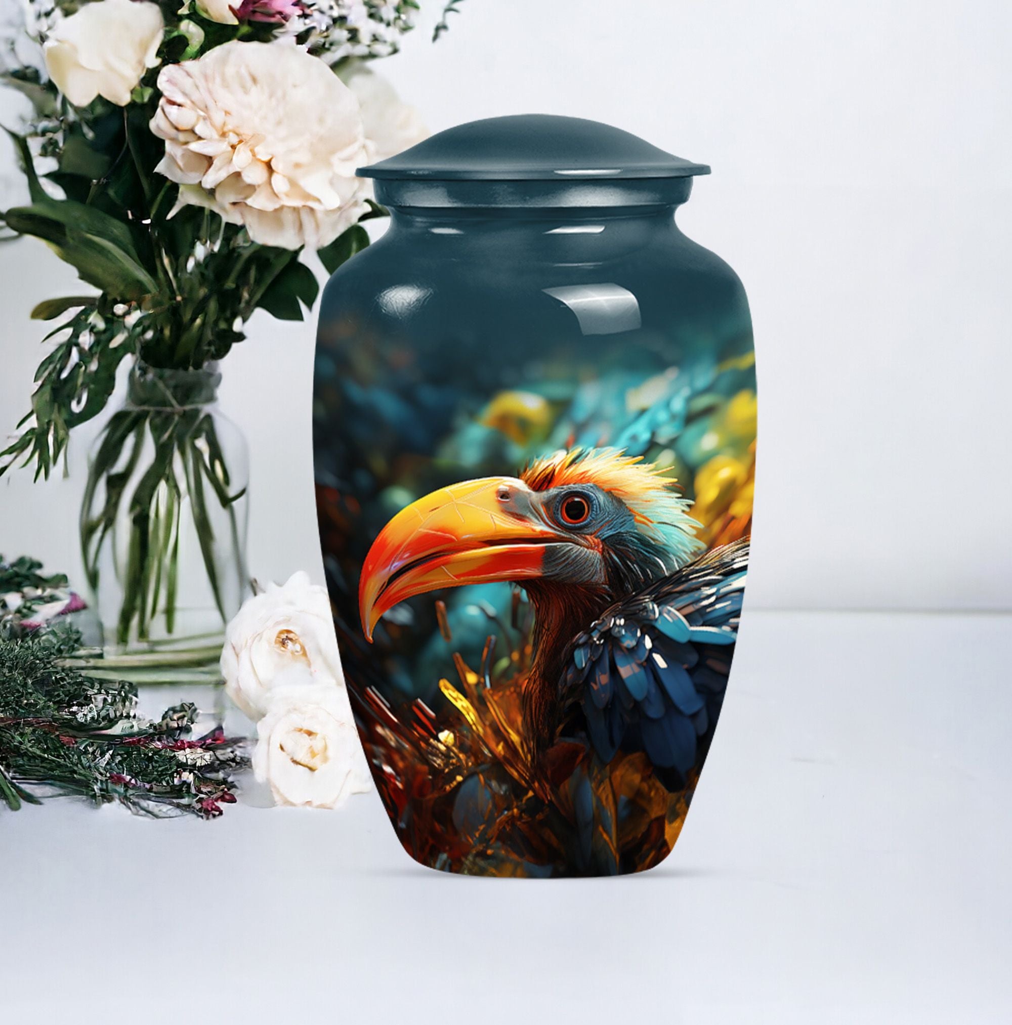Wander into serene reminiscence with our elegantly designed, 10-inch Toucan Urn, an ideal cremation urn for adult male ashes. Meticulously crafted from aluminium for long-lasting durability, this sizable urn is fit for those seeking a meaningful and personal testament to their loved ones. Our abstract-themed, memorial urn's robust construction weighs a substantial 3.3 pounds, embodying a physical and metaphorical solidity that can safeguard your cherished memories up to 200 cubic inches. Our Toucans Urn comes bundled with a velvet pouch that provides graceful containment for the ashes. Exuding a stately charm, this portable urn is convenient for travels, facilitating you to carry your loved ones' presence wherever you go. Reflect on your heartfelt emotions with the advantage of personalizing this urn, optimally engraved with names. While primarily a urn designed for male, its universal abstract theme and classical appeal also make it suitable as human urn for woman. Transition your mourning phase with our specially curated range of large urns, convey your after-life tribute with dignity and grace.