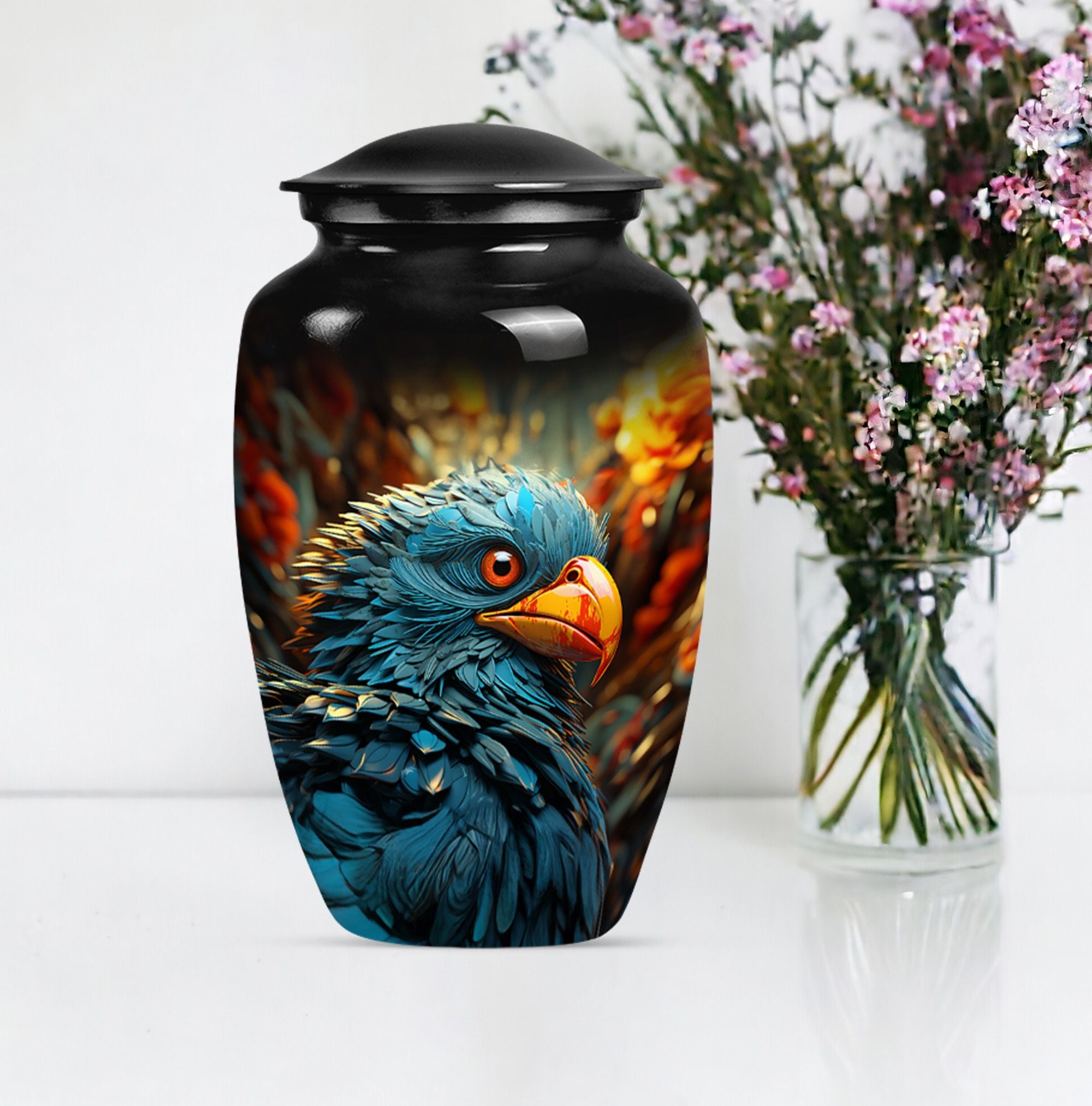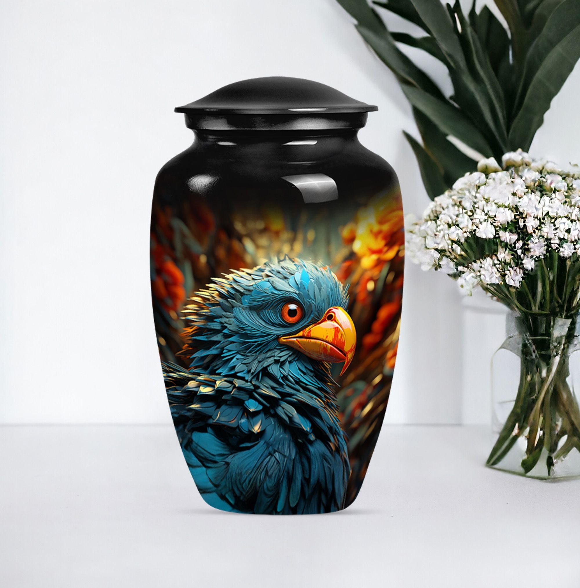 Cherish and keep the memories of your loved ones alive with our exquisite Toucans Urn. This 10-inch classic urn is meticulously crafted from durable aluminium, ensuring a timeless expression of elegance and serenity. Weighing 3.3 pounds with a generous capacity of 200 cubic inches, it comfortably holds the ashes of an adult. Each urn comes with a luxurious velvet pouch for secure, respectful containment of ashes. Notably, we offer the personal touch of engravings, letting you immortalize names on our Toucan Urn – a keepsake as unique as your loved one. Inspired by an abstract theme, this cremation urn forms a worthy tribute to the grandeur and depth of a life well-lived. This funeral metal urn is larger than typical urns, making it ideal for burial purposes. Our Large Urn combines sentimentality and exceptional design, making it a top choice in Memorial Ceremony Supplies for adults and seniors. Intelligently crafted and endearing, it stands out as a touching memento when searching for 'memorial urns for ashes', 'urns for burial', or 'shaped ashes urn'.