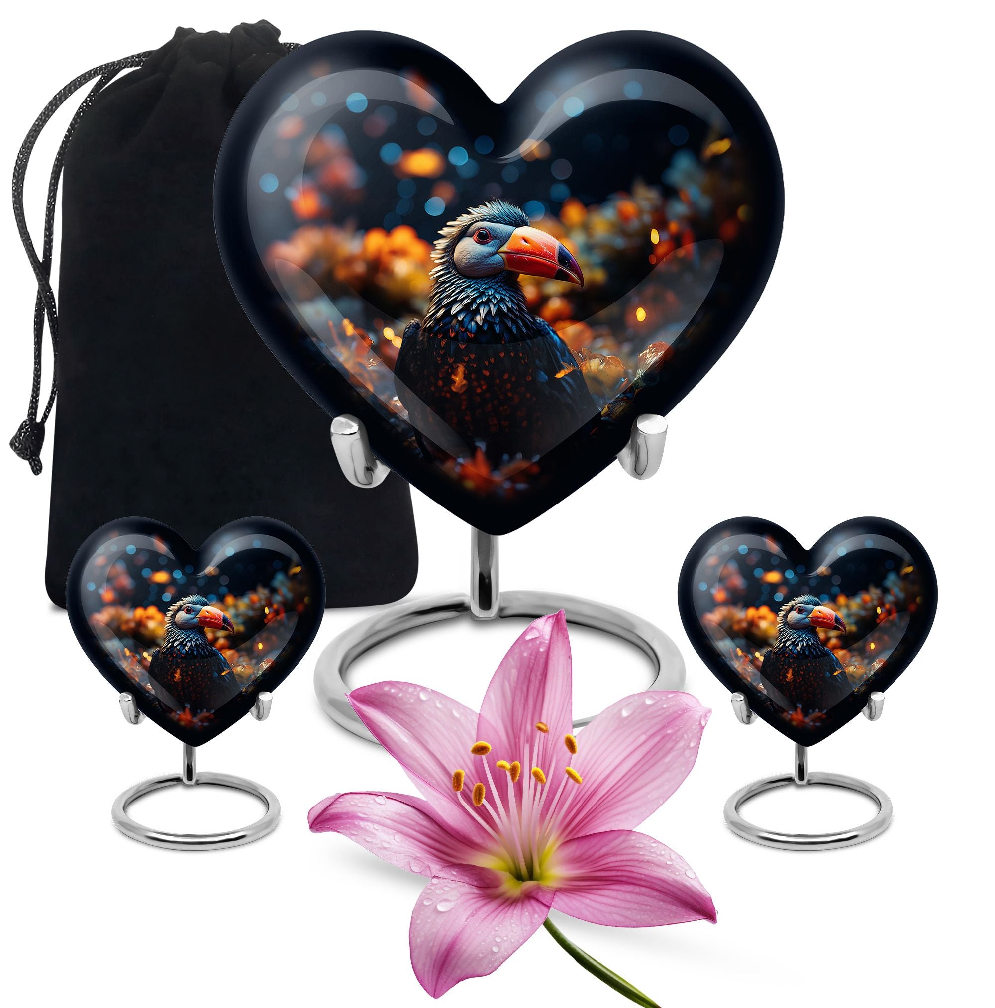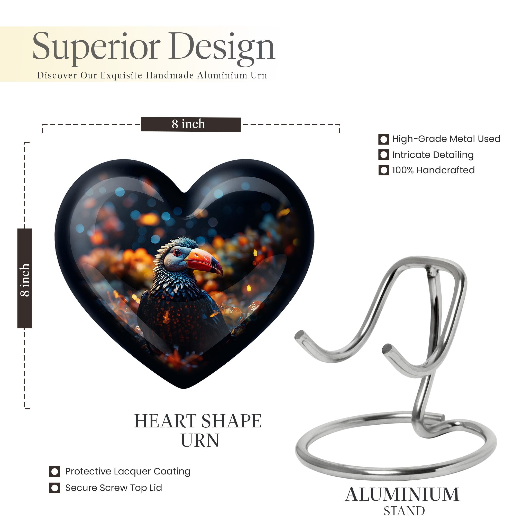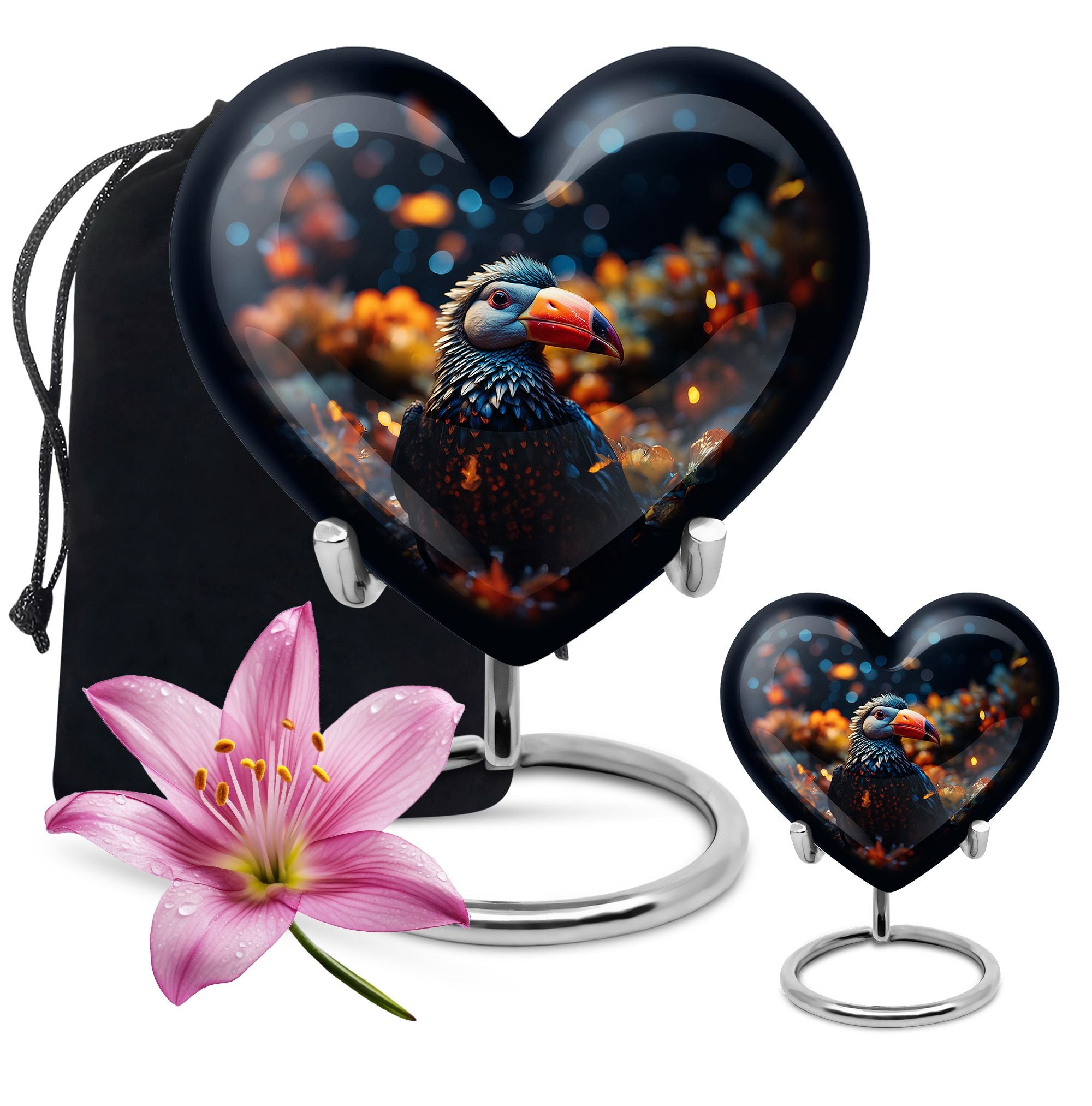 With an exquisite blend of style and remembrance, our 'Toucans Urn' is tailored for those who desire uniqueness and value significance. Carrying an eye-catching abstract theme, this large funeral urn is meticulously crafted from superior quality aluminium blend; it delicately balances durability with finesse. The heart design embedded in our urn demonstrates a deep sense of love and honor towards your departed loved ones and serves as a tangible reminder of cherished memories. Sized impeccably at 10 inches and with a capacity holding up to 200 cubic inches of remains, this urn embodies the perfect resting sanctuary for your precious one. This metal urn comes alongside a sublime velvet pouch for discreet containment of cremated ashes. Adding a personalized touch is our uniqueness; with the 'Toucans Urn', you are privileged to engrave preferred names, making the urn all the more intimate. Explore our collection of uniquely tailored memorial urns for mom or any cherished female figure; you are sure to find a memorial that resonates. Personalize your journey of remembrance with our stunning selection of funeral urns and find solace in honoring your beloved's legacy.