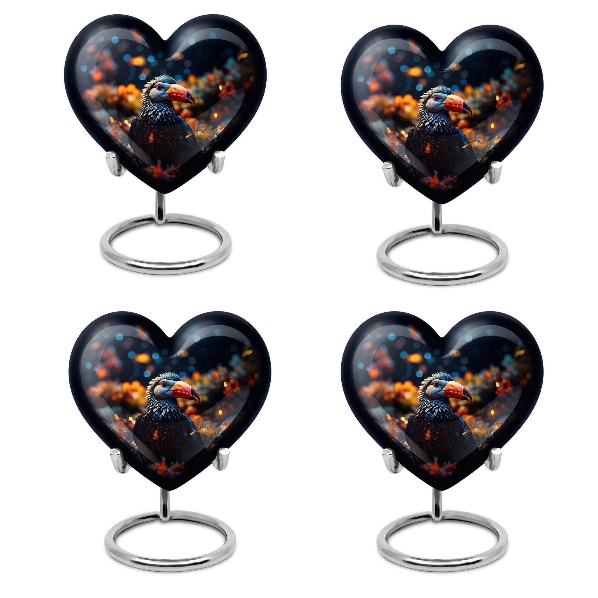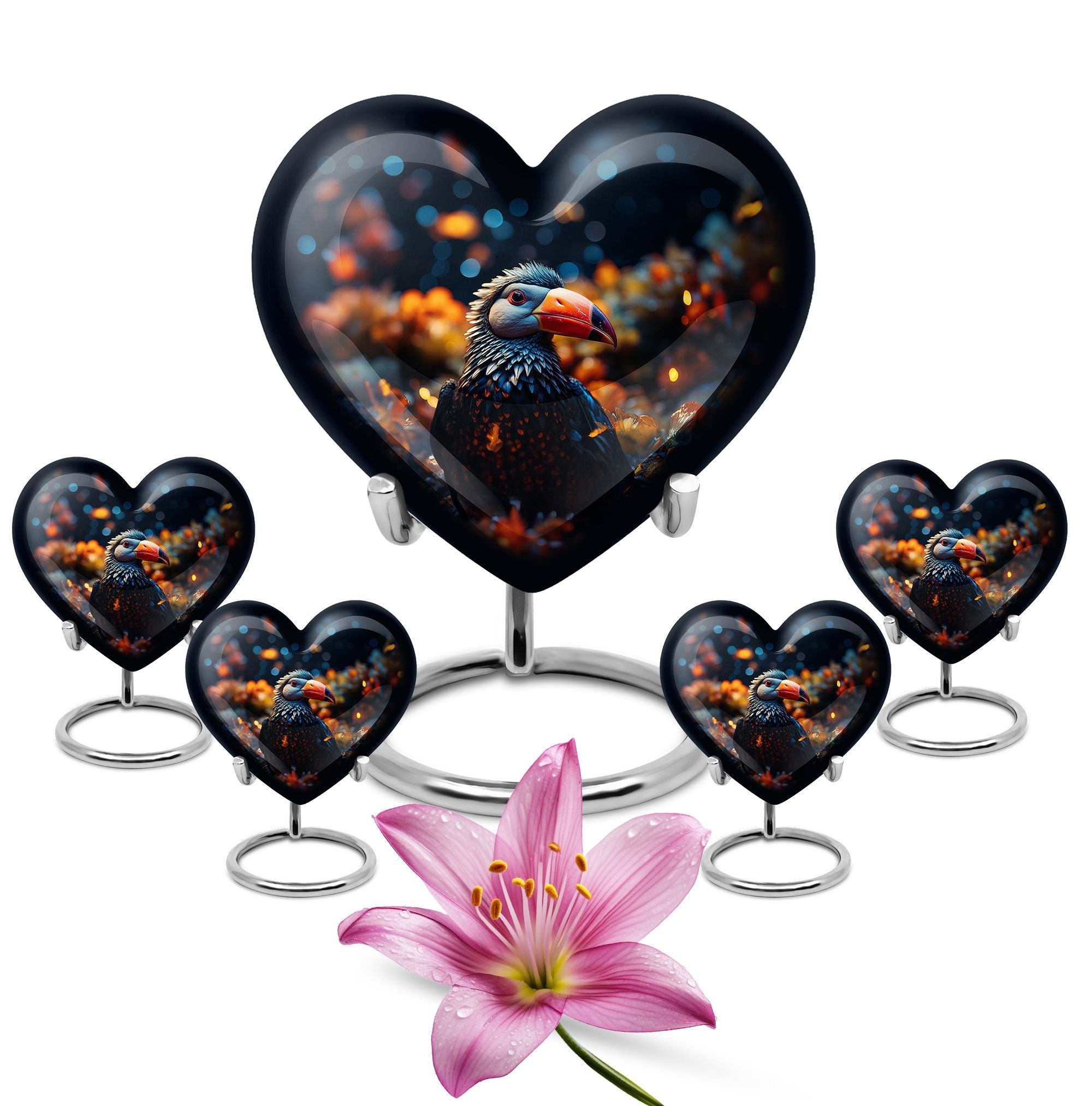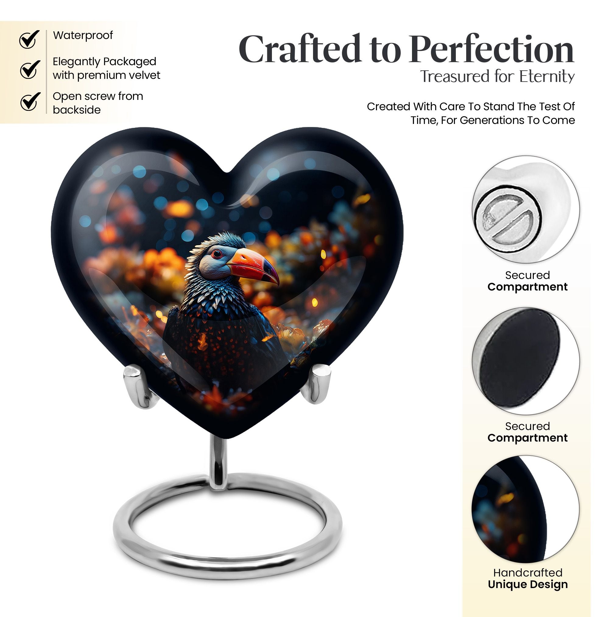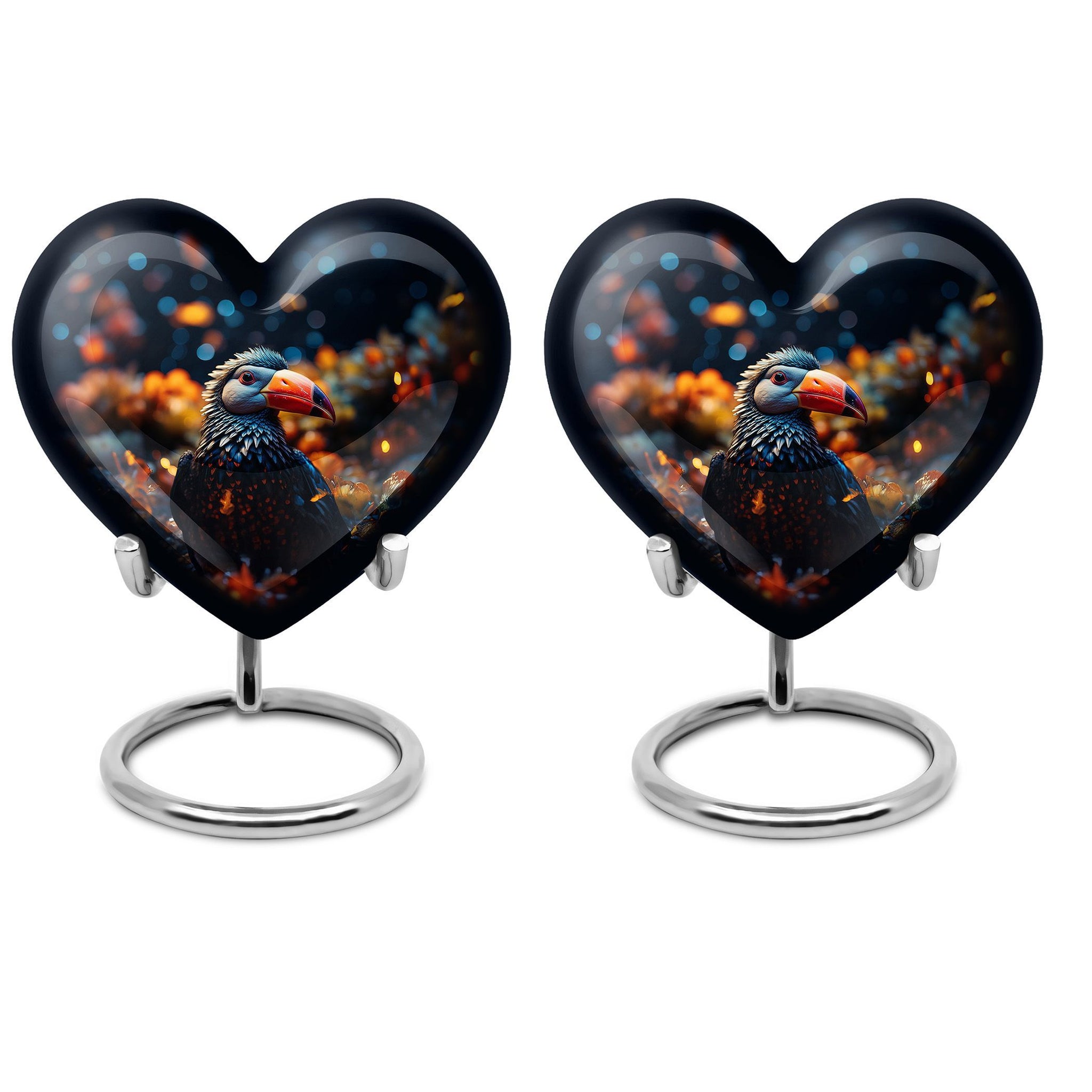 With an exquisite blend of style and remembrance, our 'Toucans Urn' is tailored for those who desire uniqueness and value significance. Carrying an eye-catching abstract theme, this large funeral urn is meticulously crafted from superior quality aluminium blend; it delicately balances durability with finesse. The heart design embedded in our urn demonstrates a deep sense of love and honor towards your departed loved ones and serves as a tangible reminder of cherished memories. Sized impeccably at 10 inches and with a capacity holding up to 200 cubic inches of remains, this urn embodies the perfect resting sanctuary for your precious one. This metal urn comes alongside a sublime velvet pouch for discreet containment of cremated ashes. Adding a personalized touch is our uniqueness; with the 'Toucans Urn', you are privileged to engrave preferred names, making the urn all the more intimate. Explore our collection of uniquely tailored memorial urns for mom or any cherished female figure; you are sure to find a memorial that resonates. Personalize your journey of remembrance with our stunning selection of funeral urns and find solace in honoring your beloved's legacy.