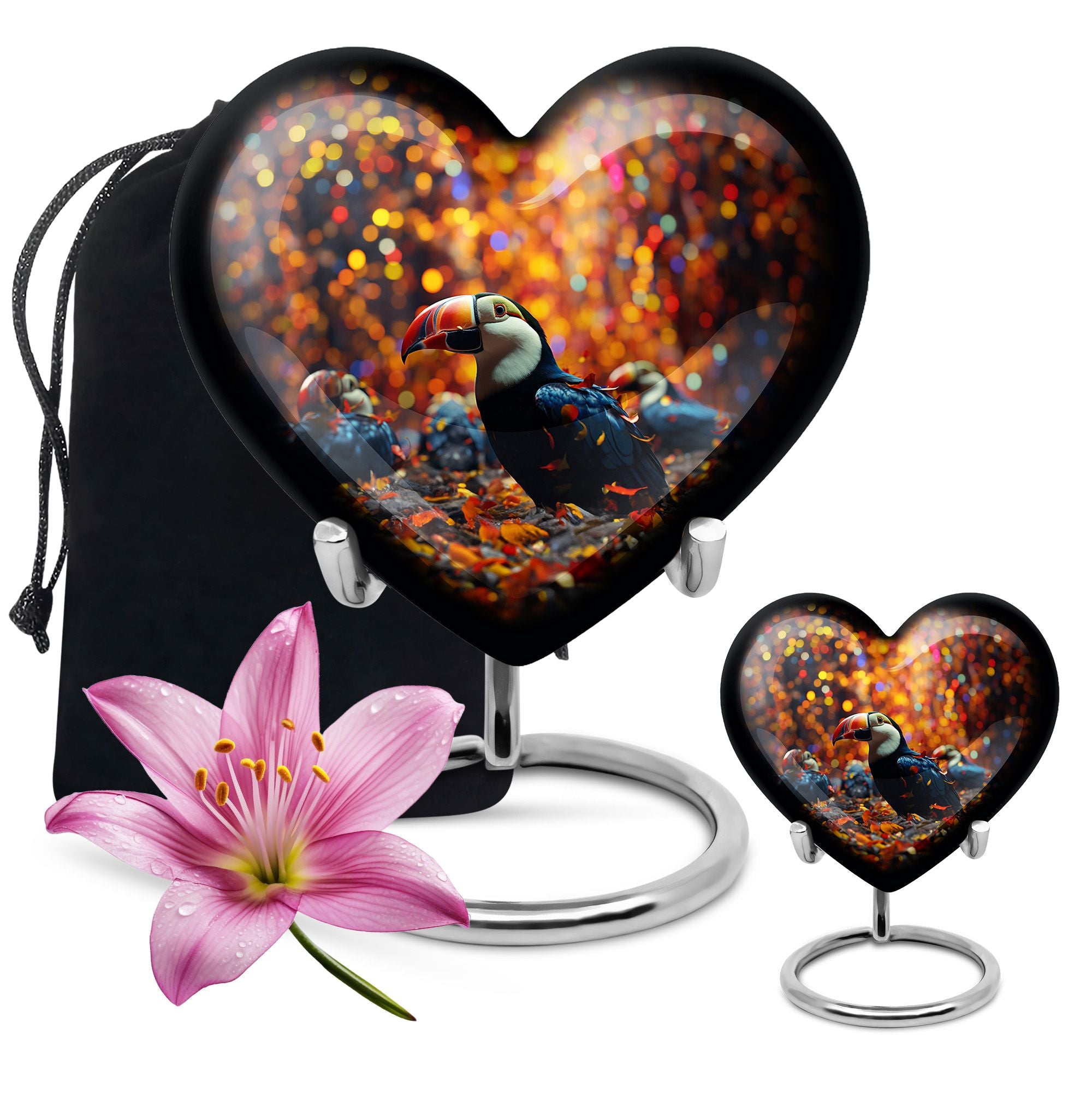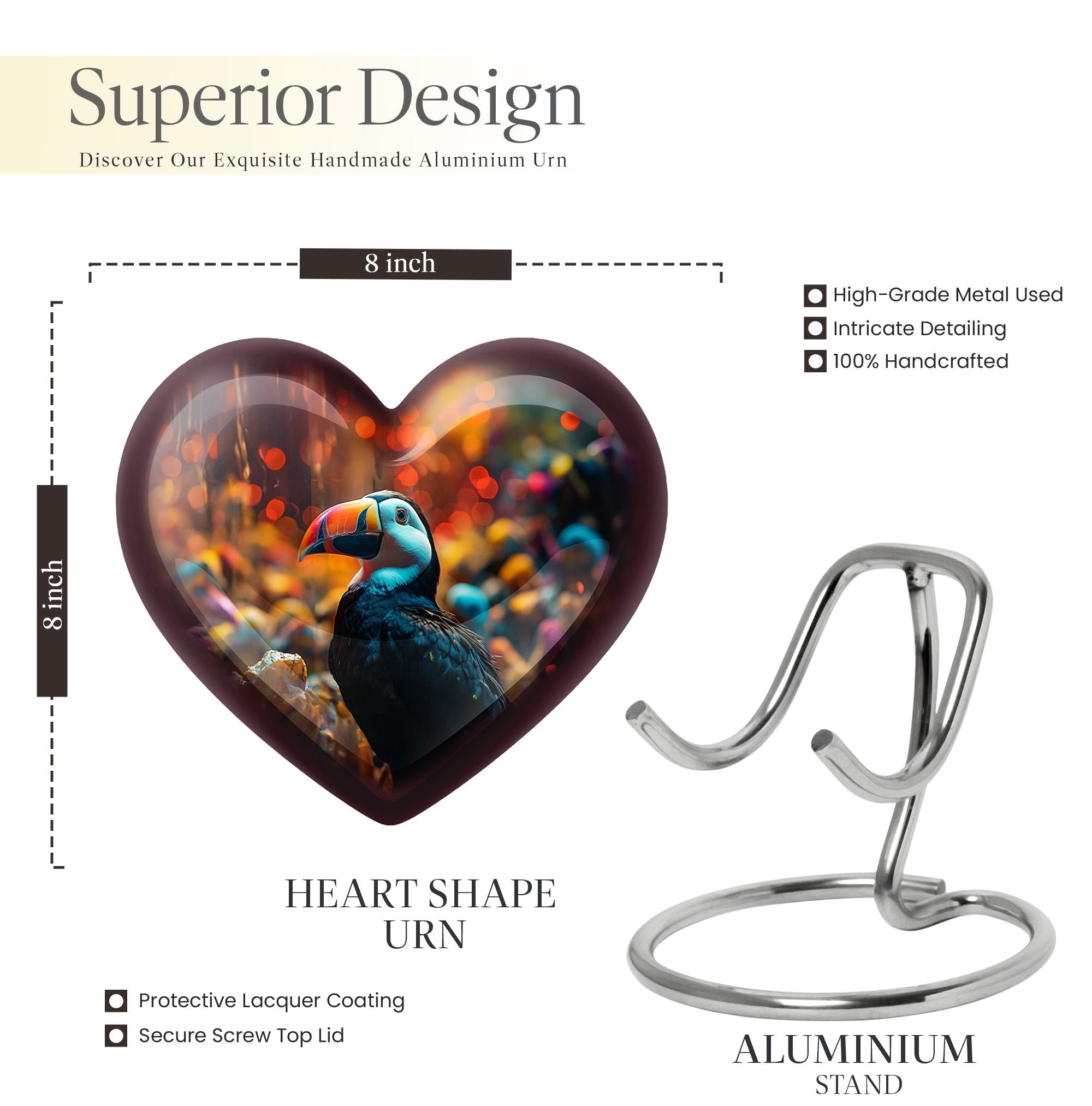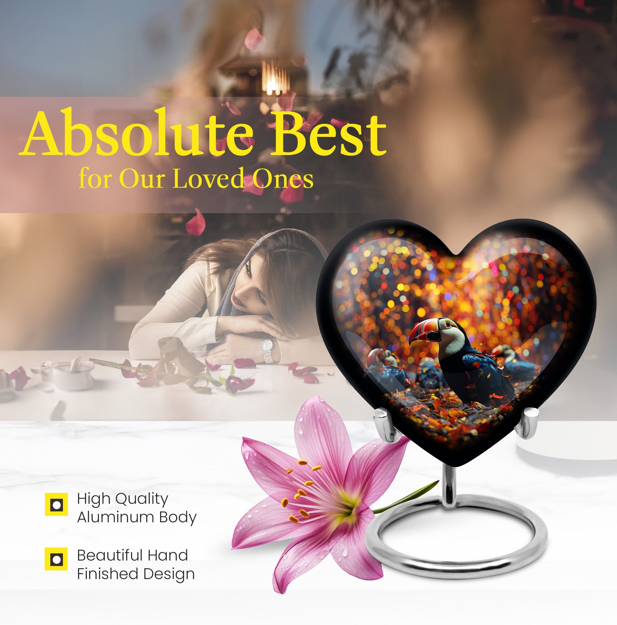 Presenting an elegant and refined way to memorialize your loved ones with our 'Toucans Urn'. Crafted using premium quality aluminium, this large urn is capable of holding up to 200 cubic inches of ashes. Its heart-shaped design radiates love and eternity, encapsulating the endless bond between you and the cherished individual. We further offer the opportunity to personalize this funeral urn for human ashes adult man with engraved names, enhancing its sentimental value. Measuring 10 inches in height and weighing 3.3 pounds, it presents a significant presence in any space you place it in. The urn is accompanied by a velvet pouch to contain the ashes securely. Recommended searches for this product include 'urns for cremation ashes', 'Innovative Modern Urns for Human Ashes', 'urn for female', and 'metal urns for adult human ashes'. Our Toucans Urn truly offers a heartfelt and honourable commemoration to those individuals who are no longer physically with us but continue to reside in our hearts forever.
