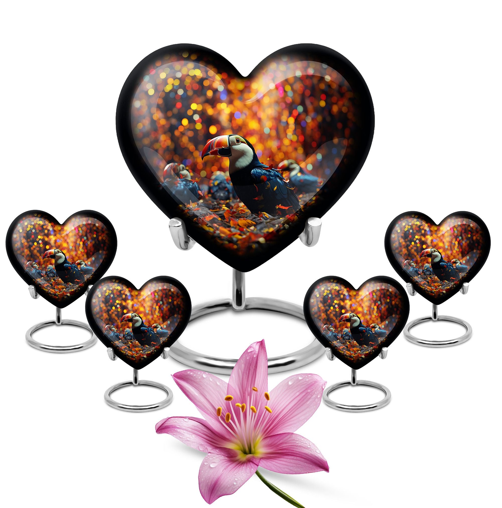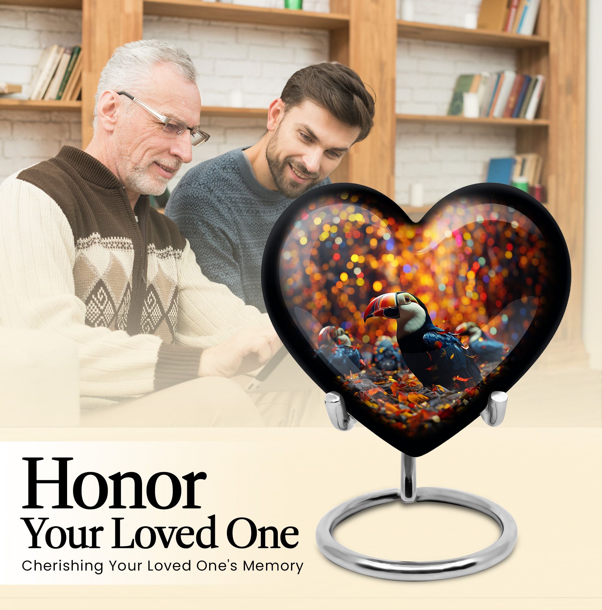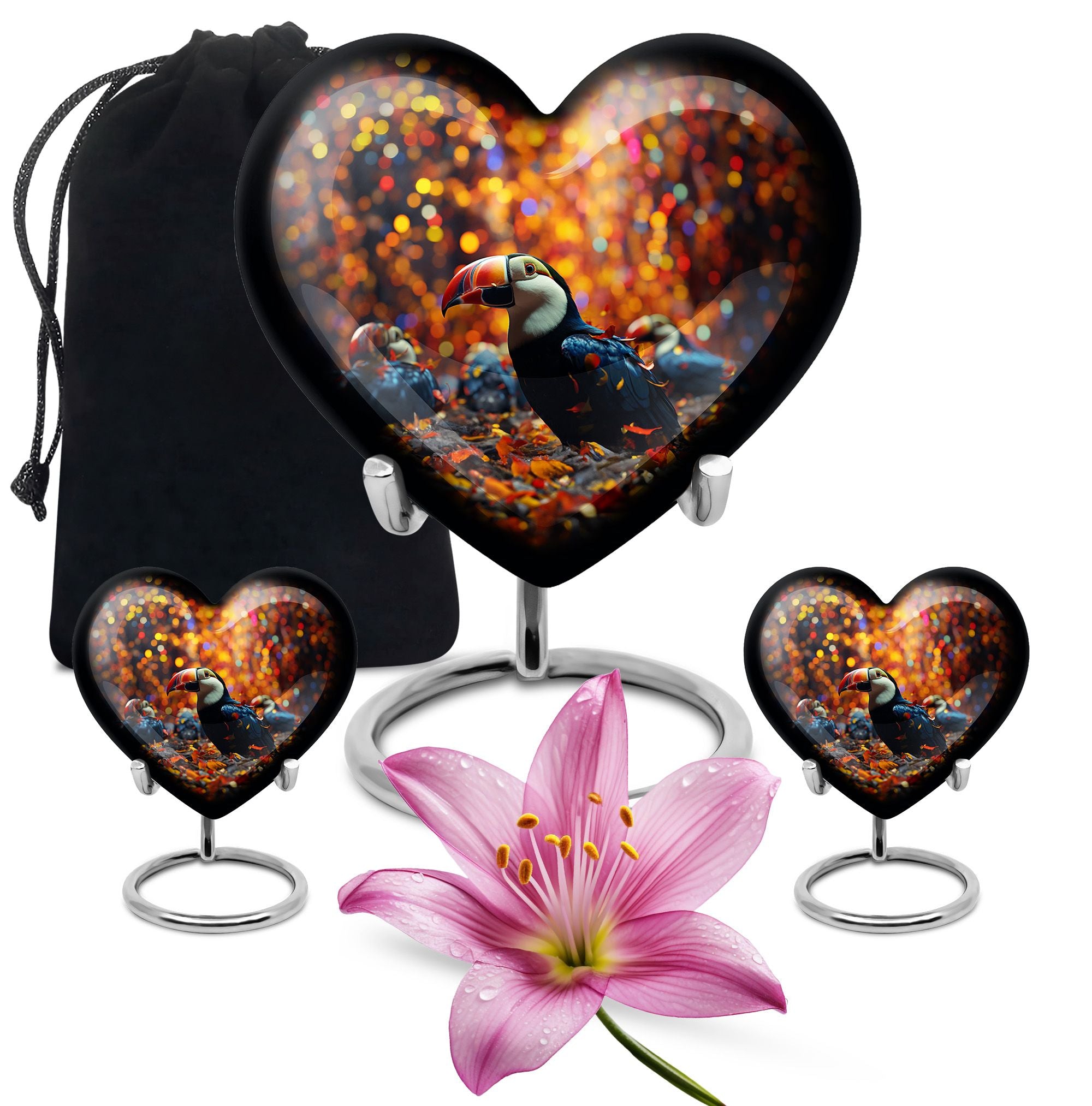 Presenting an elegant and refined way to memorialize your loved ones with our 'Toucans Urn'. Crafted using premium quality aluminium, this large urn is capable of holding up to 200 cubic inches of ashes. Its heart-shaped design radiates love and eternity, encapsulating the endless bond between you and the cherished individual. We further offer the opportunity to personalize this funeral urn for human ashes adult man with engraved names, enhancing its sentimental value. Measuring 10 inches in height and weighing 3.3 pounds, it presents a significant presence in any space you place it in. The urn is accompanied by a velvet pouch to contain the ashes securely. Recommended searches for this product include 'urns for cremation ashes', 'Innovative Modern Urns for Human Ashes', 'urn for female', and 'metal urns for adult human ashes'. Our Toucans Urn truly offers a heartfelt and honourable commemoration to those individuals who are no longer physically with us but continue to reside in our hearts forever.