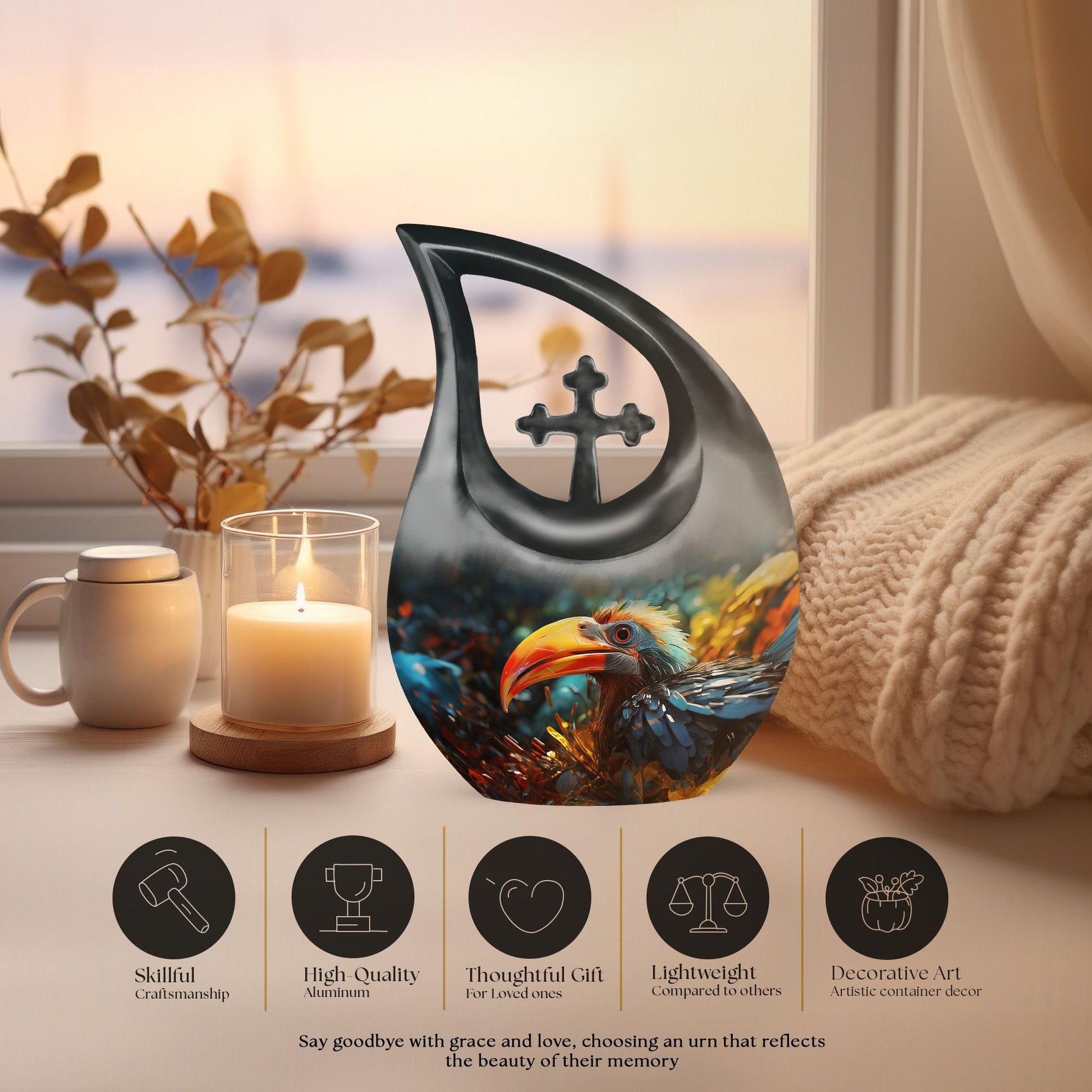 This Toucans Memorial Urn offers a heartfelt way to honor a cherished life, bringing a gentle sense of peace and remembrance. Thoughtfully designed for urn human ash adult male as well as urn female ashes, it provides families a beautiful and comforting resting place for their loved one. Its tropical toucan design symbolizes warmth, connection, and eternal harmony.