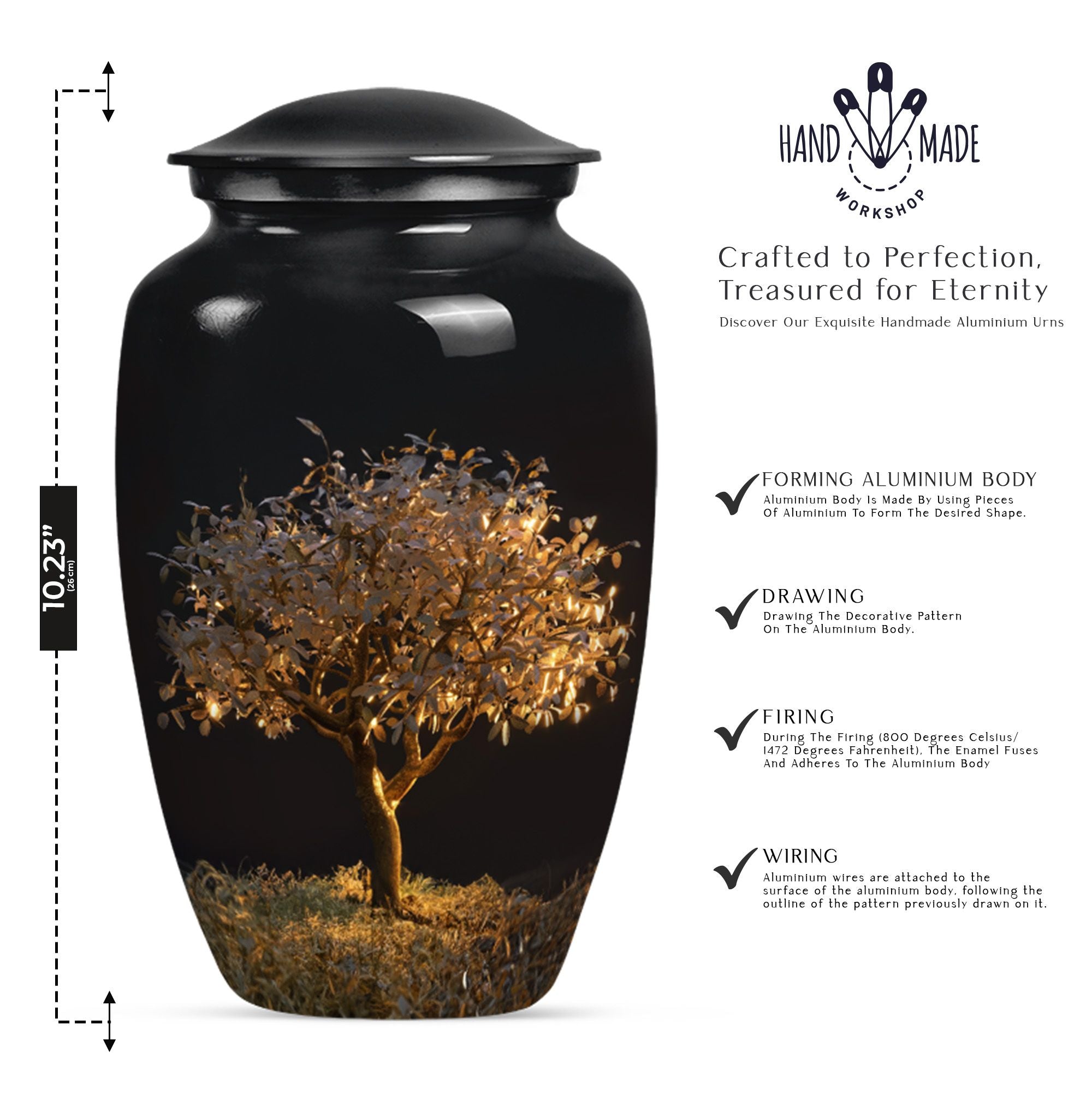 Expertly designed, this large decorative urn for human ashes showcases exquisite craftsmanship in durable aluminium. The sleek black finish and intricate tree design make it both a functional urn and a cherished display piece. Ideal as an urn large adult or large urn human ashes, it offers both elegance and practicality for memorializing a loved one. Its versatile style ensures it fits seamlessly into home memorials or formal remembrance spaces.