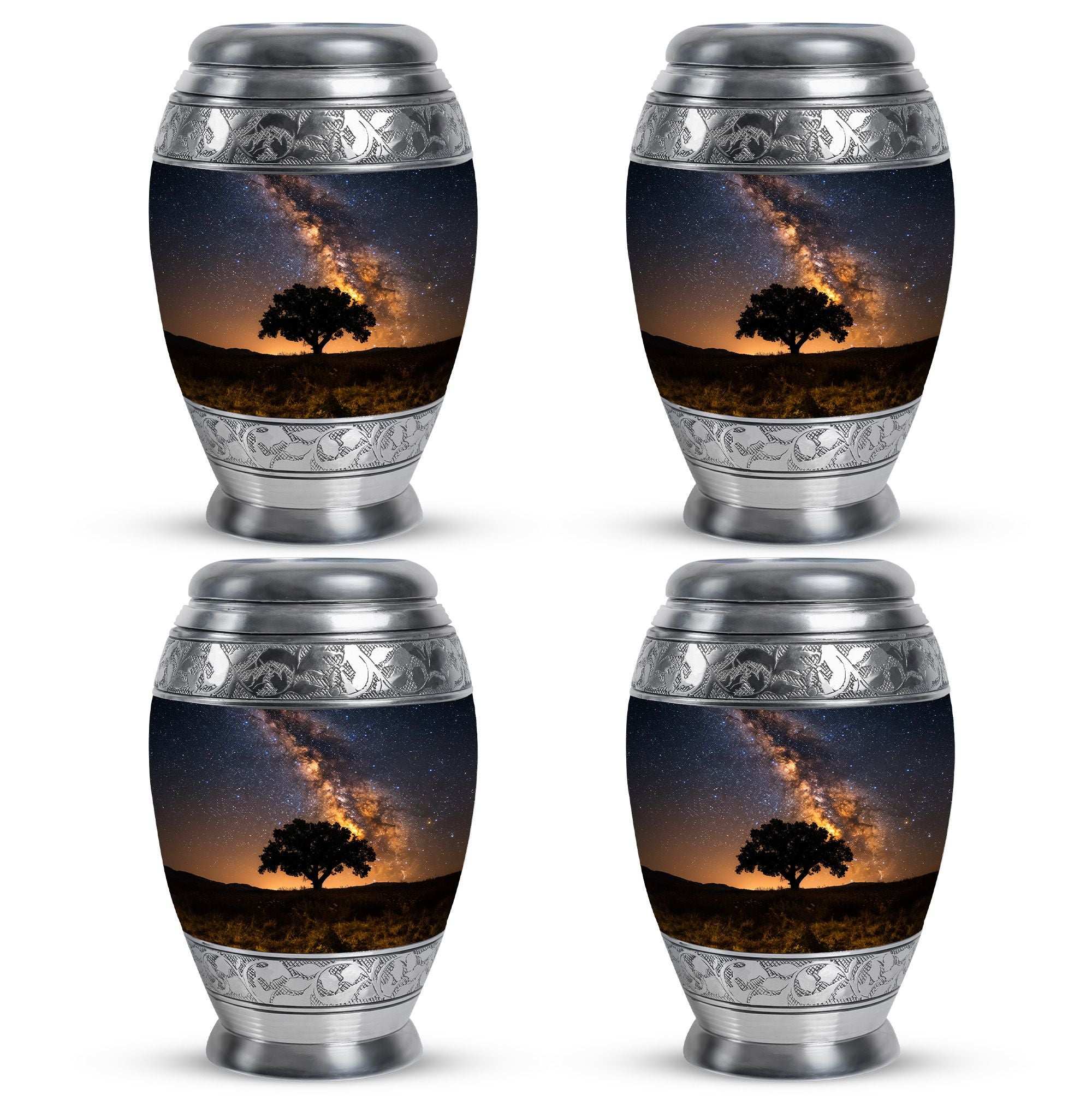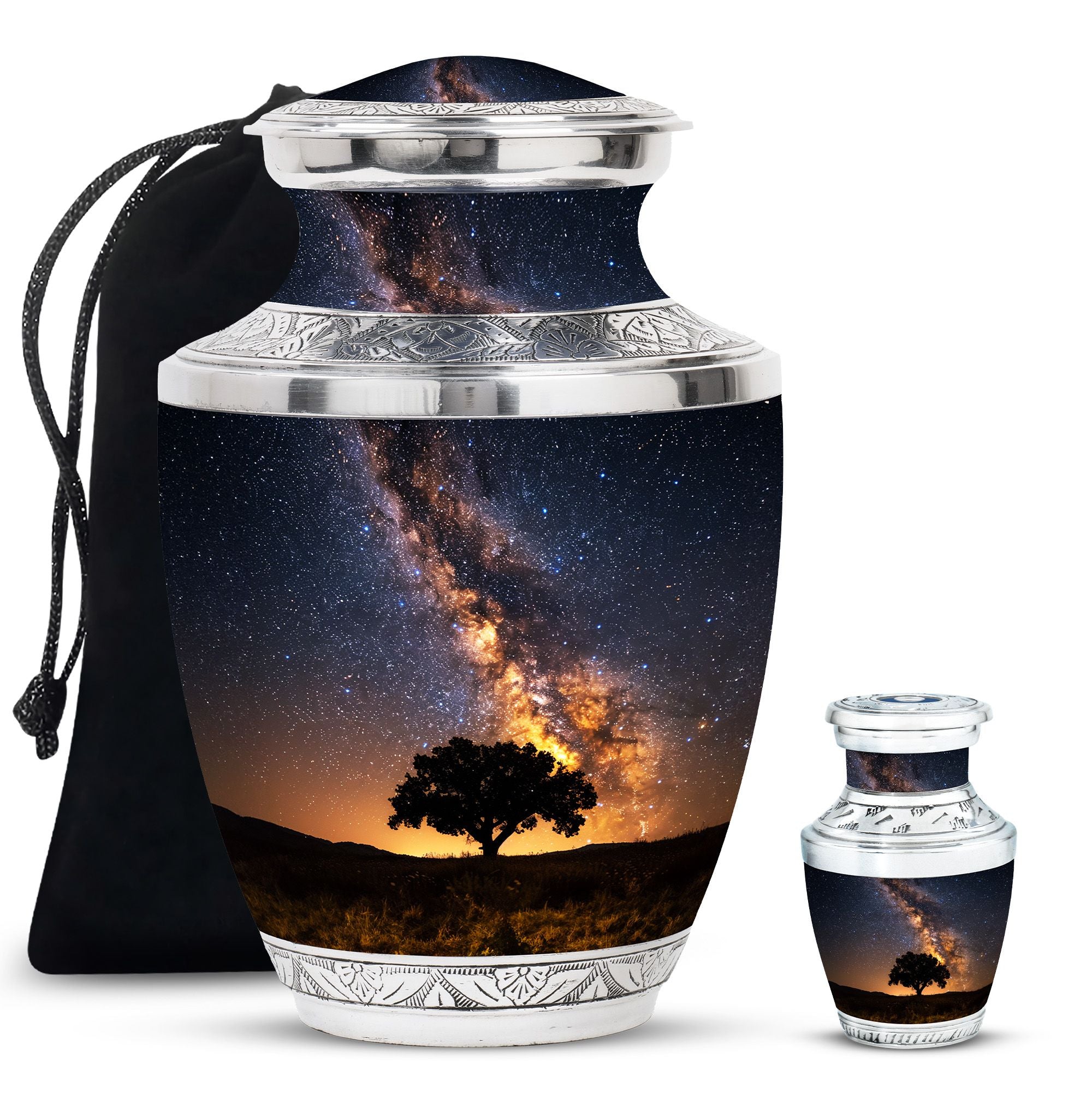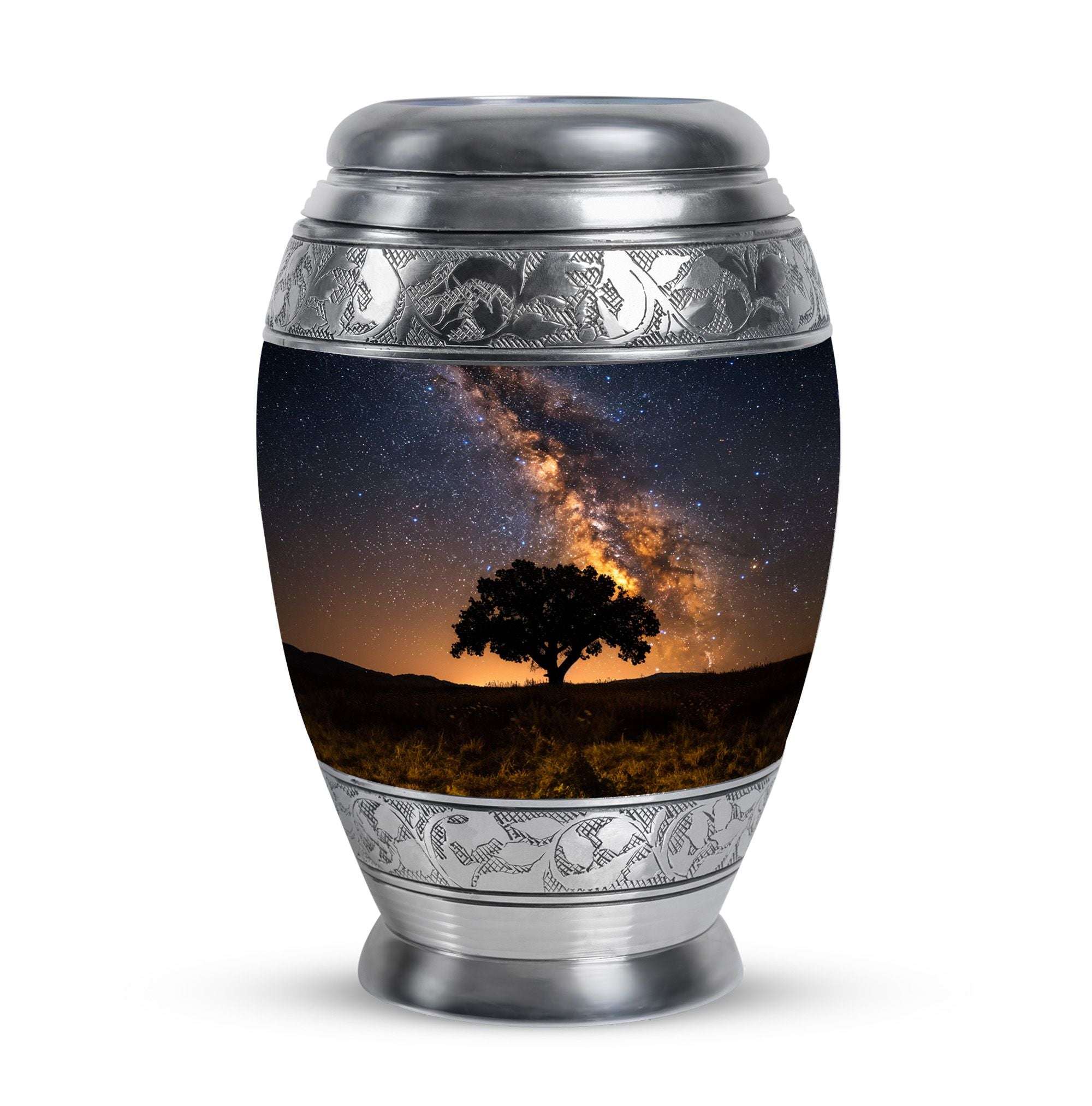Made from high-quality aluminum, this large cremation urn is designed for durability and elegance. The Tree of Life design stands against a starry night background, symbolizing eternal love and new beginnings. Suitable as an urn large adult male or large urn mom, its size and craftsmanship provide security while also serving as a striking memorial display. Families often select it among human urns for ashes adult large and large adult urns for human ashes for its timeless beauty and strength.