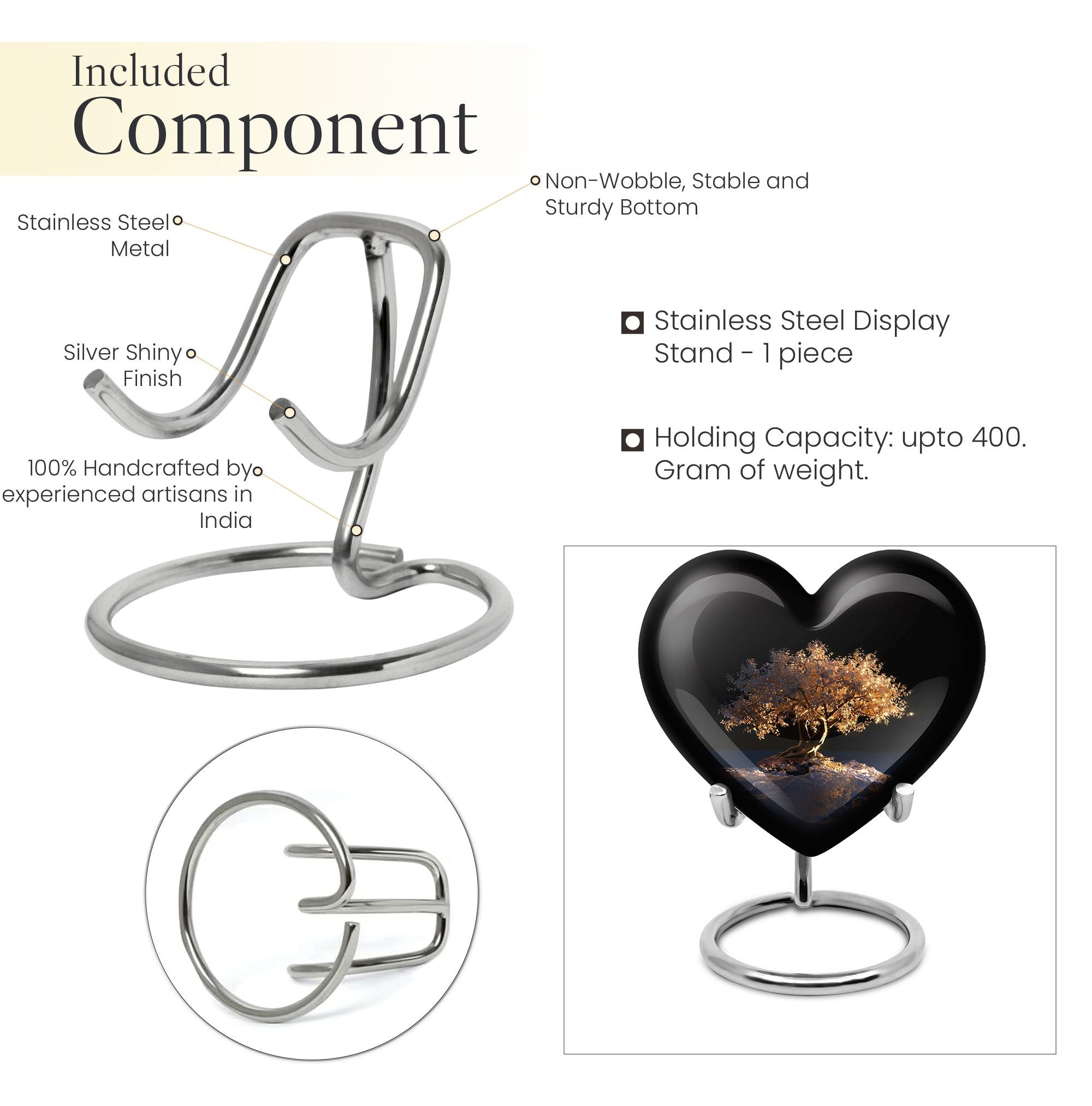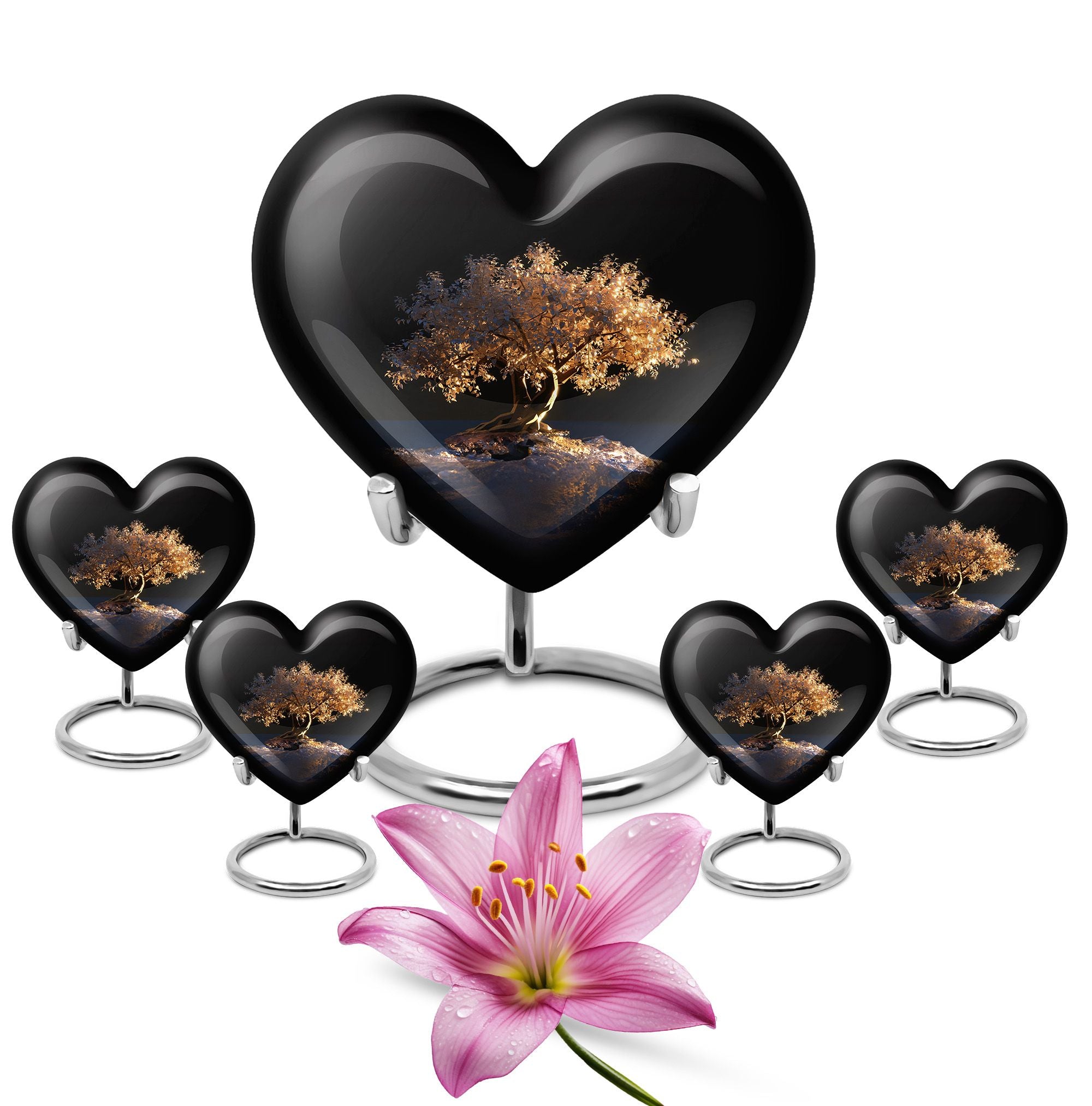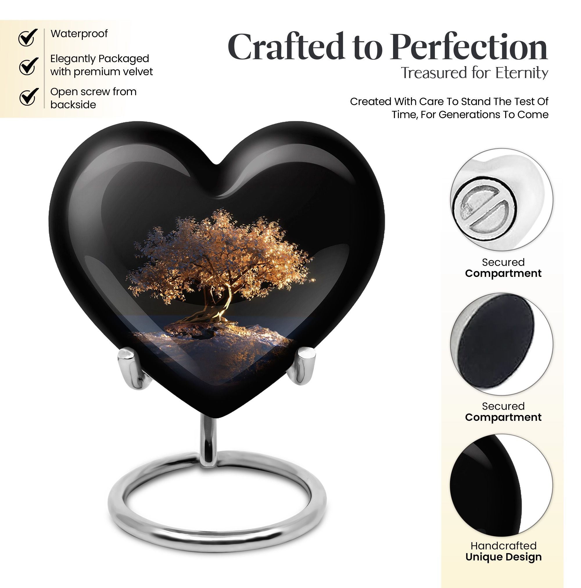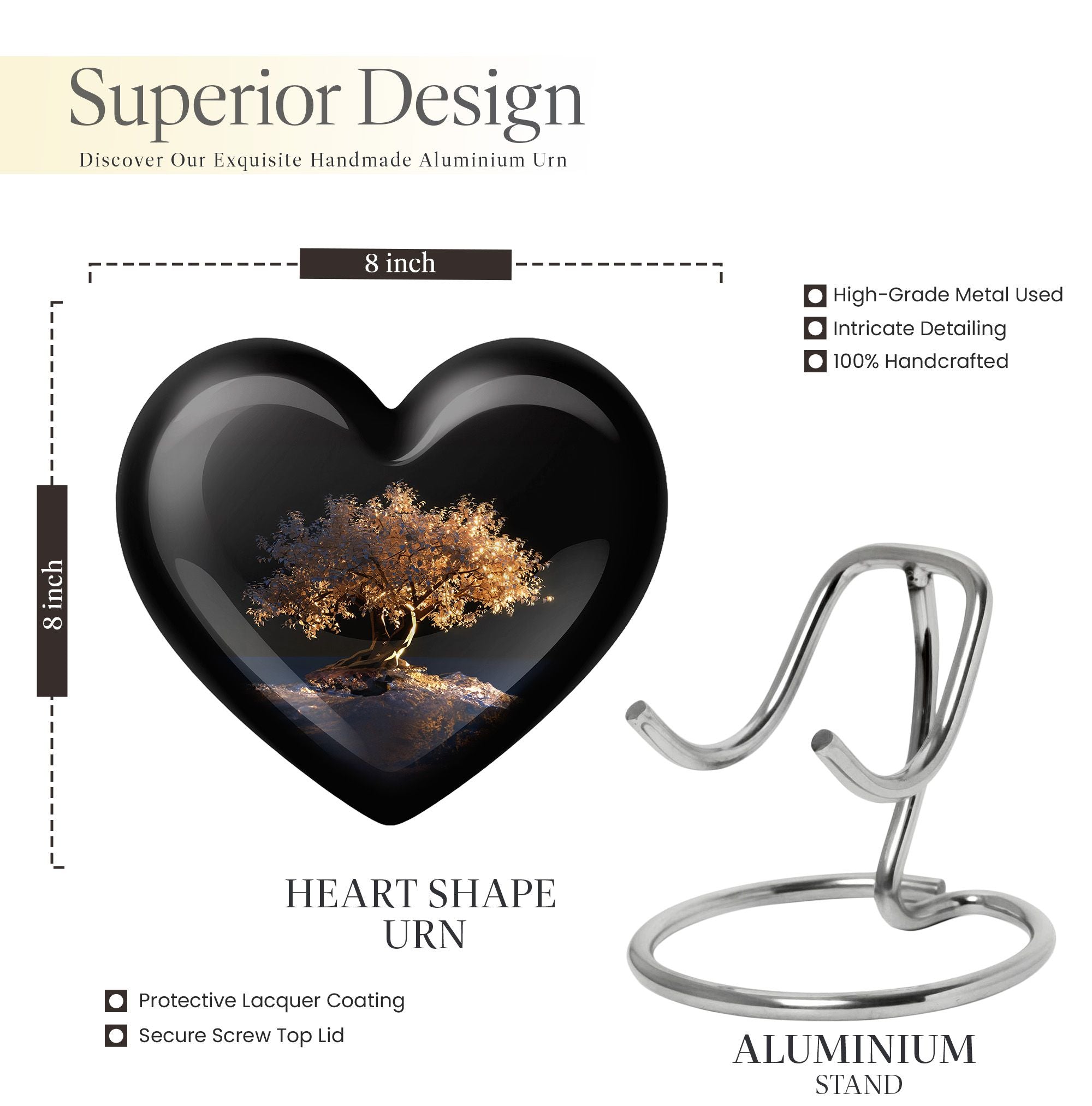 Evoke a sense of peace and reverence with the Tree of Life Urn. This funeral burial urn for adult human ashes is an artistic embodiment of the circle of life. It is a large urn, measuring 10 inches in height and weighing 3.3 pounds. With an abstract theme, this heart urn symbolizes deep love and eternal connection. It is made of high-quality Aluminium, standing as a durable tribute to the departed soul. The urn capacity is a significant 200 cubic inches, suitable for preserving human ashes after cremation. For a unique touch, you may personalize it with engraved names. The package includes a velvet pouch to thoughtfully contain the ashes. This memorial urn intertwines sentiments of loss, remembrance, and a celebration of life. It is a fitting choice for a sacred shelf in your home. Keywords to help you find this are: Burial large urn, human ash, tree of life urn, and cremation urn human ashes.
