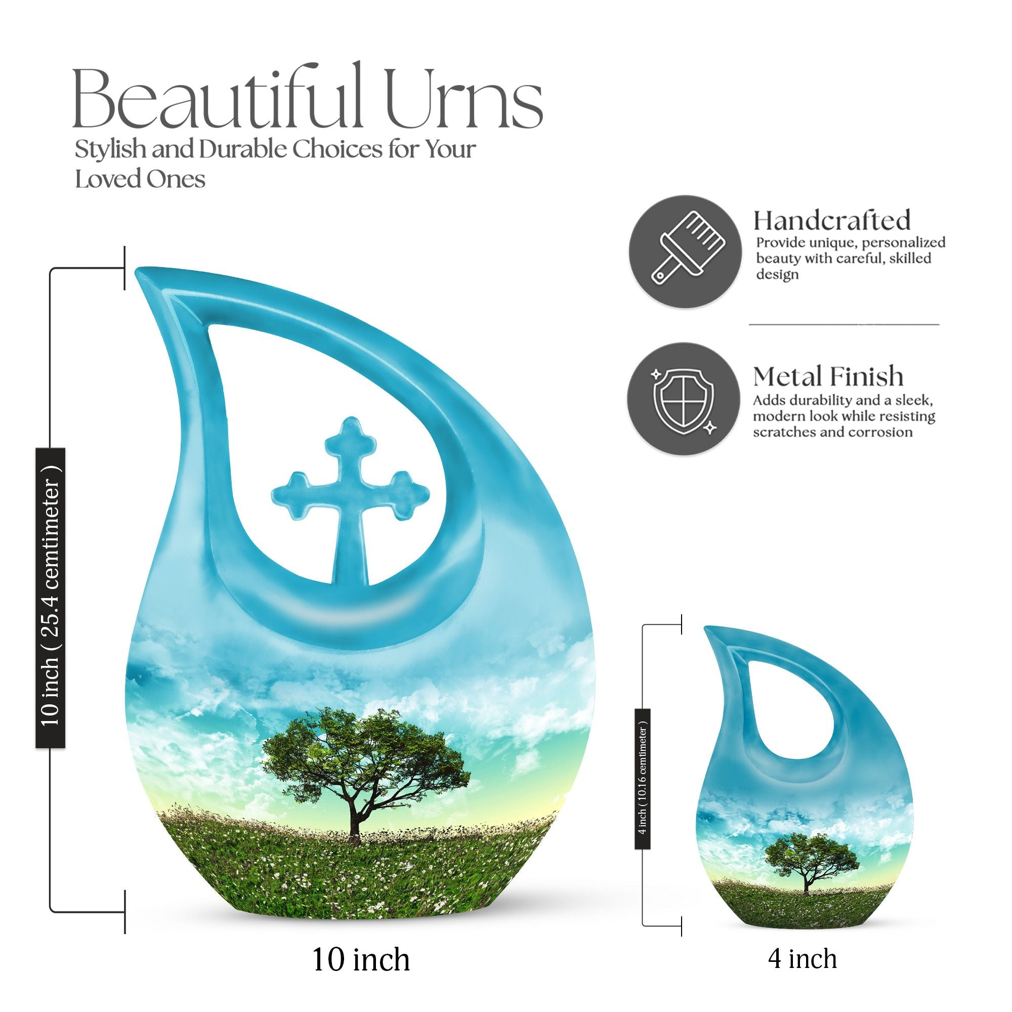 Crafted from durable aluminium, this urn features a serene tree-and-sky design symbolizing hope and the enduring connection between earth and spirit. Its polished finish makes it a meaningful choice for those searching for burial urns for human ashes, cremation urns for burial in ground, or a versatile cremation urn for ashes for ceremonies or home display. The secure screw-top lid ensures long-lasting protection, while the 10-inch size provides ample capacity for families who need burial urns humans, cremation burial urns, or adult burial urns. Matching small options, such as small burial urns for adult human ashes, allow families to share or preserve a portion of ashes.