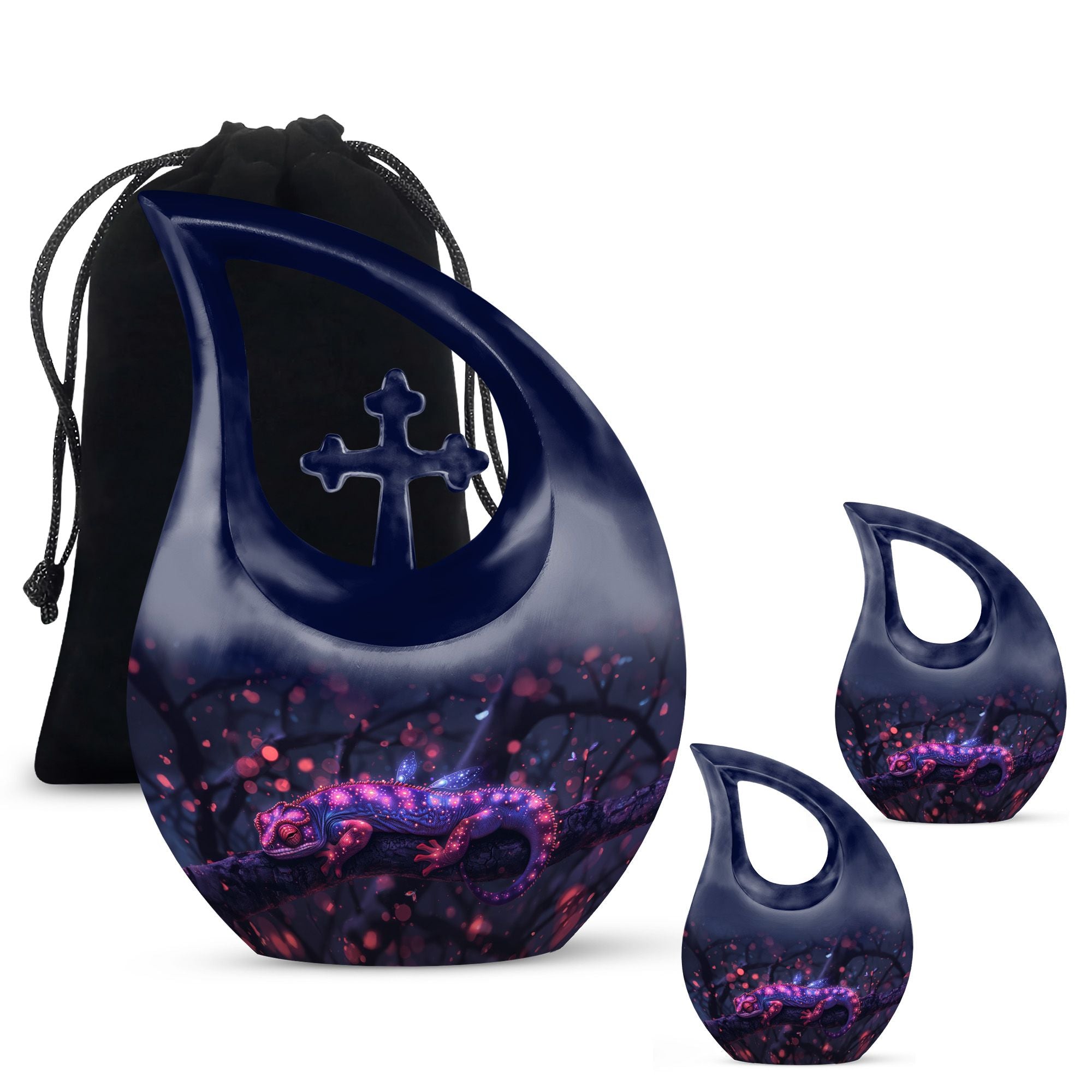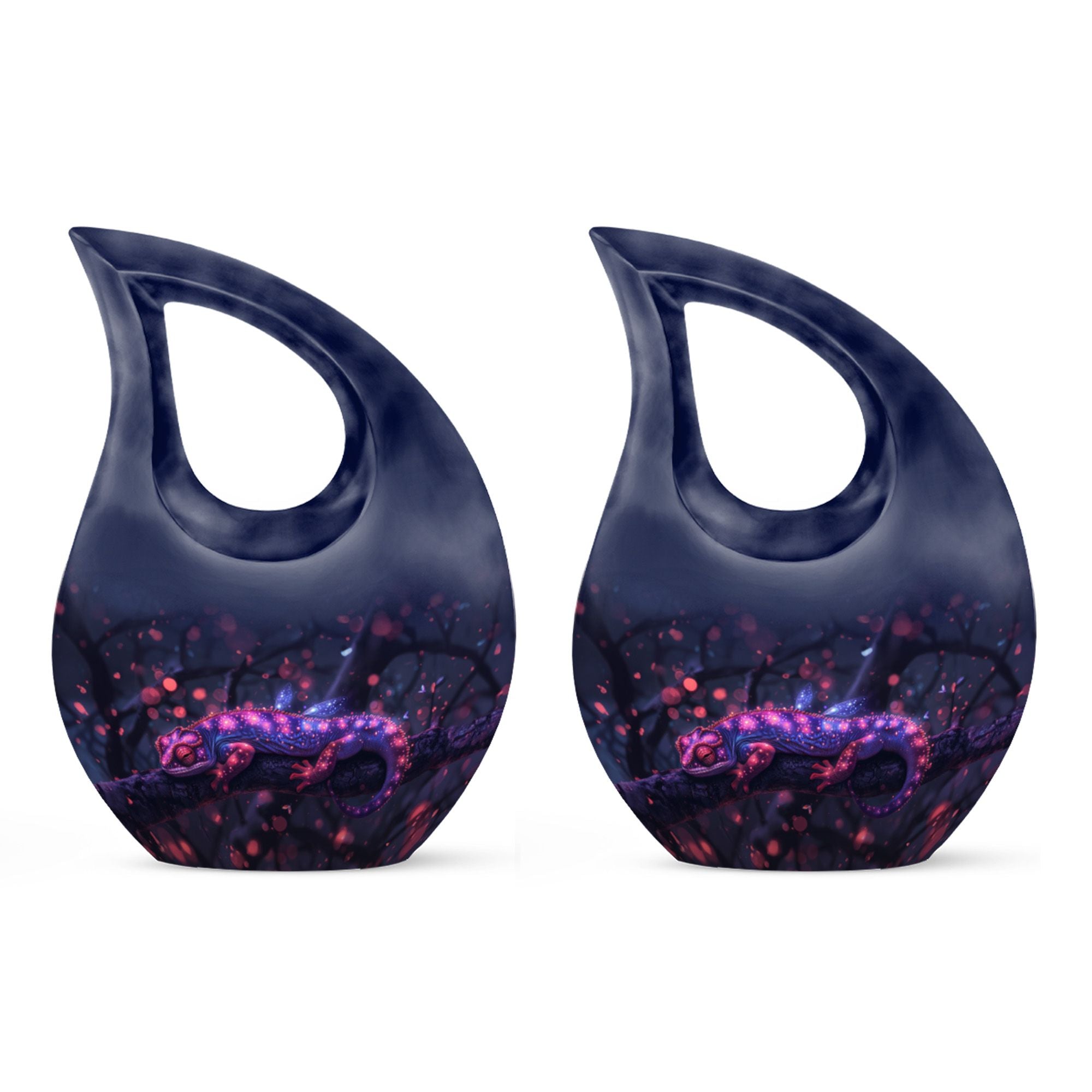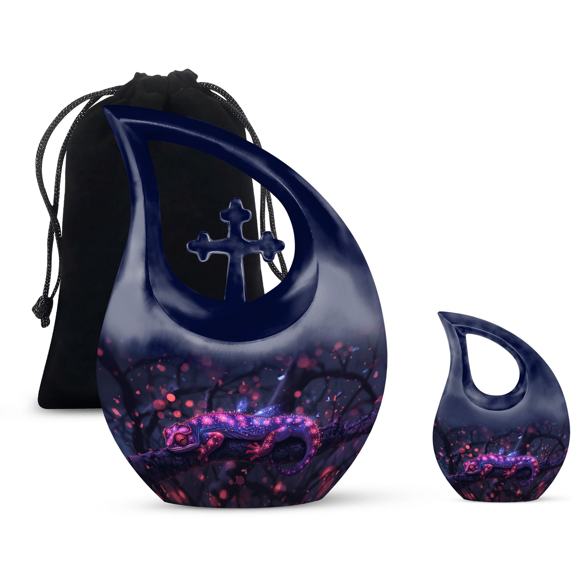 Crafted from high-quality aluminum, this large decorative urn features a striking chameleon perched on a tree, symbolizing resilience, adaptability, and the vibrant journey of life. The vivid colors, smooth finish, and detailed artistry make it a standout choice among cremation urns large, offering both durability and elegance. Its 200-cubic-inch capacity ensures it serves perfectly as a large funeral urn or for families looking for urns for human ashes large with a secure screw-top closure for peace of mind.