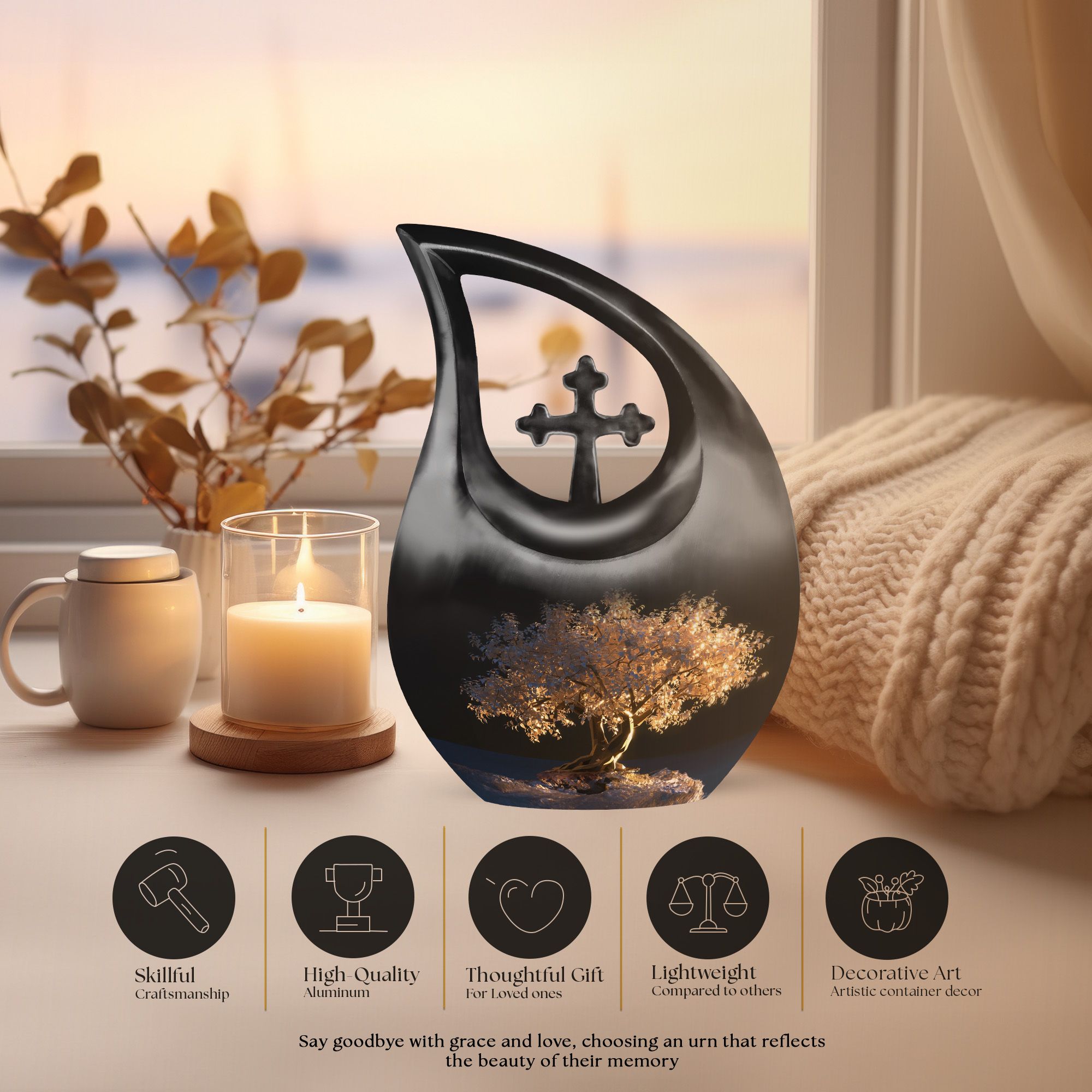 Honor your loved ones and keep their memory alive with this beautifully crafted Tree of Life Urn. The remarkable 10-inch cremation container, embodies a poignant cross drop theme symbolizing the everlasting connection between heaven and earth. Manufactured from high-quality aluminium, it ensures long-lasting preservation. The large urn weighs 3.3 pounds with dimensions of 10 inches in height and has a generous capacity of 200 cubic inches, making it an ideal choice as burial urns or cremation boxes. The package includes a soft velvet pouch to secure the ashes. Customization option enables you to personalize with engraved names, making it one of the best urns for ashes. Intricately designed and profound in its symbolism, this Tree of Life urn provides a dignified and respectful final resting place for your beloved. May it offer comfort and peace in your journey of remembrance.