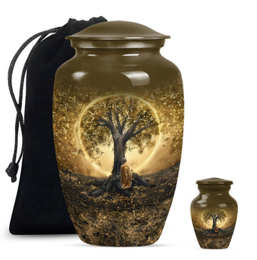 Discover our substantial 'Tree of Life' cremation Urn, an exquisite choice for safeguarding the memories of a loved one. The urn, which is a substantial 10-inch size, exhibits an abstract theme that captivates the viewer's interest. The 'Classic Urn' design brings inherent dignity and respect to this item. It's painstakingly fabricated from high-quality aluminium, lending it a weight of 3.3 pounds and promising exceptional durability. Despite its robust form, the urn gracefully maintains a capacity of 200 cubic inches. To further add personal value, there is a provision to etch engraved names, making this urn a truly bespoke memorial piece. As part of the package, a velvet pouch is provided for the containment of ashes, maintaining thoughtfulness towards the sensitive nature of its function. This cremation urn becomes more than an object; it evolves into a symbol of love, remembrance, and respect. Popularly searched with terms like 'funeral burial urns, memorial large urns for human ashes, and urn human ash urn ash', this product caters to those seeking large urns for adult cremation.