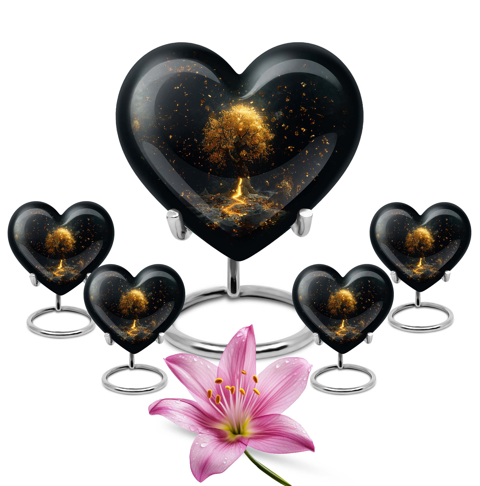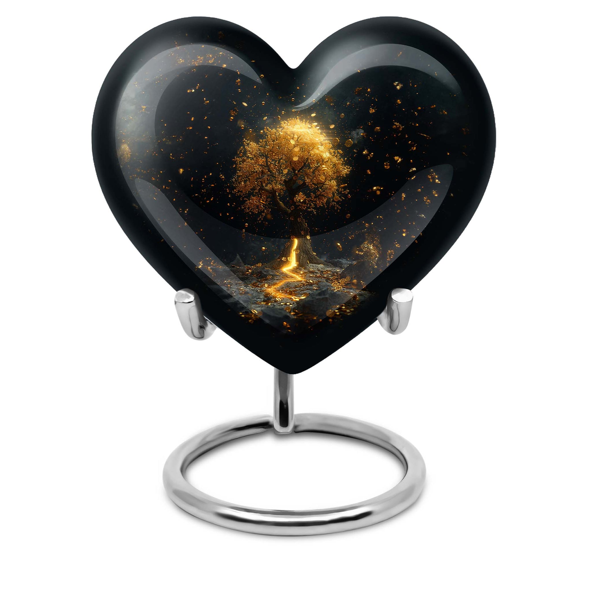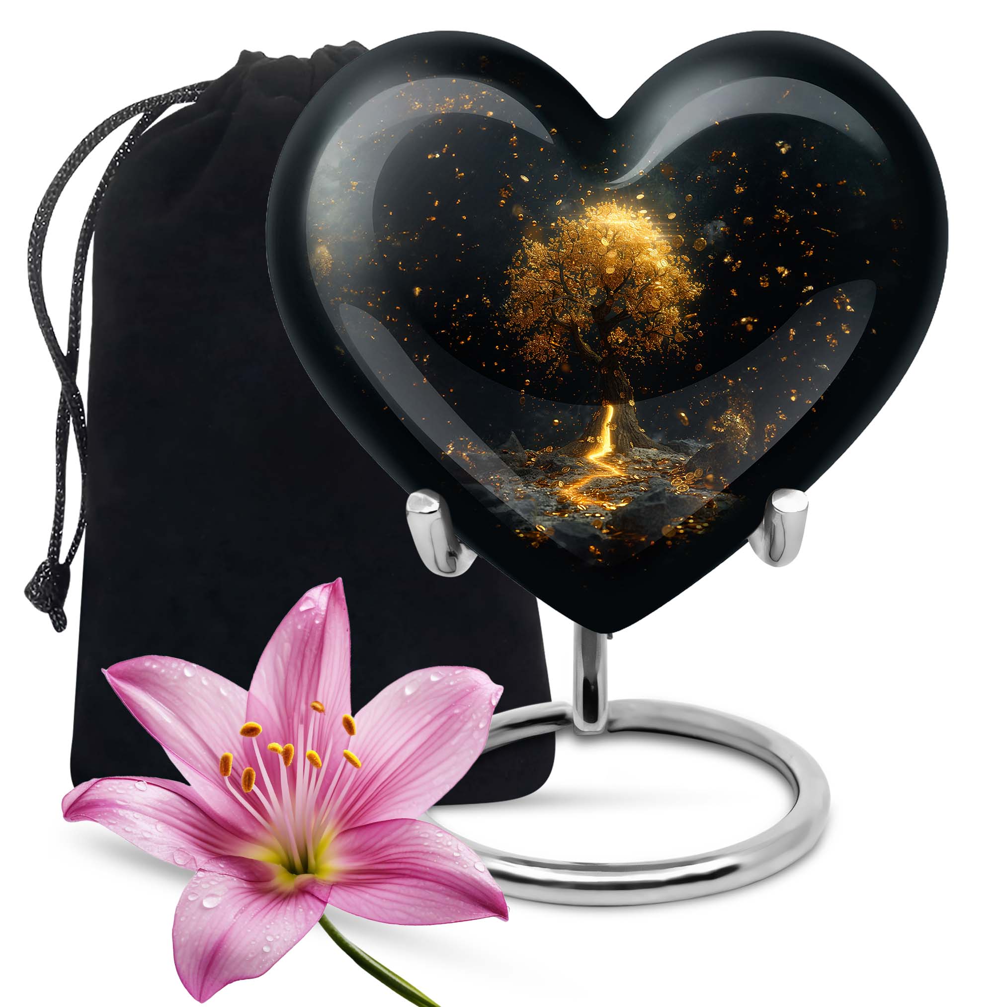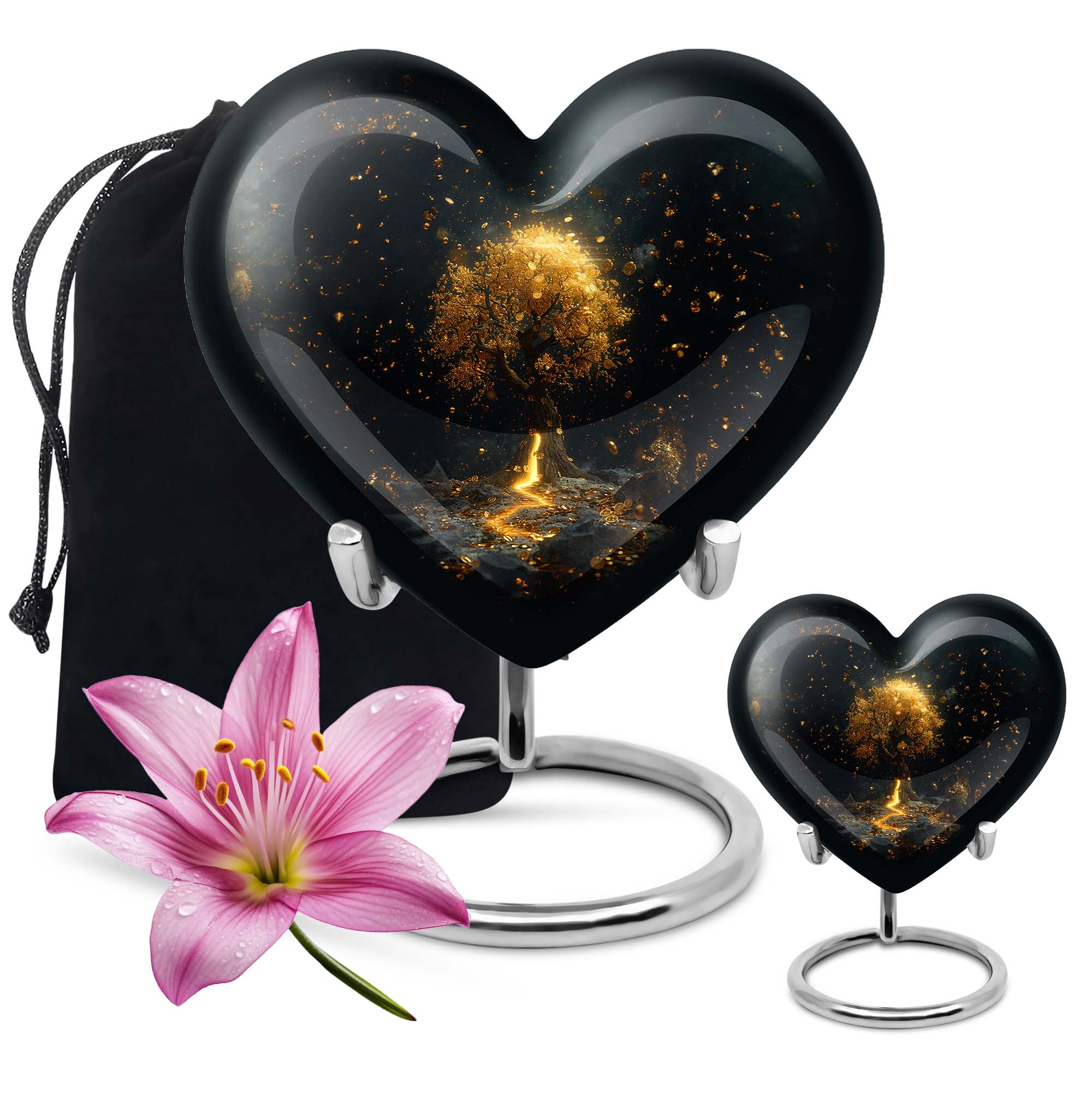 Honor your departed loved one's memory in a meaningful way with the Abstract 10-inch 'Heart Urn' - a symbol of the circle of life and the eternal nature of love. Crafted from robust, high-quality aluminium, our large 'tree of life urn' weighs a substantial 3.3 pounds and stands 10 inches tall. With a capacity of 200 cubic inches, it comfortably holds the ashes of an adult. Its unique 'heart urn' design provides a sense of warmth and comfort during the toughest of times. Personalize this burial ashes urn with engraved names, truly making it a one-of-a-kind tribute. The urn is accompanied by a soft velvet pouch, providing a secure and respectable containment for the ashes. Search phrases that relate to this product encompass 'cremation urns for adult ashes', 'funeral urns', and 'urns for cremation ashes'. This urn embodies the perfect balance between aesthetics and functionality, offering a long-lasting, memorable resting place for your beloved.