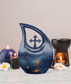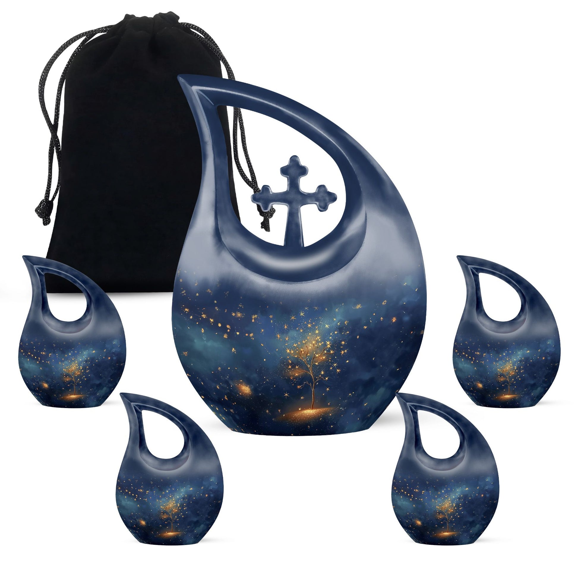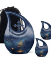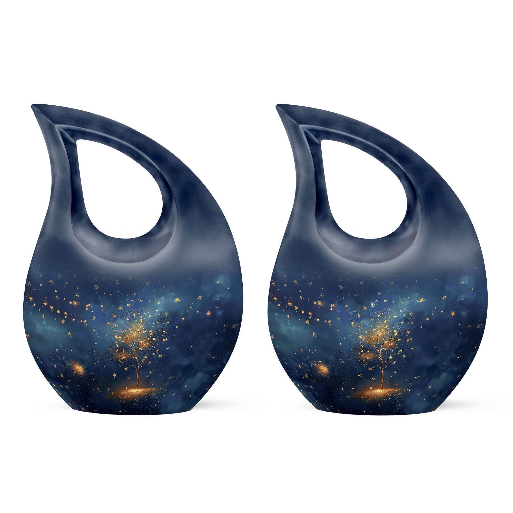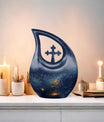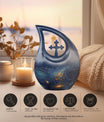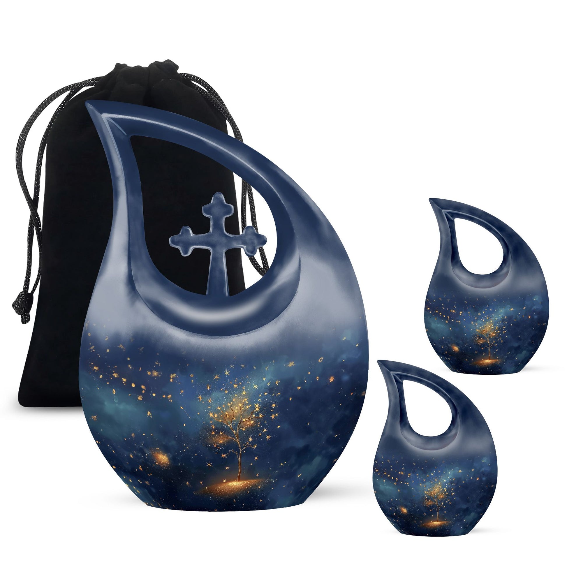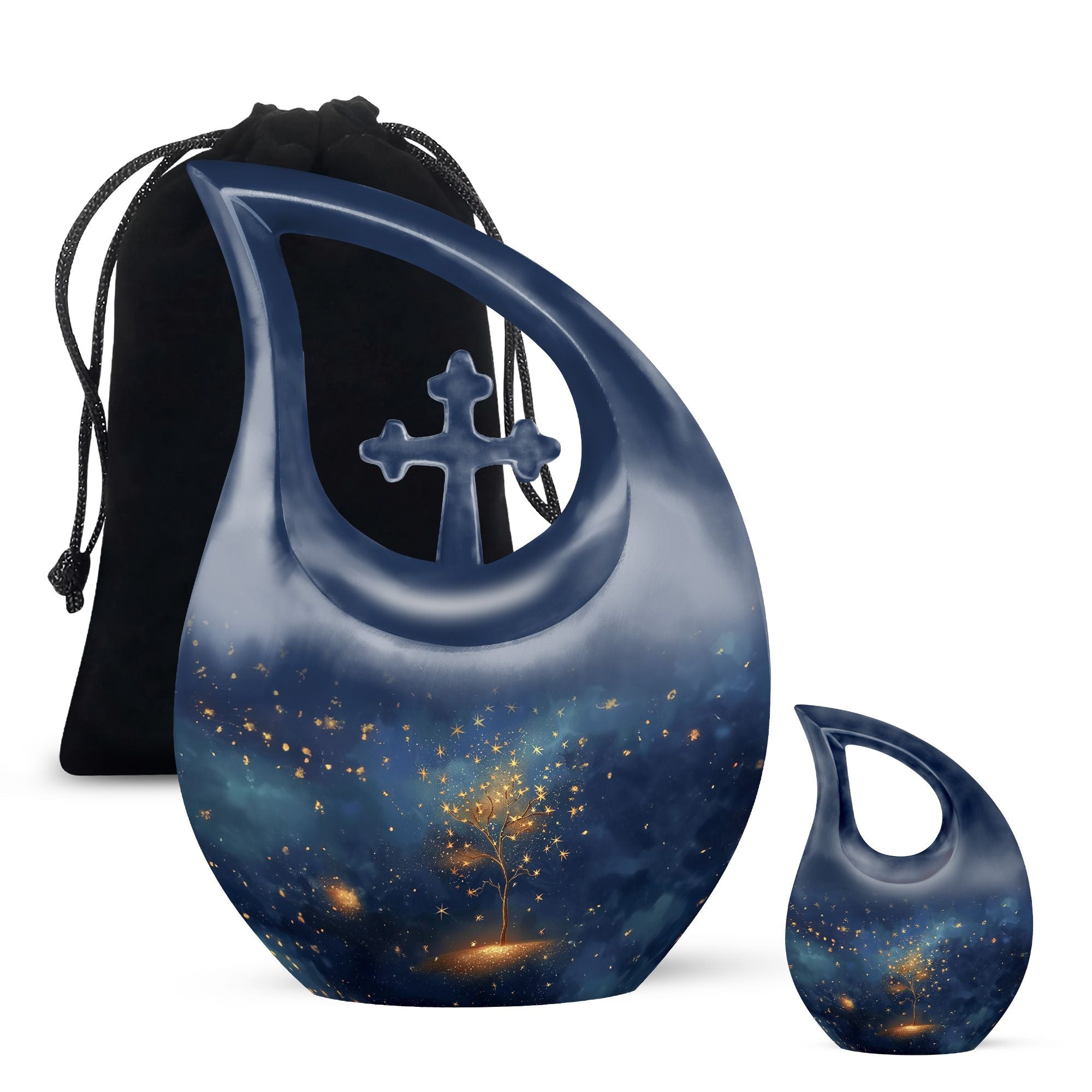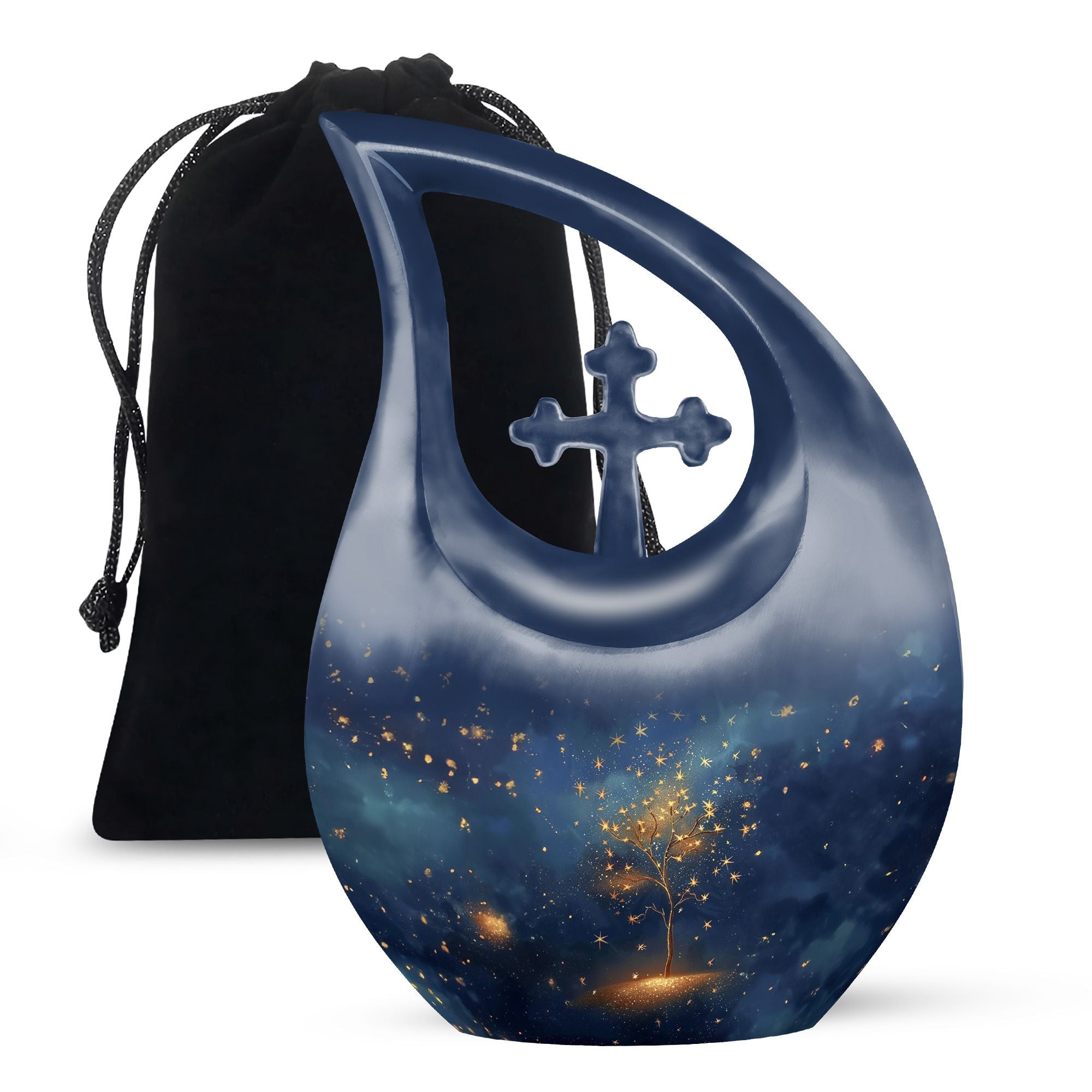 Experience a unique blend of sophistication and reverence with our 10 inch 'Tree Of Life Urn', ensuring an ideal resting place for a loved one. This large urn is characterized by a 'Cross Drop' theme, evoking a sense of tranquility and respect. Weighing just 3.3 pounds, this urn gracefully stands at 10 inches in height and offers ample space for containment with a capacity of 200 cubic inches. Masterfully crafted from premium aluminium, it offers enduring strength and durability. Adding a personal touch to this precious memorial piece, we offer the option to customize it further by engraving names. Alongside the urn, you receive a soft velvet pouch, ensuring a respectful containment of ashes. Use 'Cremation Containers', 'Cremation Boxes', 'Cremation Urns', 'Burial Urns', 'Memorial Urns', 'Best Urns for Ashes' to discover this product. Dive into the realm of ethereal beauty and remembrance with this 'Tree Of Life Urn'.