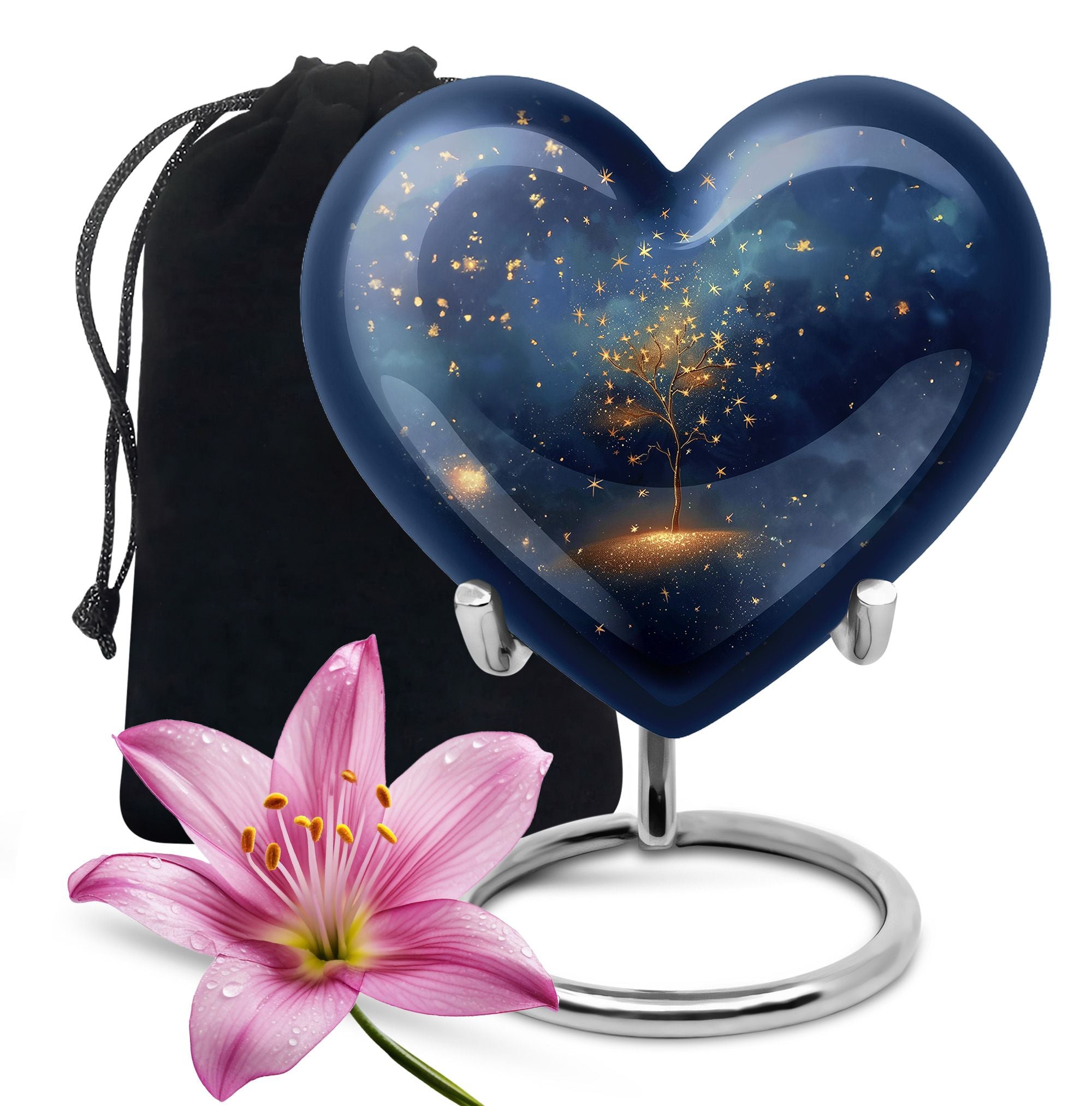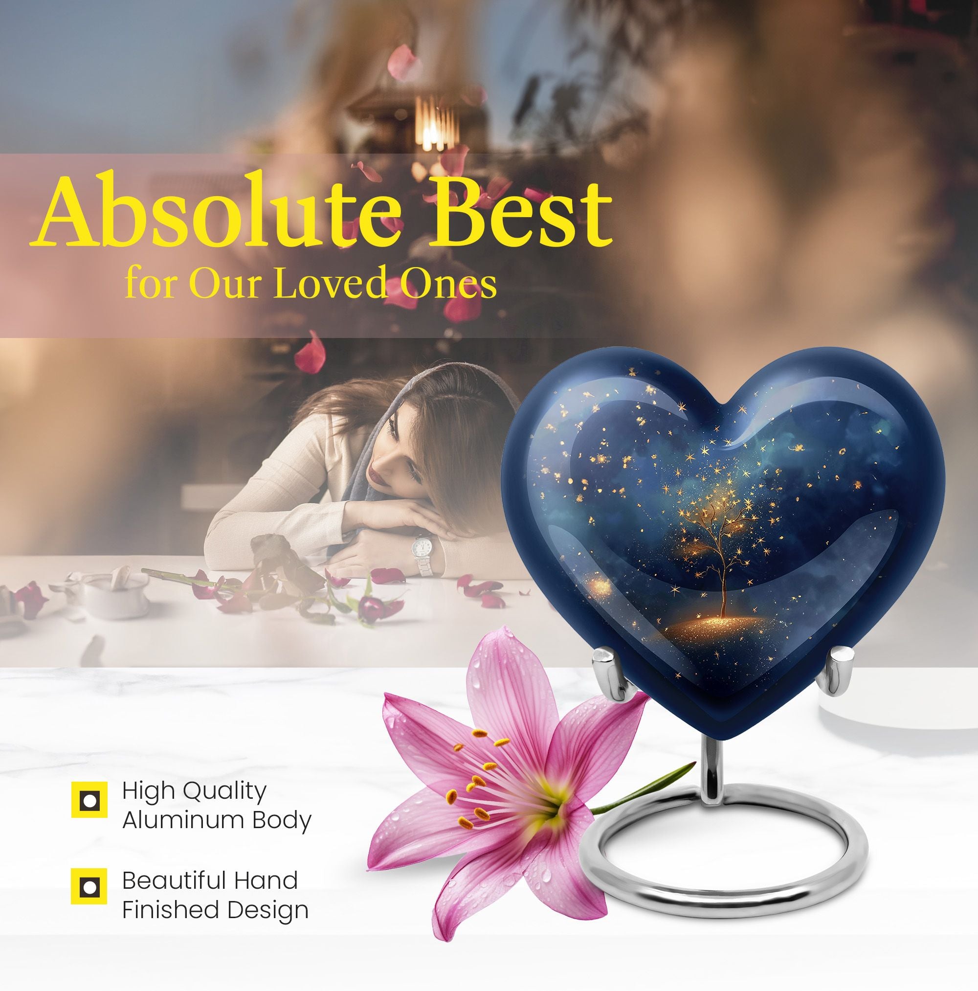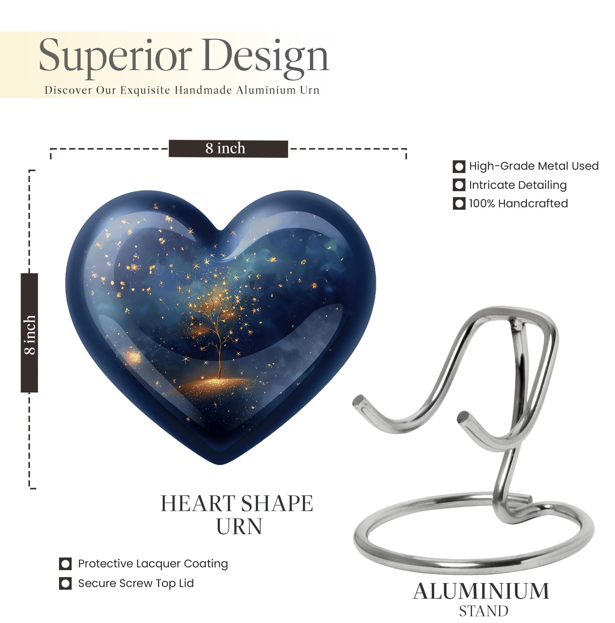 Immerse in the serene beauty of our Tree of Life Urn, a fitting tribute for a cherished life. Specifically designed as burial large urns, these memorial urns make a statement with its heart urn style. Measuring 10 inches in height, it provides ample space with a capacity of 200 cubic inches, comfortably accommodating adult ashes. Crafted with precision, the urn weighs 3.3 pounds, depicting durability and quality, and its aluminum material ensures longevity. Our package includes an elegant velvet pouch for gentle containment of ashes. Embrace the special touch with the option to personalize by engraving names. Embodying an abstract theme, this large-sized urn keeps memories alive in a profoundly graceful manner. Ideal for 'memorial urns for ashes adult male', 'funeral extra large urn', 'keeping the human urn ashes', and 'cremation urns for adult ashes women' searches. Take solace in this beautiful remembrance.