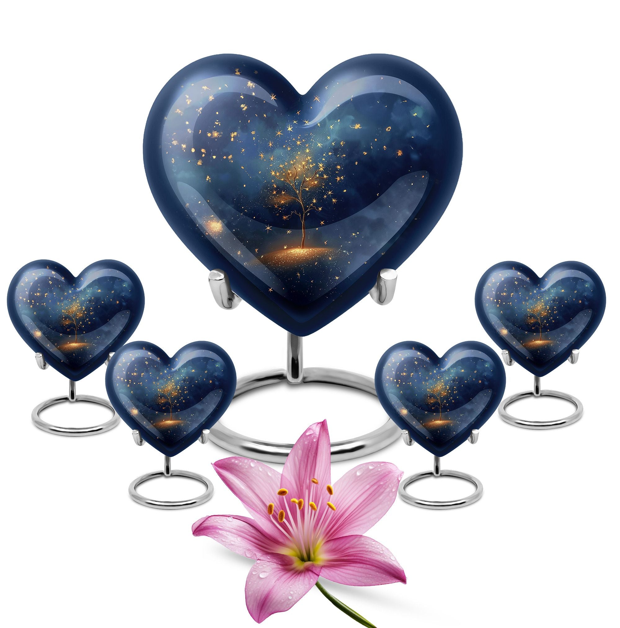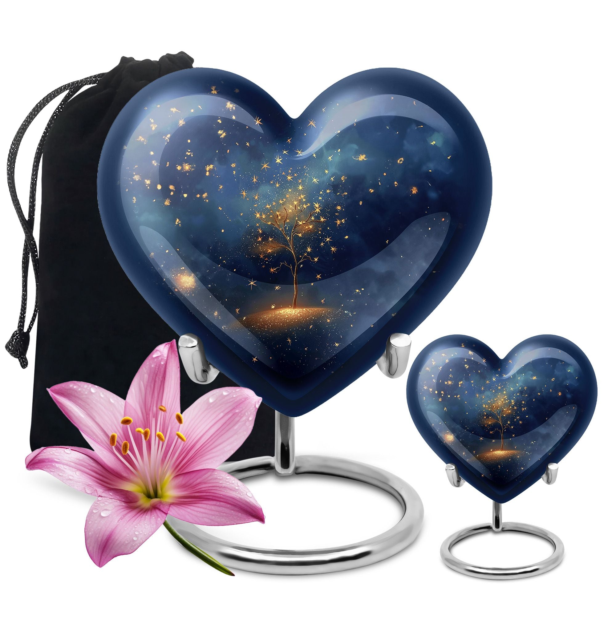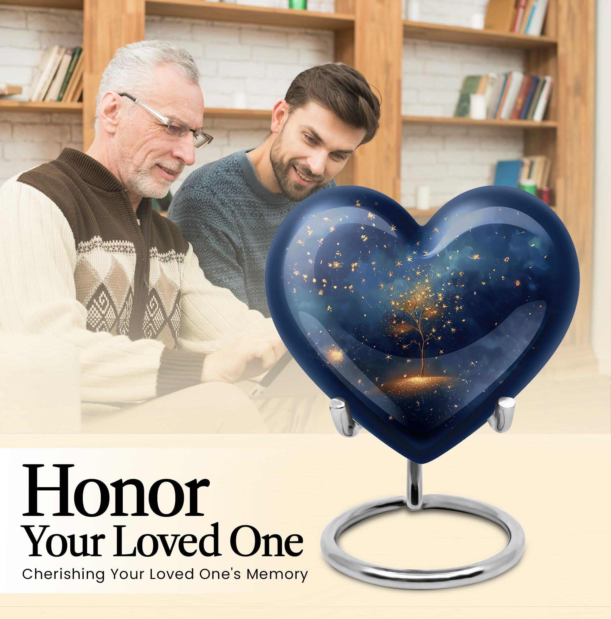 Immerse in the serene beauty of our Tree of Life Urn, a fitting tribute for a cherished life. Specifically designed as burial large urns, these memorial urns make a statement with its heart urn style. Measuring 10 inches in height, it provides ample space with a capacity of 200 cubic inches, comfortably accommodating adult ashes. Crafted with precision, the urn weighs 3.3 pounds, depicting durability and quality, and its aluminum material ensures longevity. Our package includes an elegant velvet pouch for gentle containment of ashes. Embrace the special touch with the option to personalize by engraving names. Embodying an abstract theme, this large-sized urn keeps memories alive in a profoundly graceful manner. Ideal for 'memorial urns for ashes adult male', 'funeral extra large urn', 'keeping the human urn ashes', and 'cremation urns for adult ashes women' searches. Take solace in this beautiful remembrance.