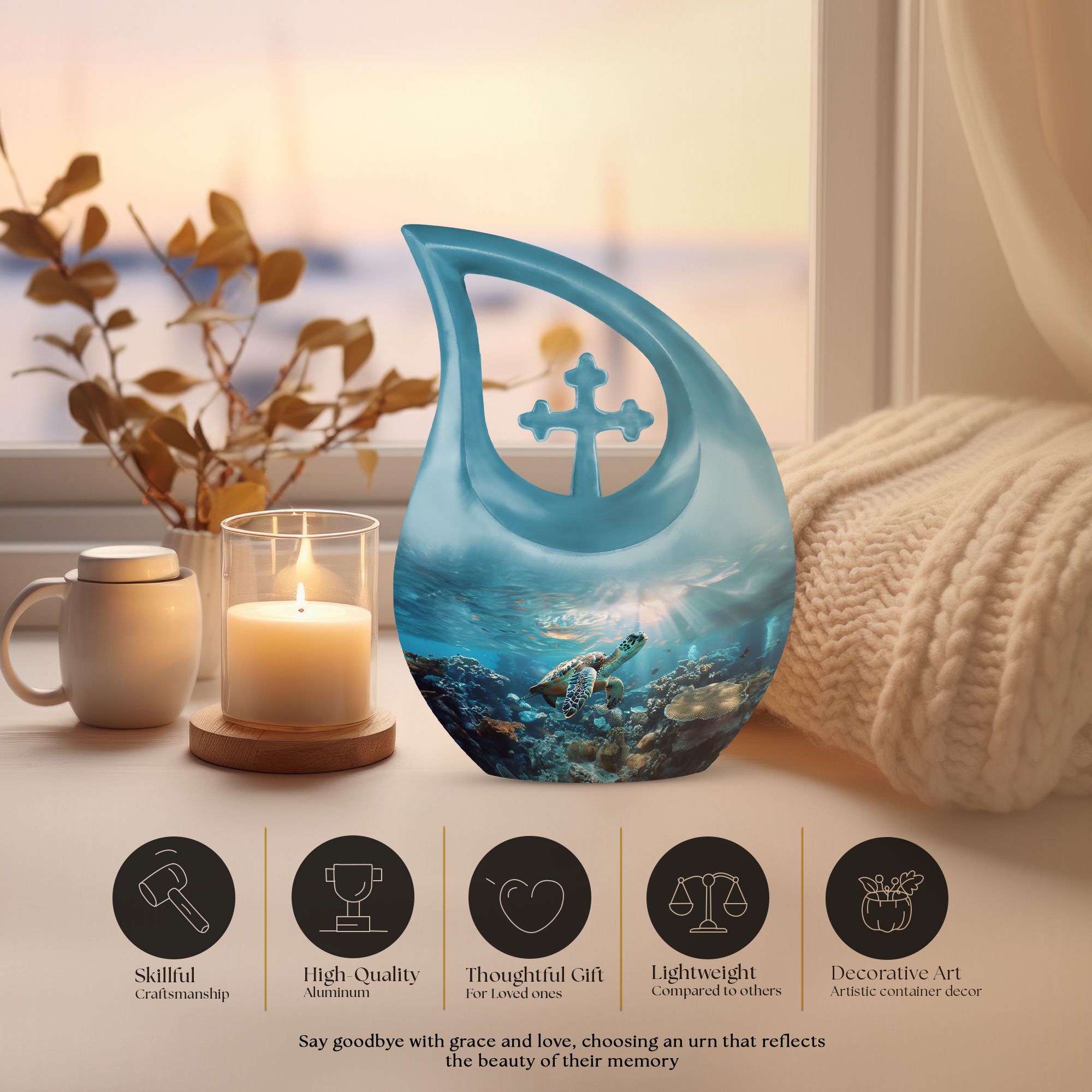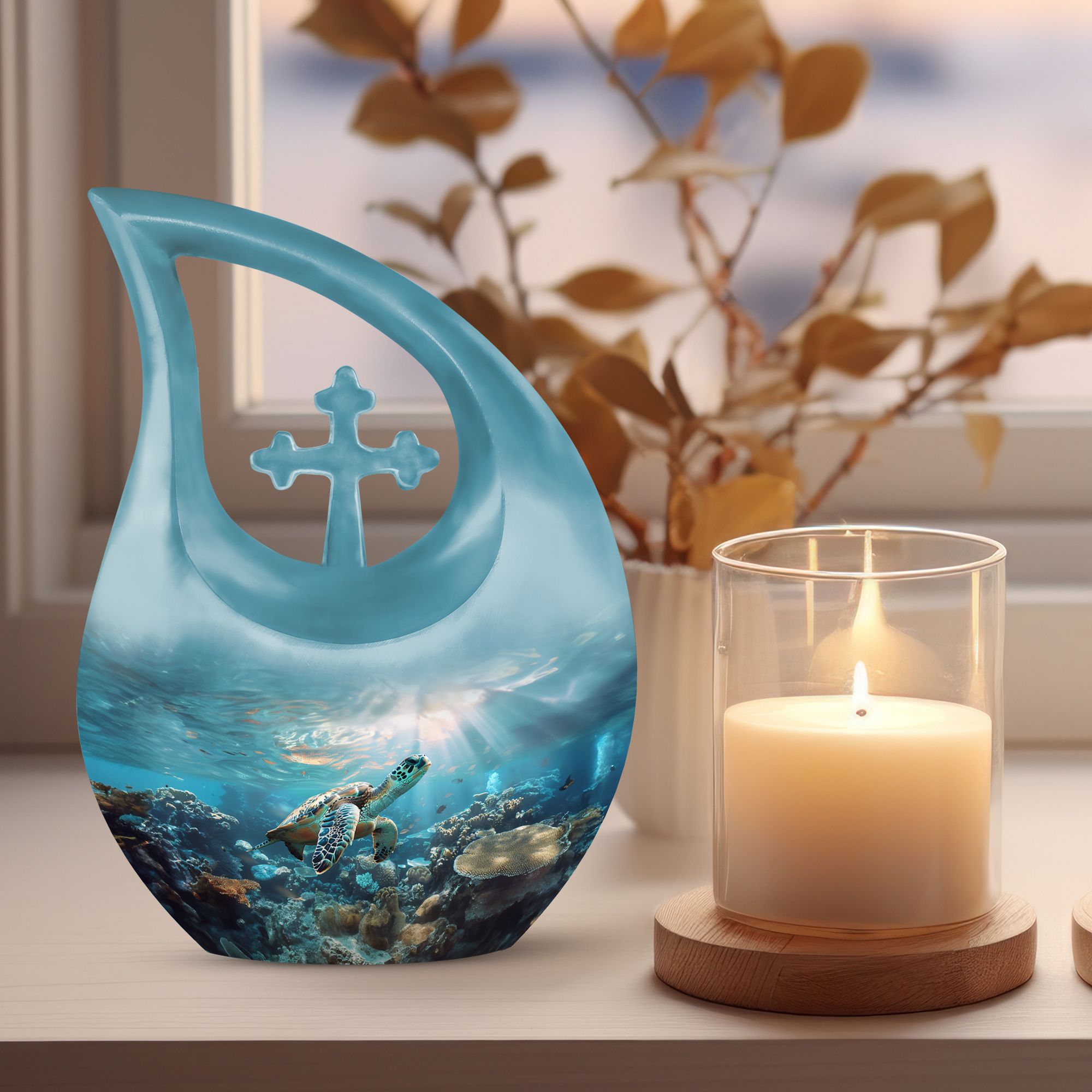 Celebrate a soul who found peace in the sea with the Ocean Spirit Sea Turtle Urn, a stunning tribute that captures the calm, beauty, and freedom of ocean life. This elegant Cremation Urn For Adult Ashes features a detailed sea turtle gliding through a coral reef under golden rays of sunlight — a powerful symbol of endurance, protection, and a life well-lived.