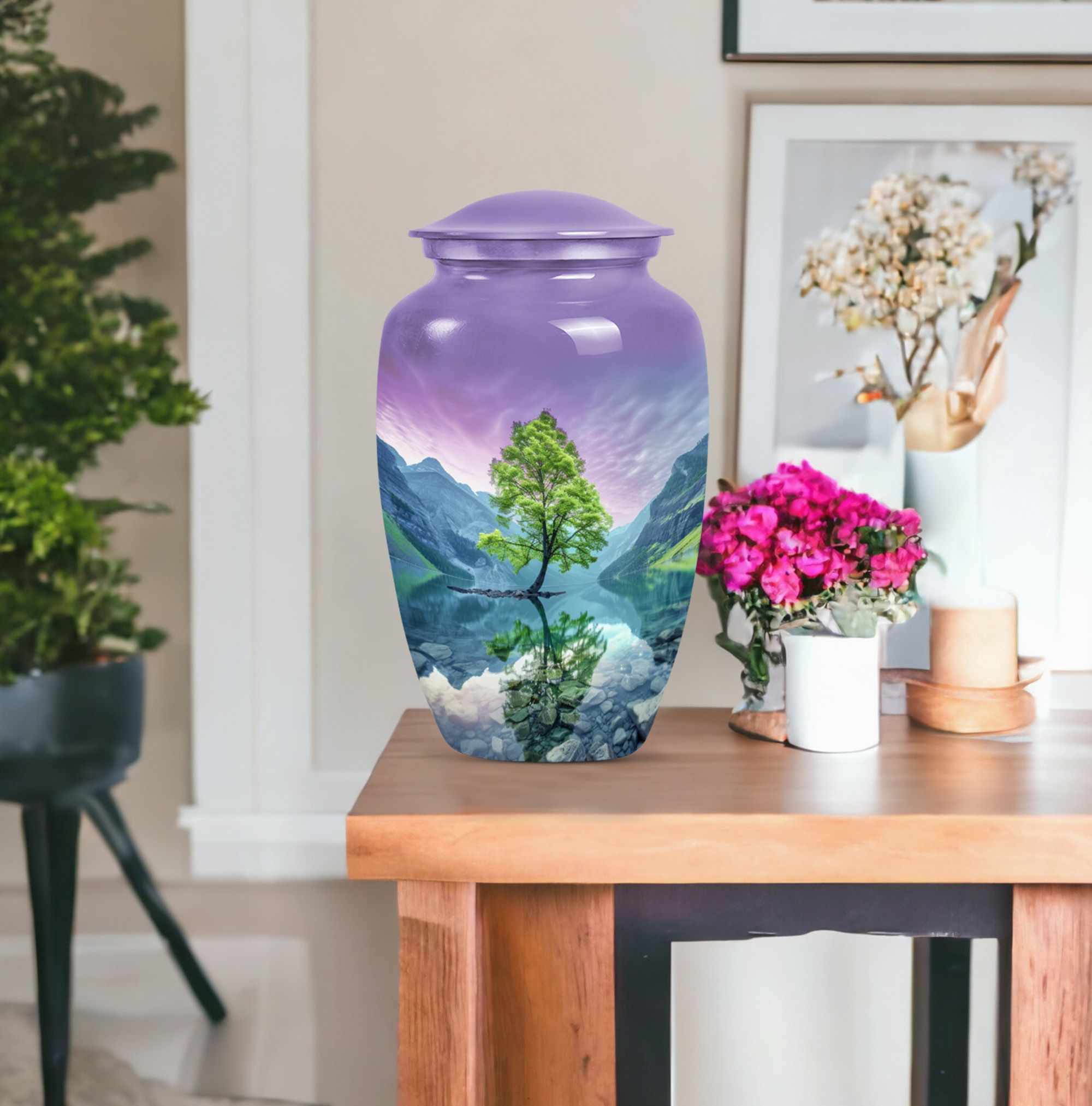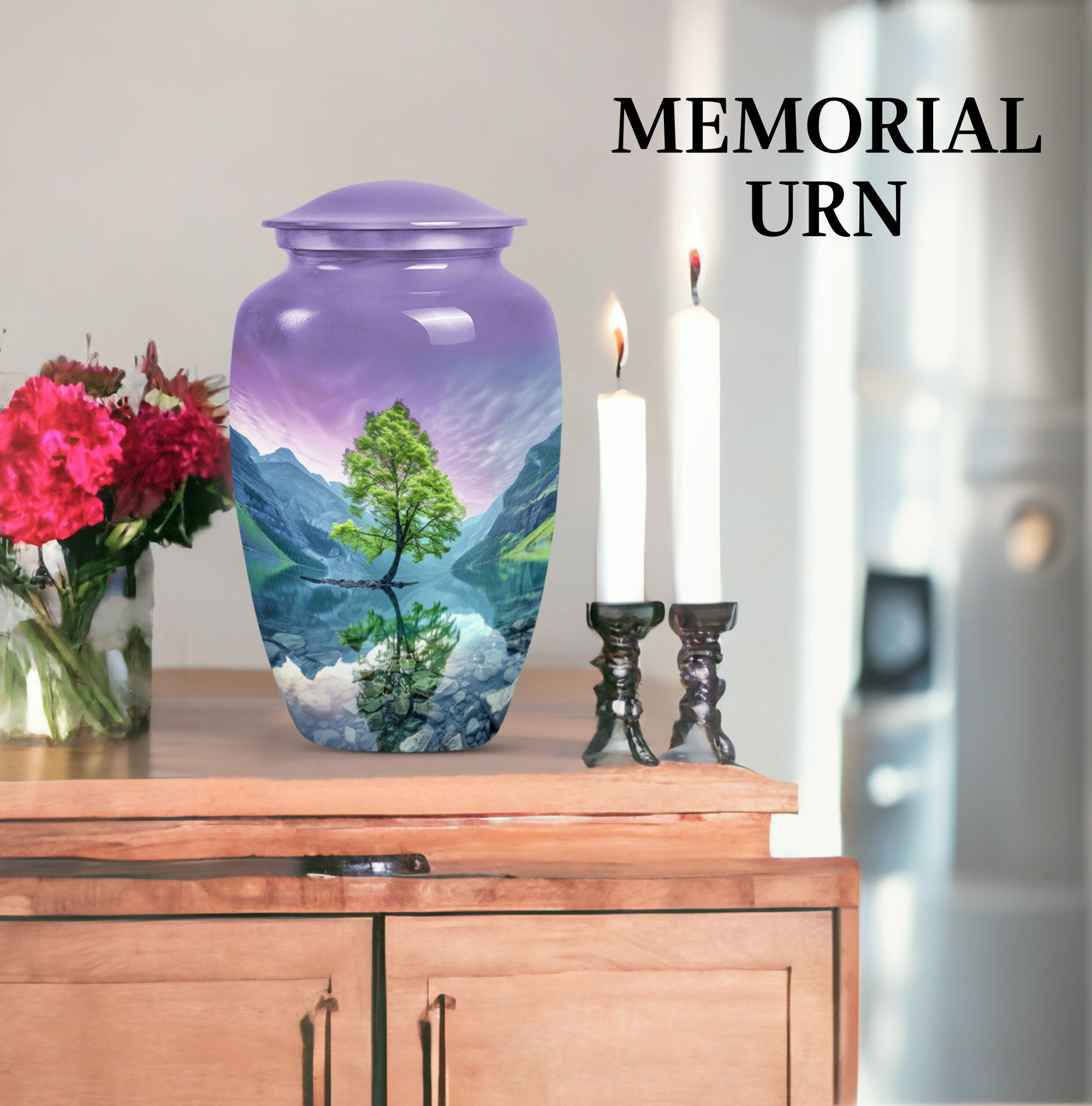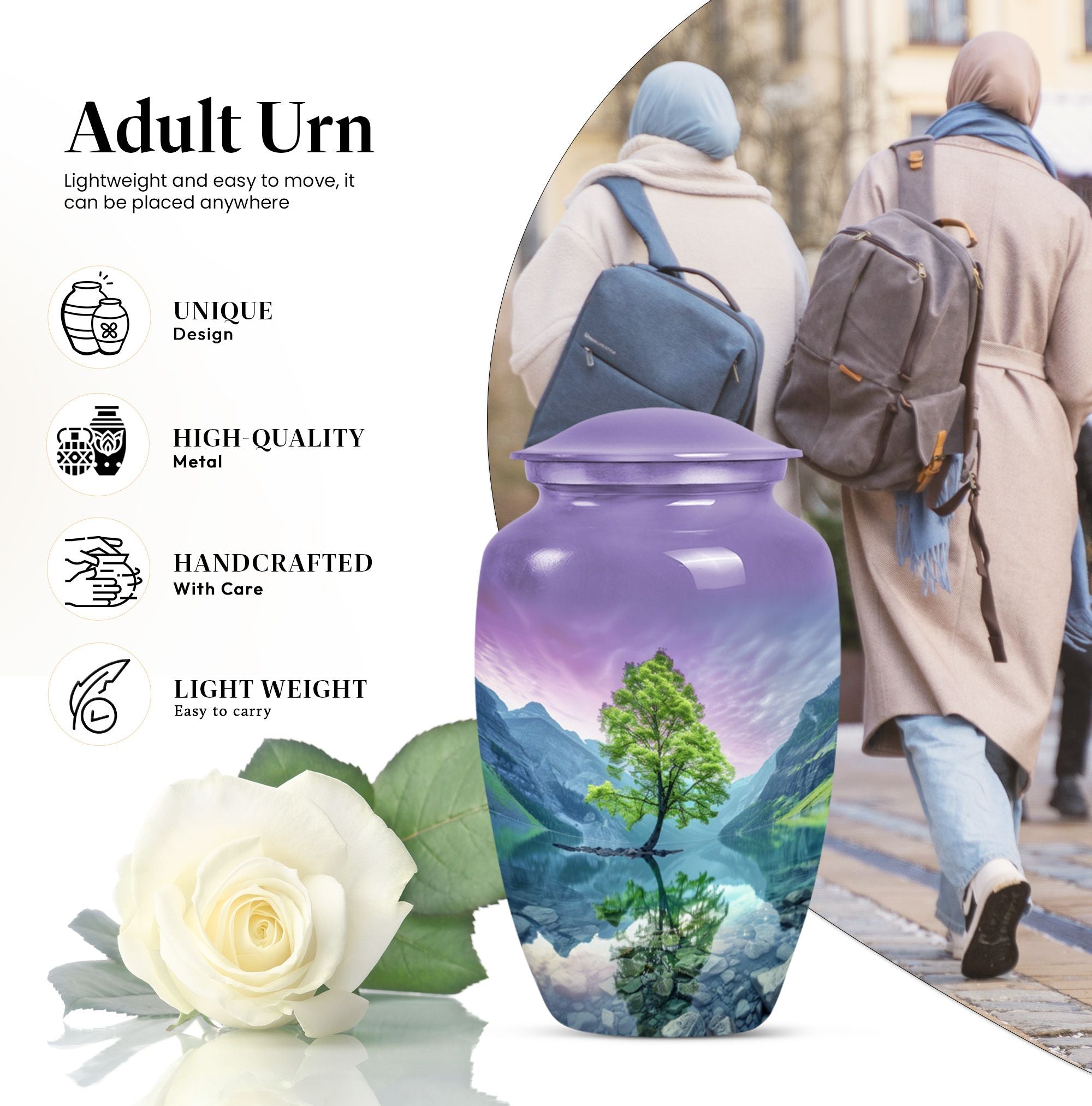Engage in the utmost reverence towards your departed loved ones with the aurora borealis urn, a timeless piece of solemn beauty for remembrance. This burial urn for cremation ashes is crafted for adults and carries a substantial capacity of 200 cubic inches. Tangible and solemn at 10 inches in height and weighing 3.3 pounds, this urn functions as a large, substantial memorial for your parent. Crafted from high-quality aluminium, its durability ensures it stands as a lasting tribute for your loved ones. Its design theme features an elegant butterfly, reflecting transformation and grace, symbolic of your loved one's journey. This urn even offers customization, providing an option to personalize with engraved names for a unique touch. A velvet pouch accompanies the urn for secure containment of ashes. Ideal for both men and women, this compact urn is an excellent choice for urban homes. An offering from the memorial urns collection, the aurora borealis urn serves as a cherished receptacle for your loved one’s ashes, providing a fitting tribute for their memory.