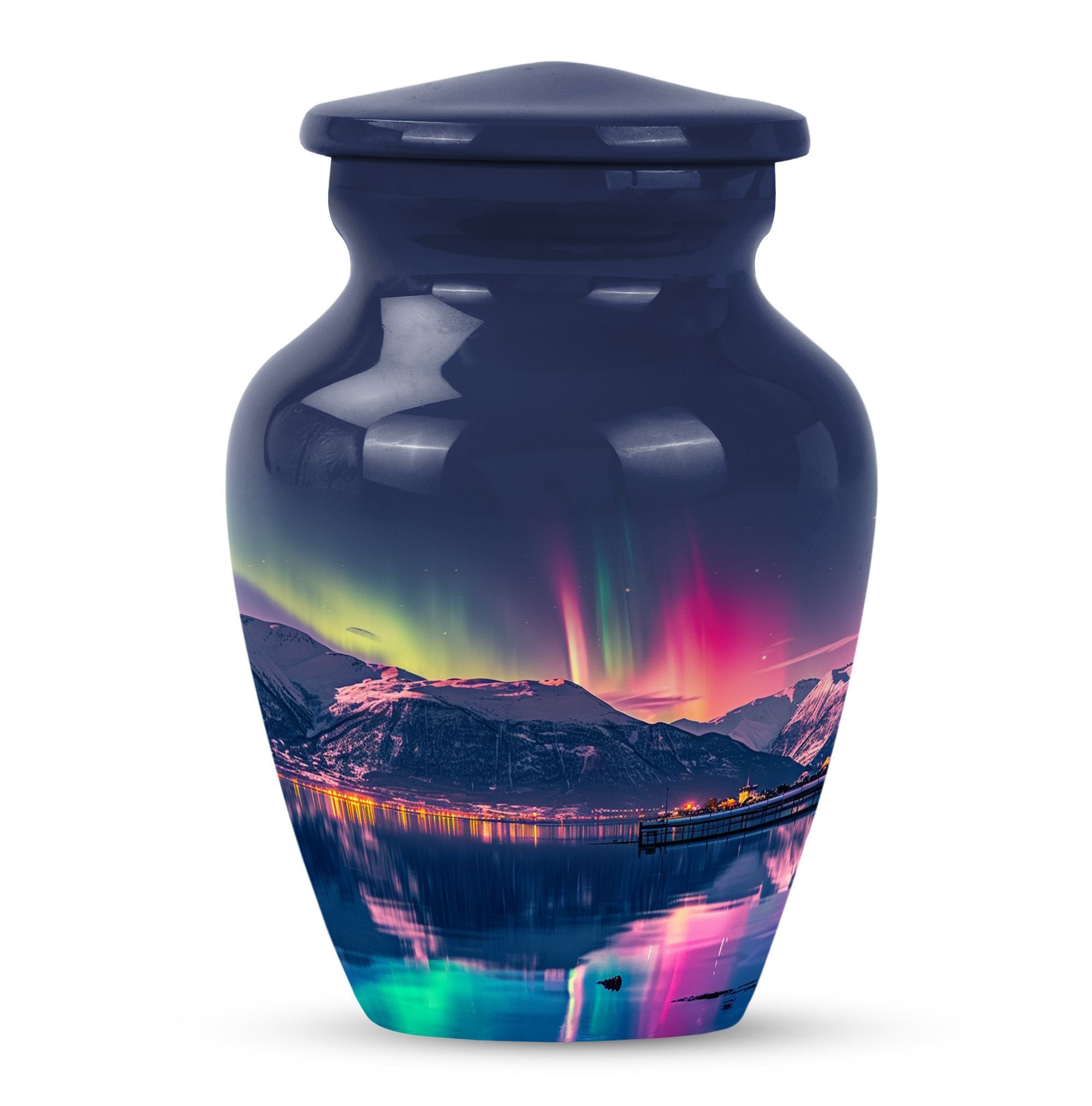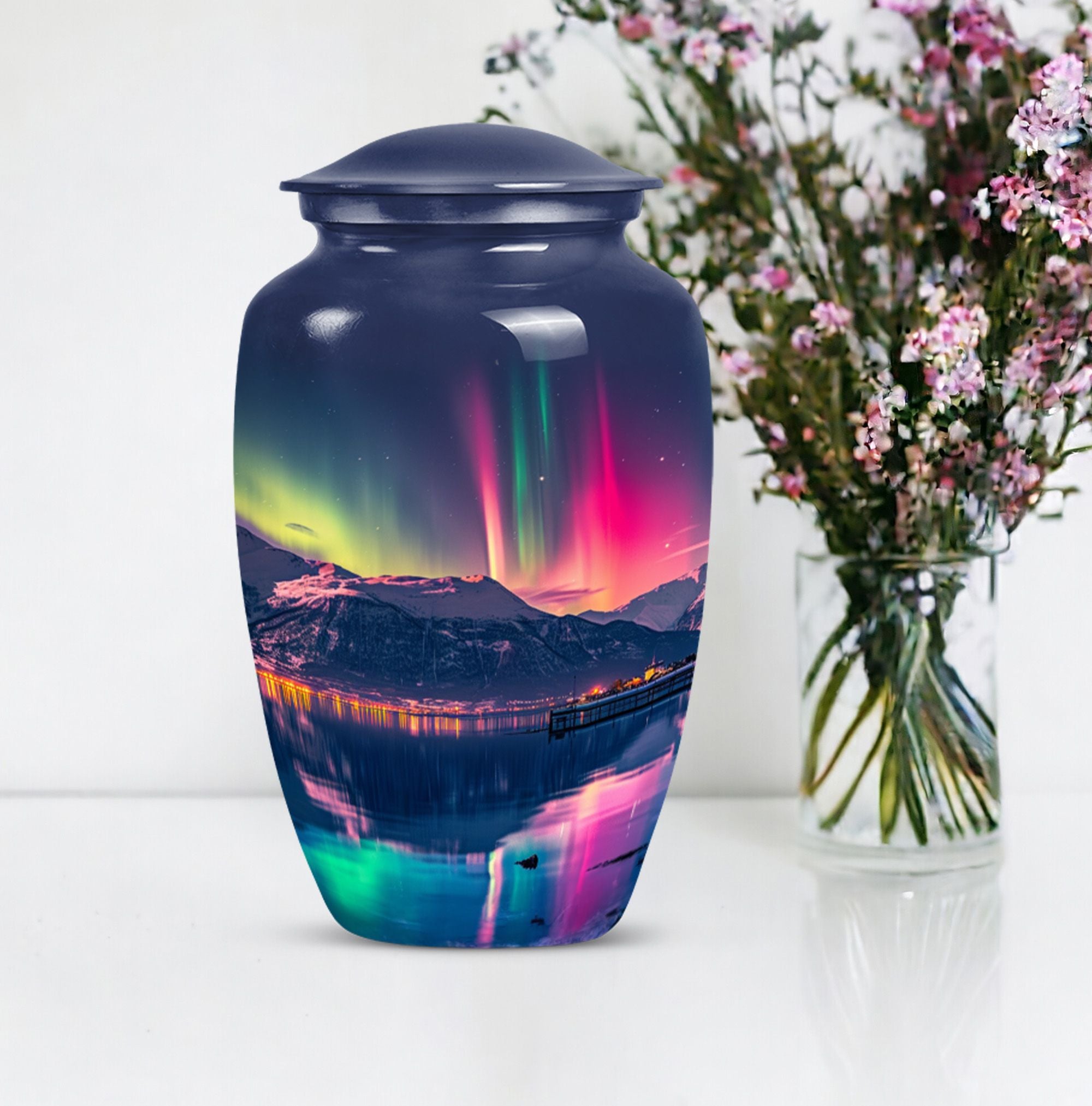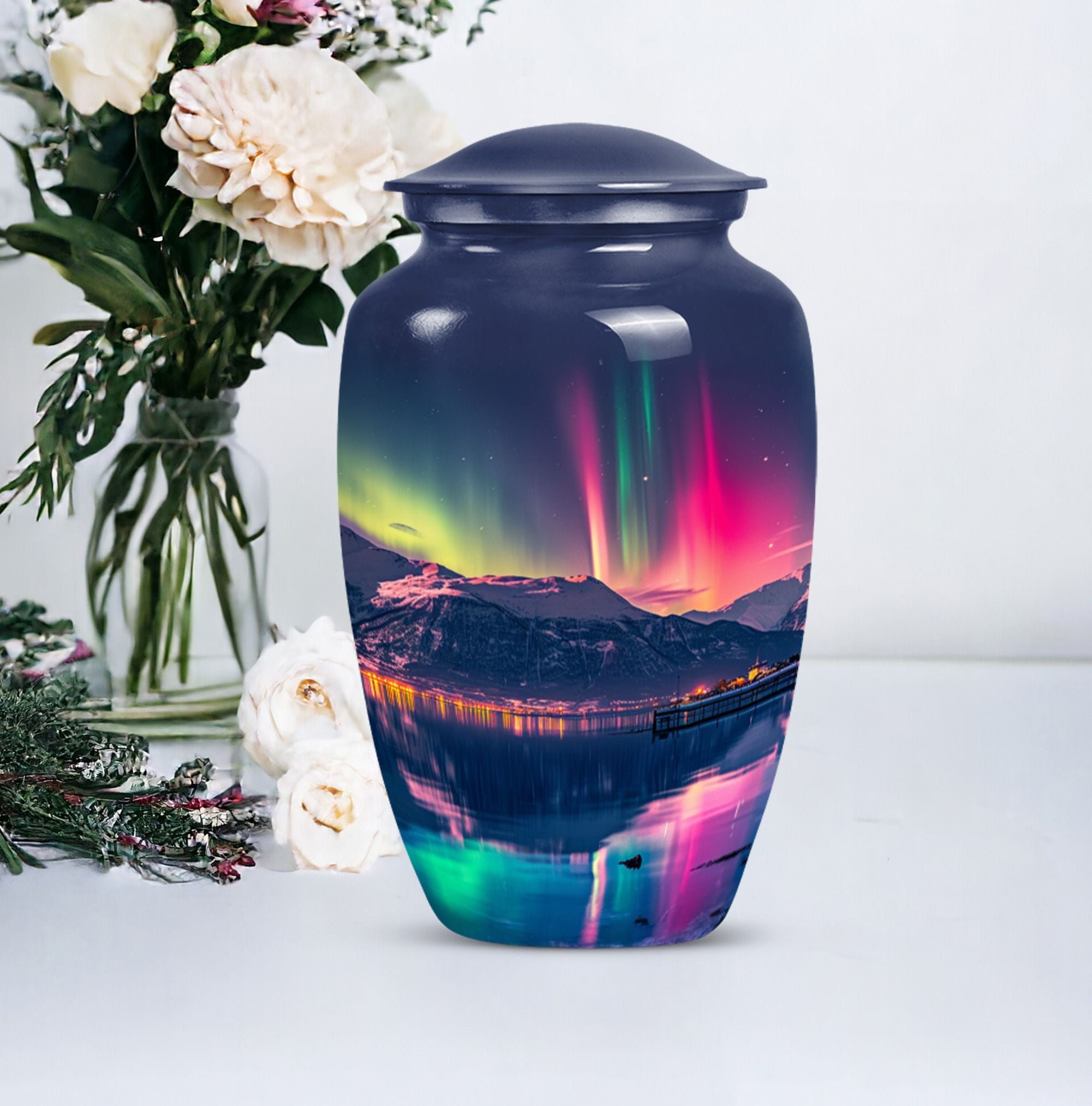 Cherish lost loved ones with the striking AURORA Urn, a timeless tribute in the form of large urns designed exclusively for adult ashes. This abstract-themed aluminium urn is a dignified approach to memorialization with its classic design, measuring 10 inches in height. Weighing a manageable 3.3 pounds, the urn has an impressive capacity of 200 cubic inches, enough to securely hold the ashes of adult individuals. If you wish, you can add a personal touch by engraving names on the urn. Each urn comes with a velvet pouch that securely contains the ashes within the urn, adding an elegant touch. Not just an urn, but a cherished artwork that elegantly keeps memories alive. The perfect blend of sentimentality and style for your memorial needs. Ideal for human ashes, it is an appropriate selection for both men and women. Such finely crafted memorial urns will serve as the perfect final resting place for your beloved. NOTE: This urn does not focus on design but rather on the thoughtful utility and the raw beauty of its classic urn form.