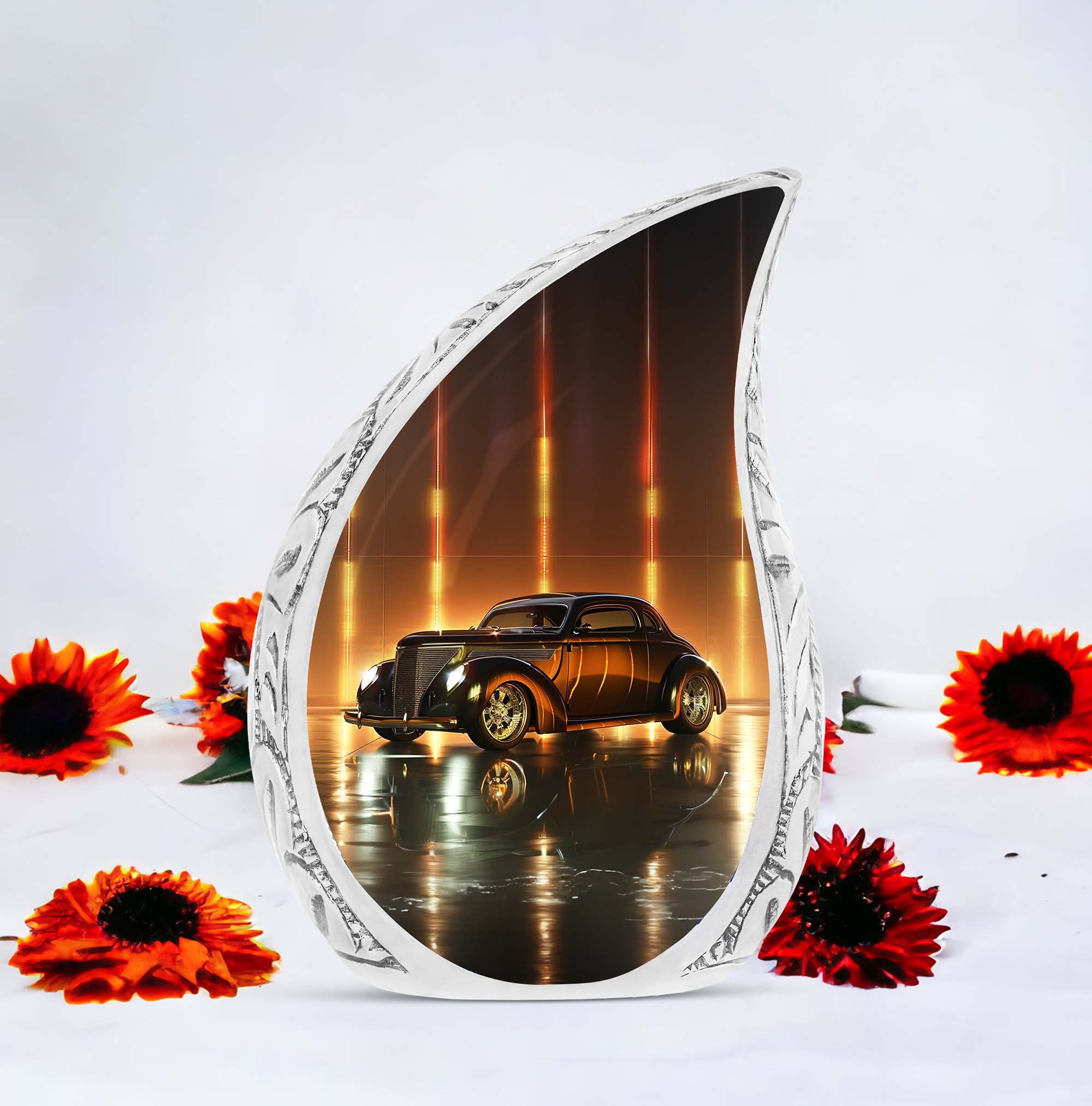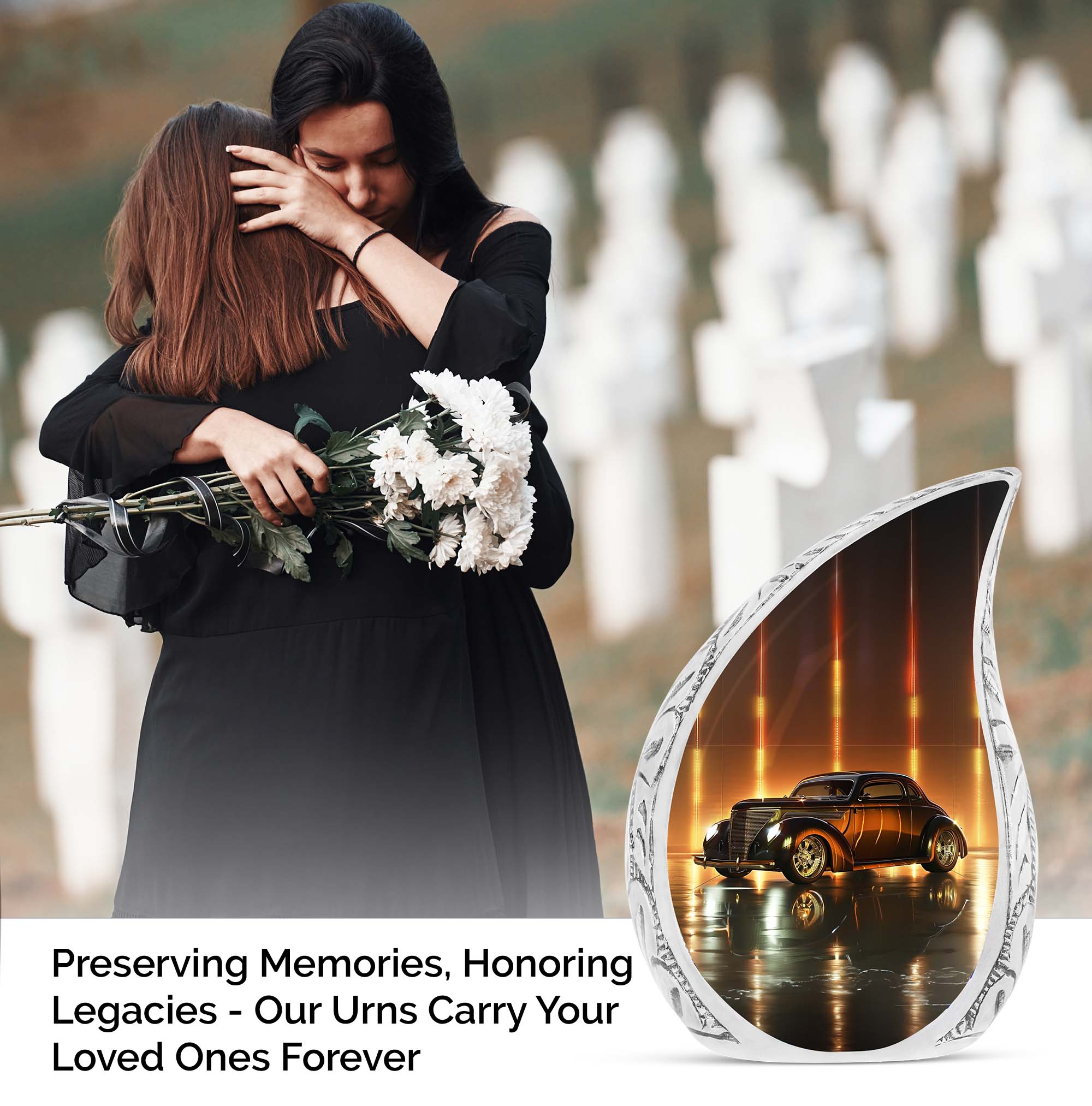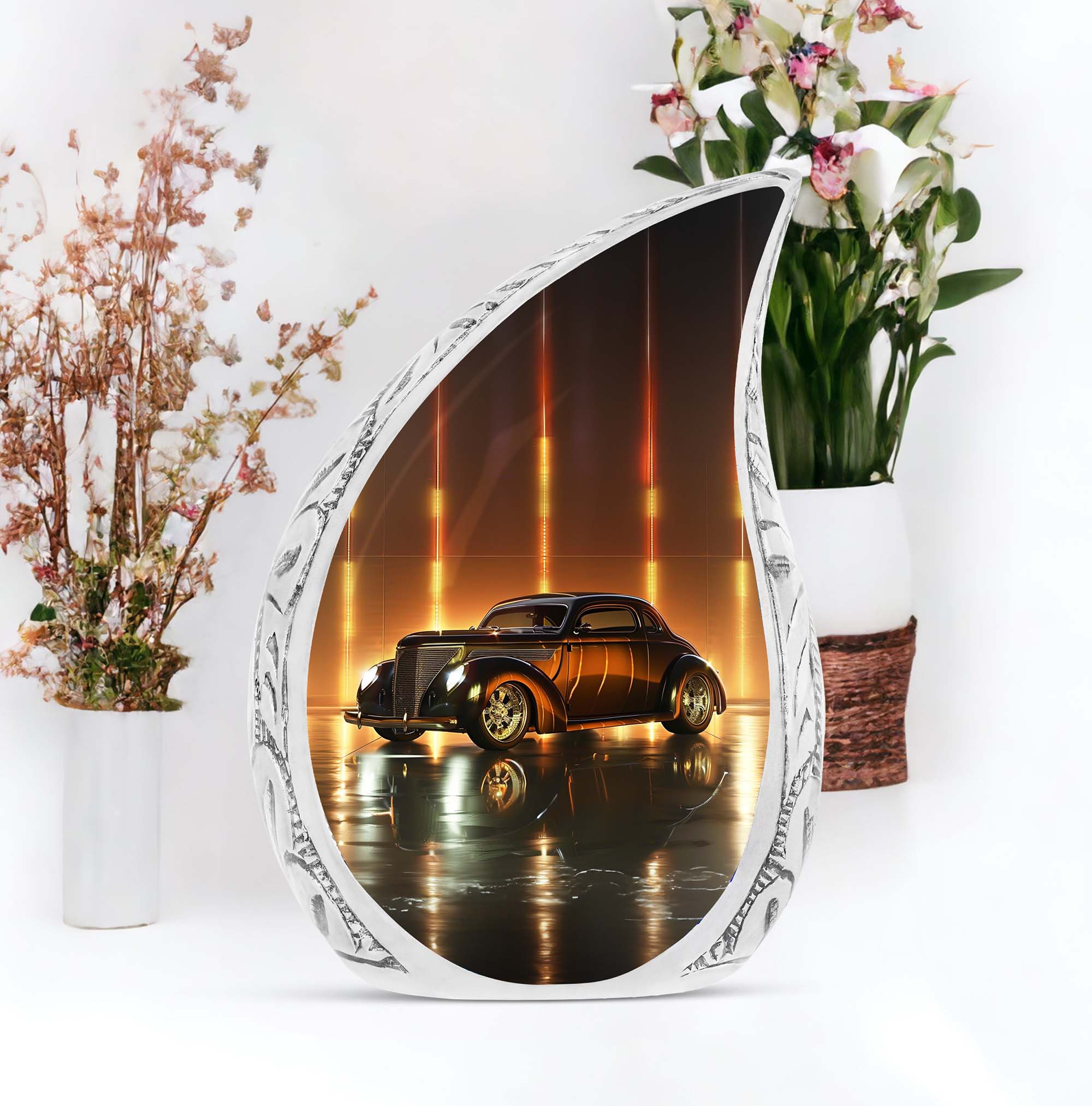 Preserve the cherished memories of a loved one in our distinct and sublime urn, carefully crafted with a classic car charm that encapsulates their vibrant life. Ideal for women who adored the timeless beauty of vintage automobiles, this urn plays homage to her passion while safeguarding her precious ashes. Our miniature urns for ashes are diligently shaped to find a balance between grace and practicality. Carefully designed for adult cremation, this urn subtly signifies an eternal bond that enriches over time. This sacred vessel transforms into a memorial ashes urn, a symbol of the ceaseless love you hold for your departed loved one. Revel in its elegant finish and rejoice in its profound symbolism. This stunning urn mirrors the journey of your beloved one, their indomitable spirit, and their everlasting impact on your lives. It's more than a remnant; it's a testament to a life well-lived and fondly remembered.