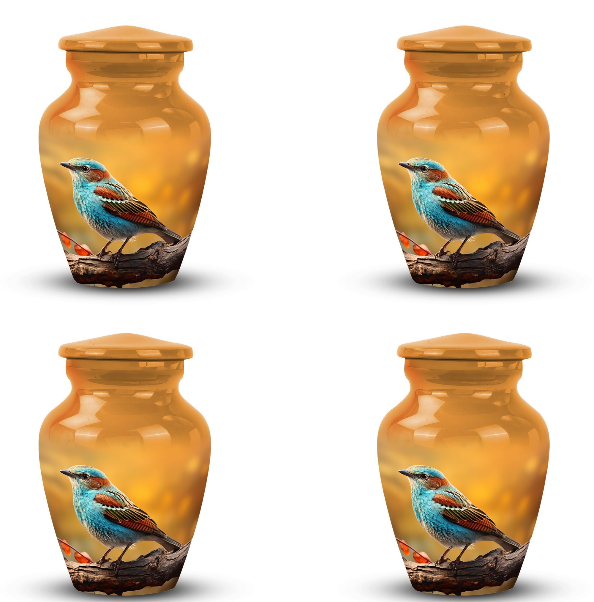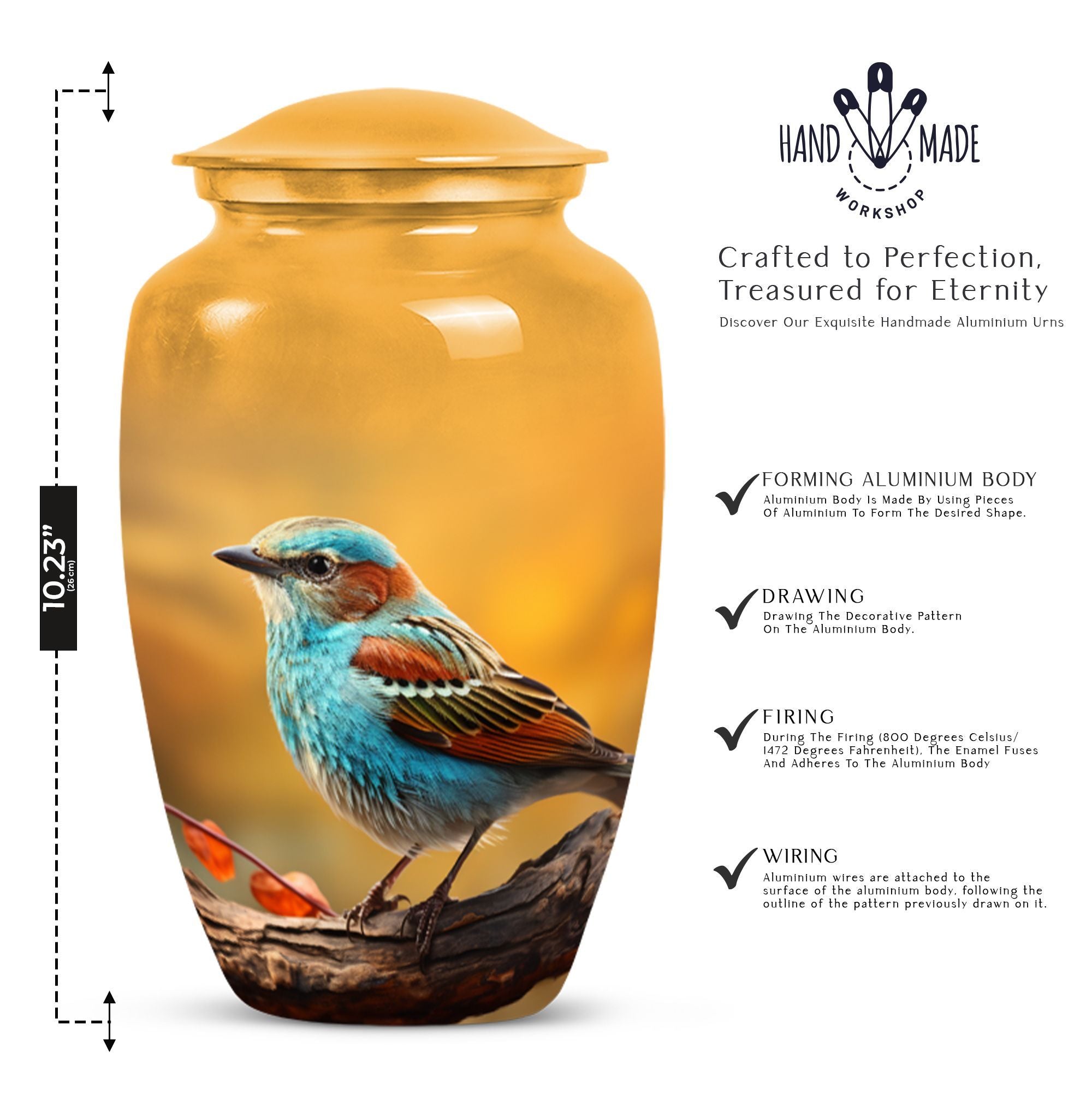 Cherishing the memory of your loved one has been beautifully made possible with our strikingly attractive 'Colorful Sparrow Cremation Urn'. With a capacity of 200 cubic inches, these large urns, skillfully crafted from pure Aluminium, are thoughtfully designed to securely contain human cremation ashes. The sizable urn measuring a complete 10 inches in height and around 3 inches wide, weighing a minimal 3.3 pounds, offers durability and longevity. The package comes complete with a velvet pouch, ensuring dignified containment of the precious remnants. An added feature allows for personalization, enabling you to engrave names on it, thereby making it a distinct, heartfelt tribute. This urn stands out not just as a mere container, but as a decorative symbol of endurance and undying love. For those seeking reliable, meaningful urns for people, the charming Colorful Sparrow Cremation Urn is your ideal choice.