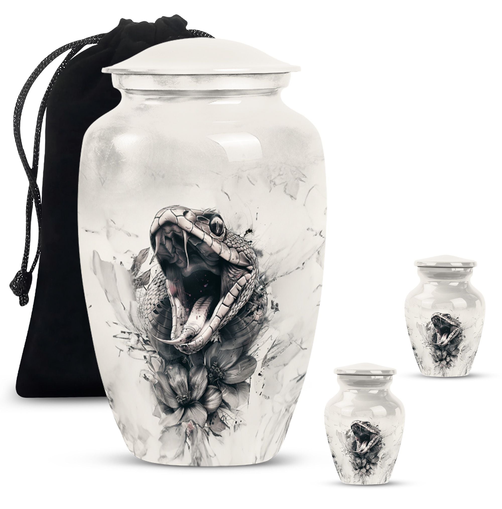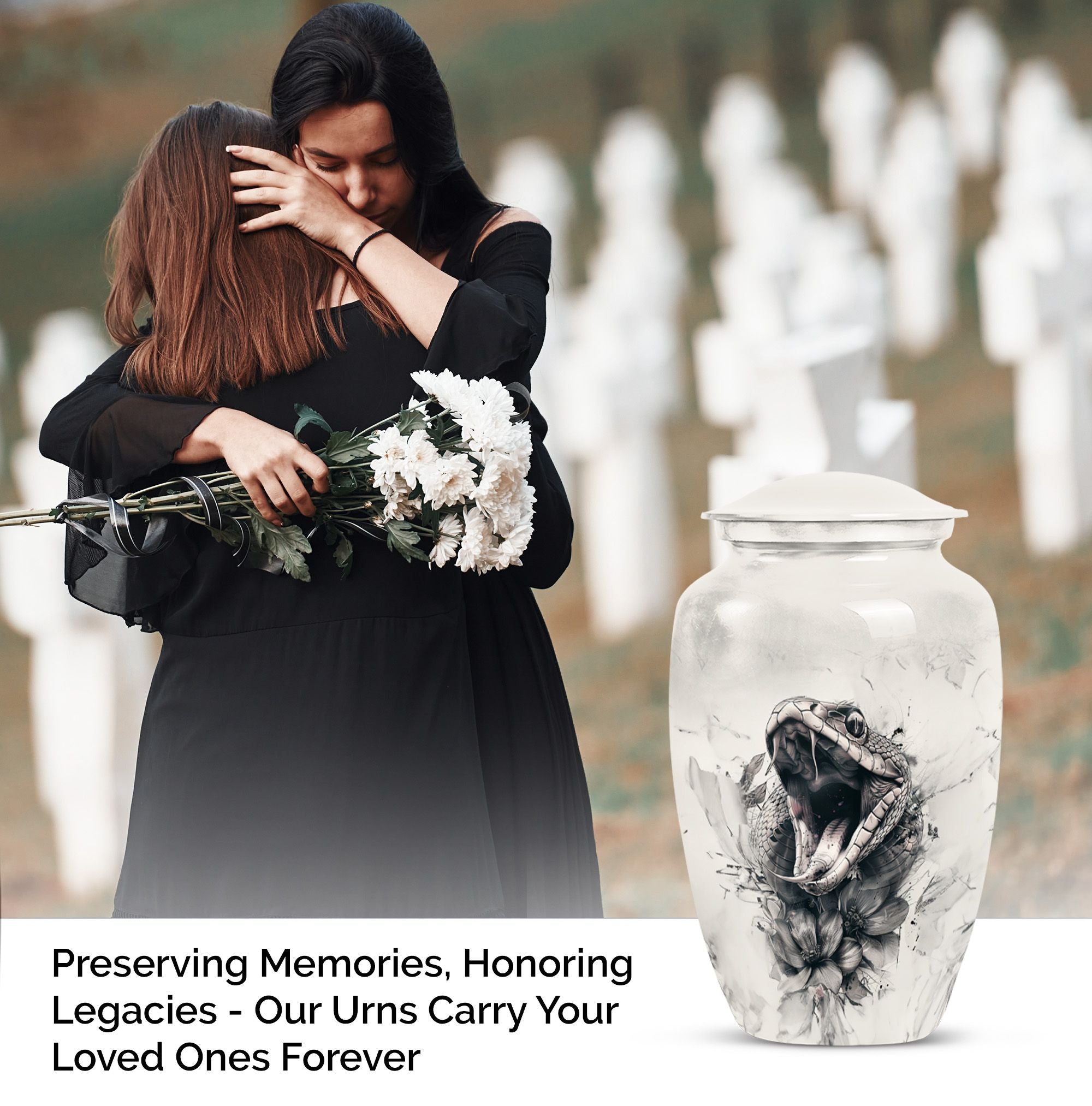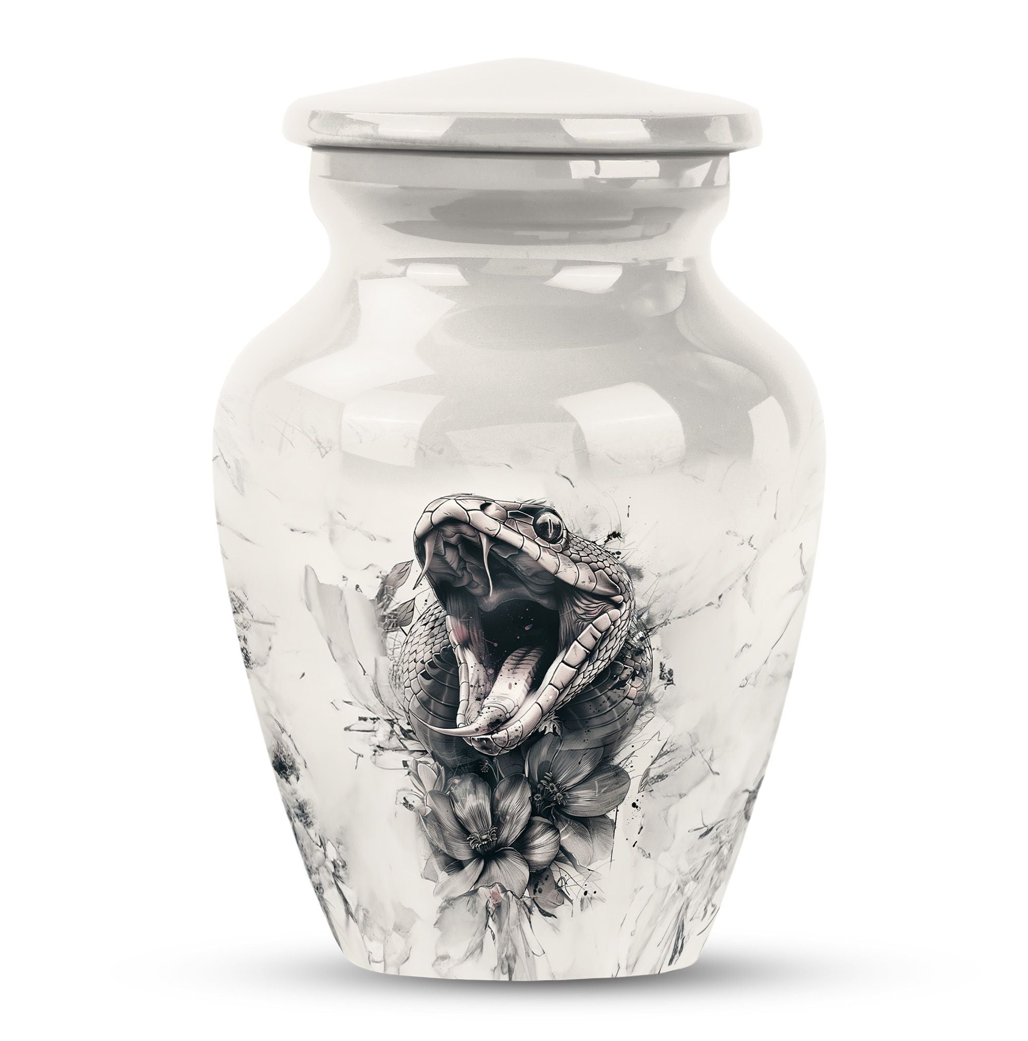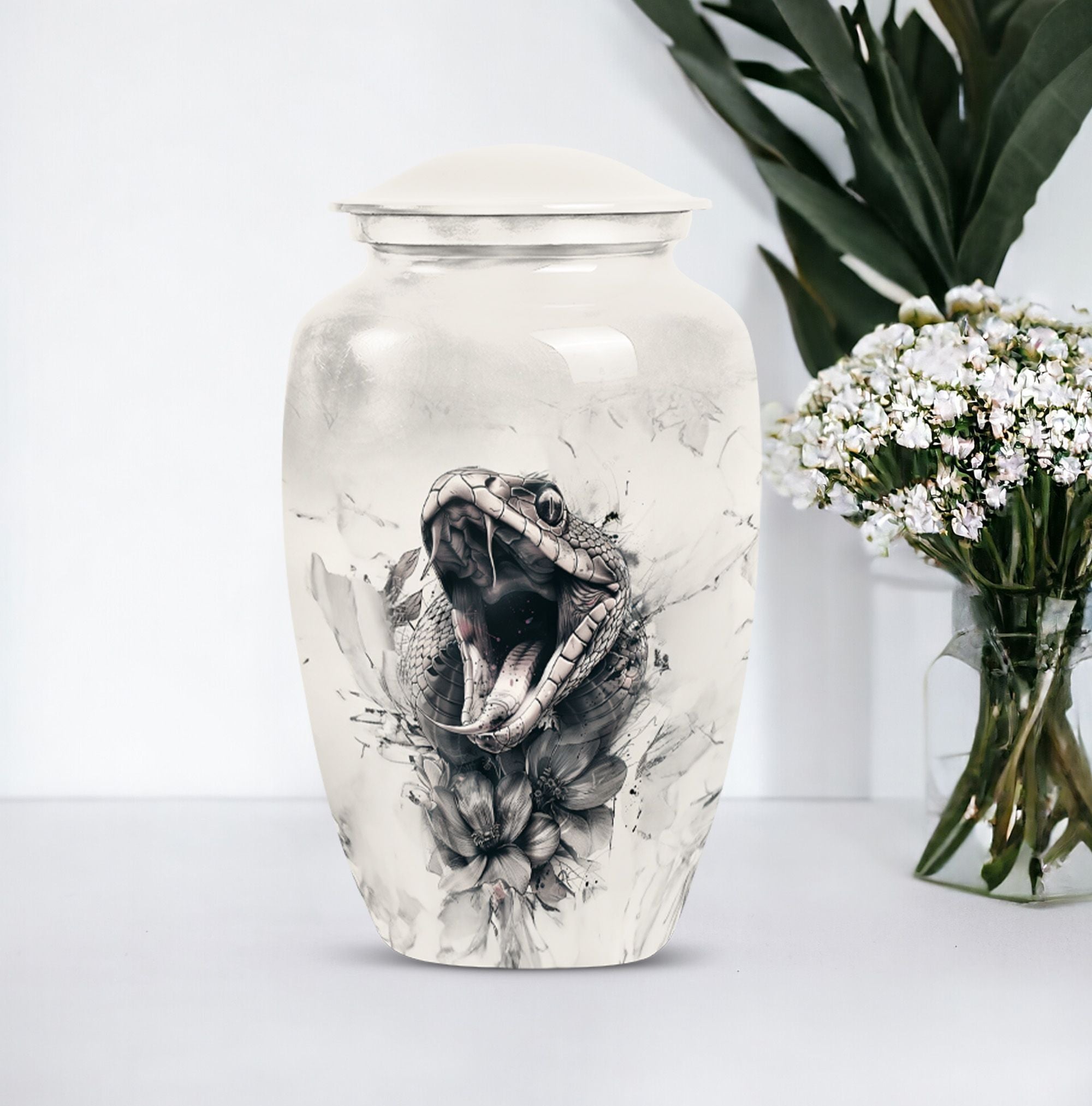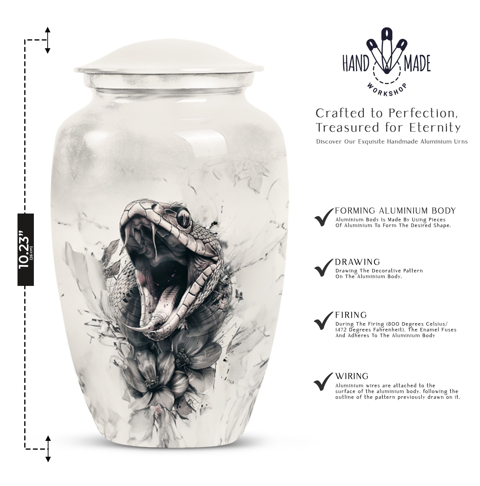 Unveiling a timeless classic, a 'Snake Urn' for your fallen loved one. Designed with respect and dignity, this 10-inch burial urn is specifically crafted for adult females, but can also be used as a tasteful memorial for adult males. Handcrafted from robust Aluminium, this abstract themed urn weighs a sturdy 3.3 pounds. It boasts an immense capacity of 200 cubic inches, offering significant room for your loved one's ashes. Each urn arrives meticulously packed in a velvet pouch for a respectful containment of your cherished ashes. This cremation urn can be cherished in your home, or used for burial purposes. The urn can be personalized with engraved names, allowing you to create a truly unique memorial. This isn't just a Burial funeral urn; it is also a tangible memorial gift that holds a priceless value. Keywords importantly associated with this product include 'cremation urn funeral urn adult ash' and 'metal urn for ashes adult male'. Every detail reflects our commitment to help you honour your loved one, in the language of heartfelt craftsmanship.