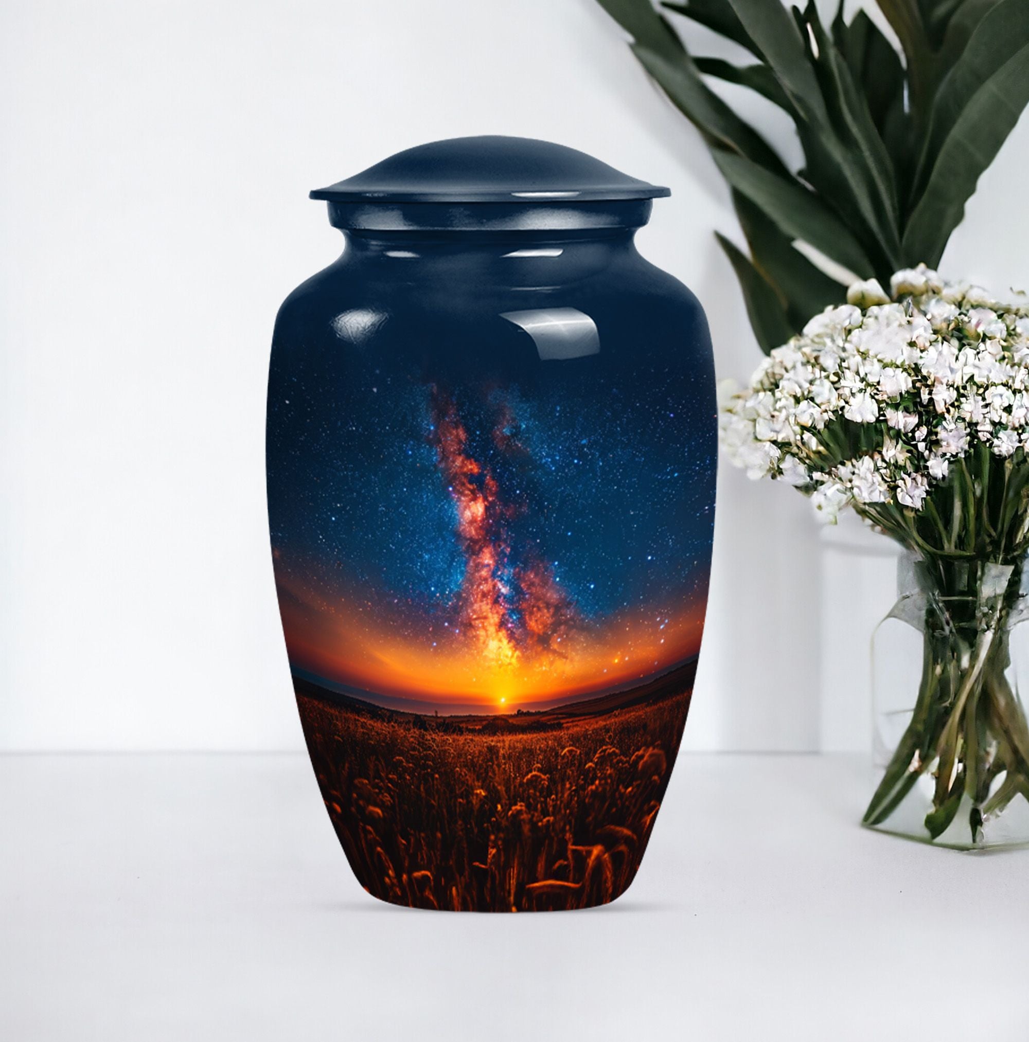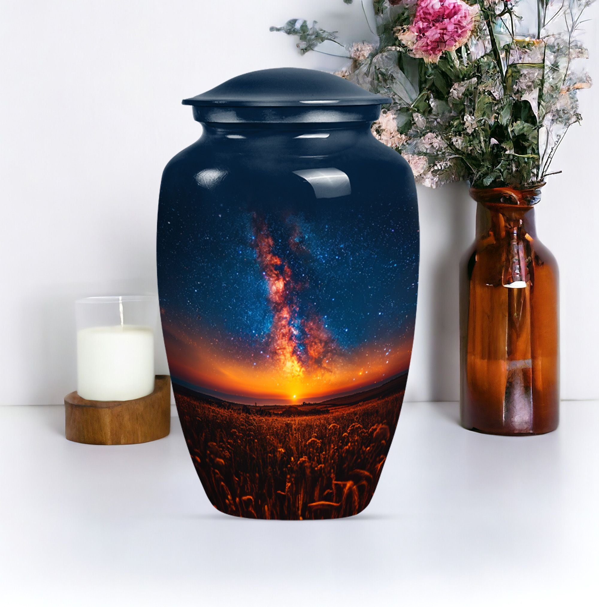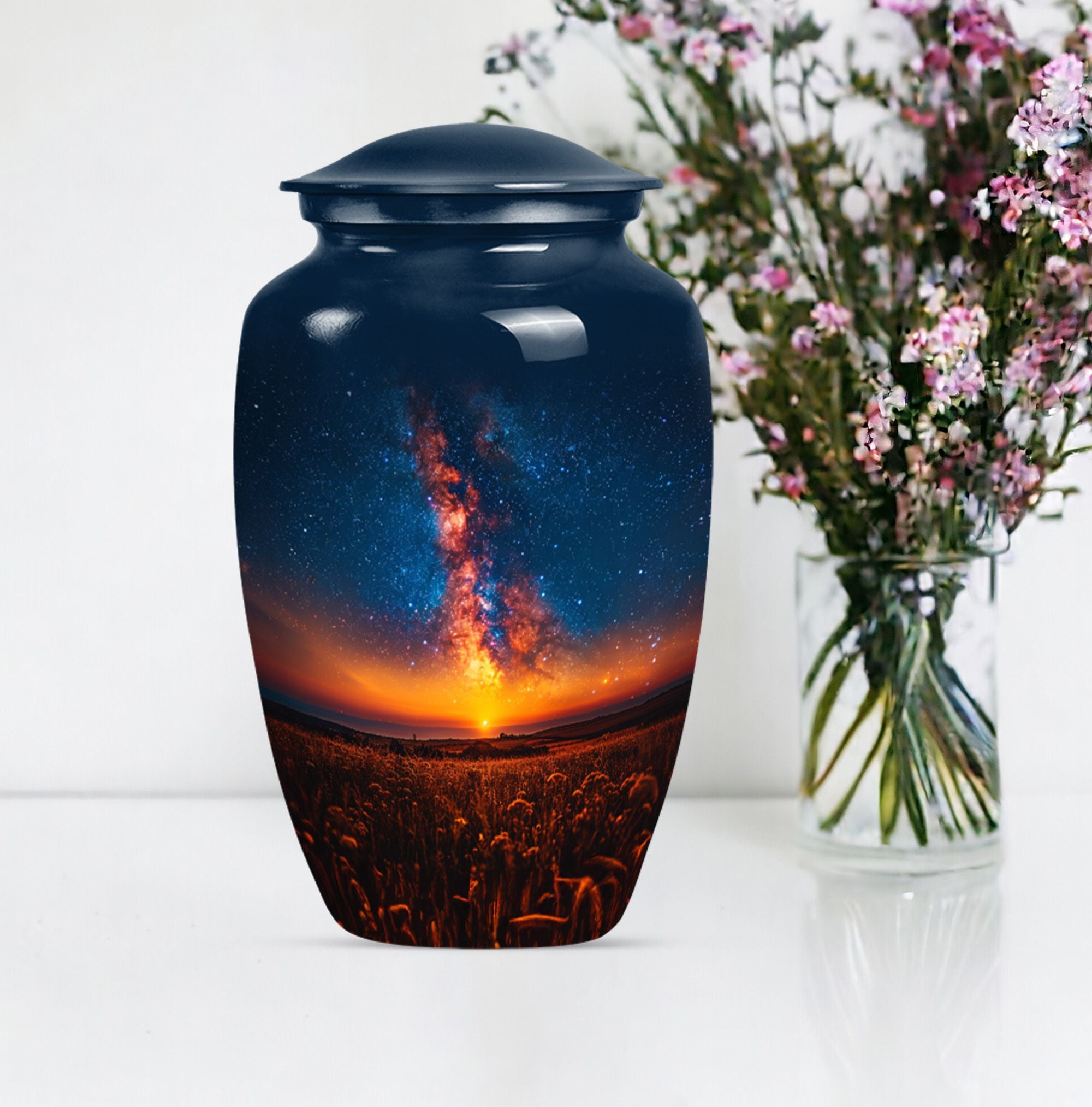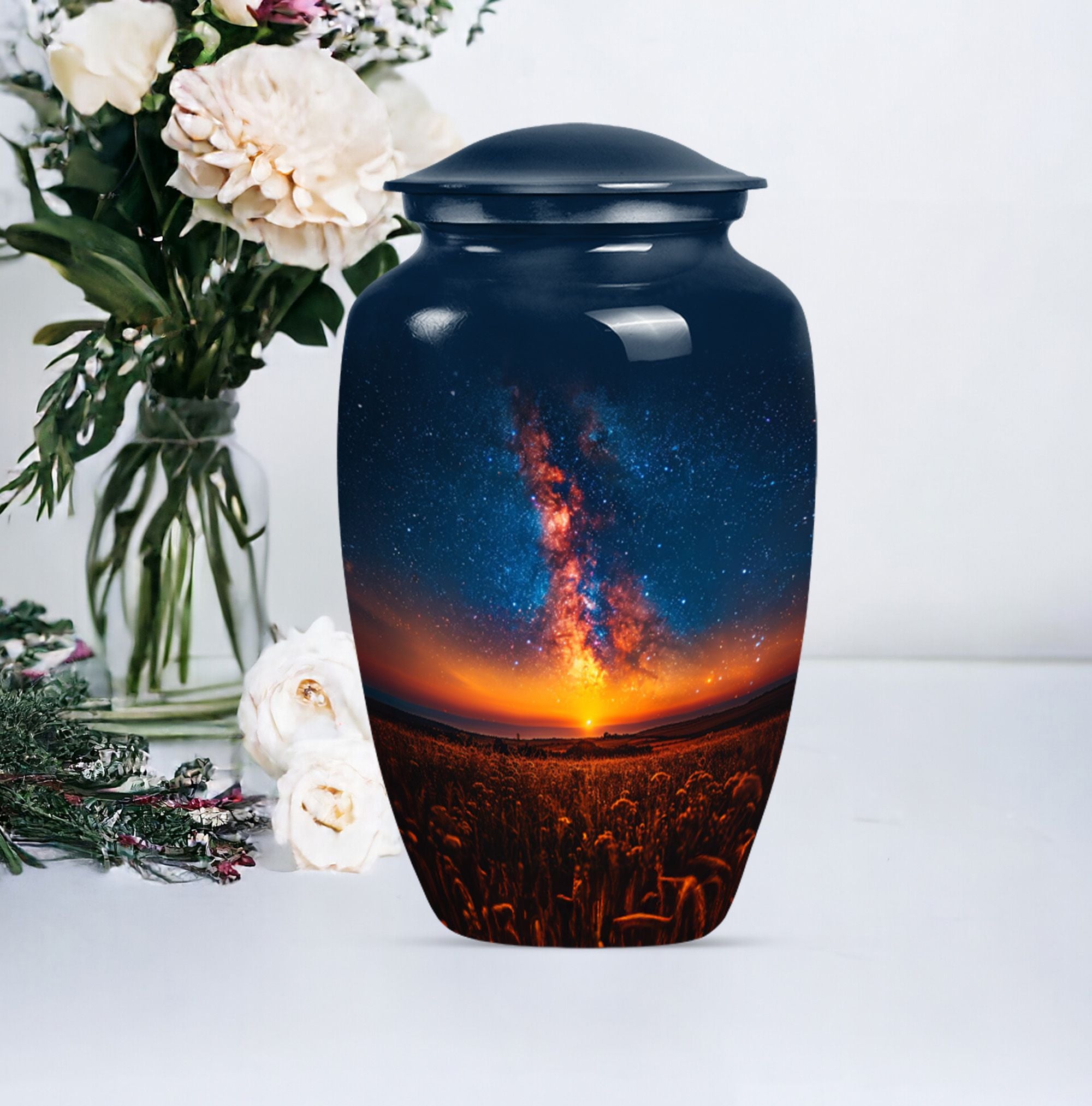 Undoubtedly dignified, the Galaxy Urn is a striking fusion of intimate sentiment and sophisticated craftsmanship. A top choice among cremation medium urns for human ashes, this memorial urn exudes elegance whilst keeping memorial decorum intact. Finished in a robust 'Abstract' theme, this large urn measures a generous 10 inches in height. Composed of sturdy yet lightweight aluminium, it weighs a solid 3.3 pounds and displays a capacity of 200 cubic inches for ashes. Your purchase incorporates a velvet pouch for secure containment and easeful transportation of your cherished one's remains. Adding a heartfelt touch, this urn can be further personalized with beautifully engraved names, memorializing your intimate connection. The Galaxy Urn, a notable example in the realm of burial cremation urns, mirrors the eternal respect and love you honor your beloved with. An outstanding choice for human cremation and funeral preparation.