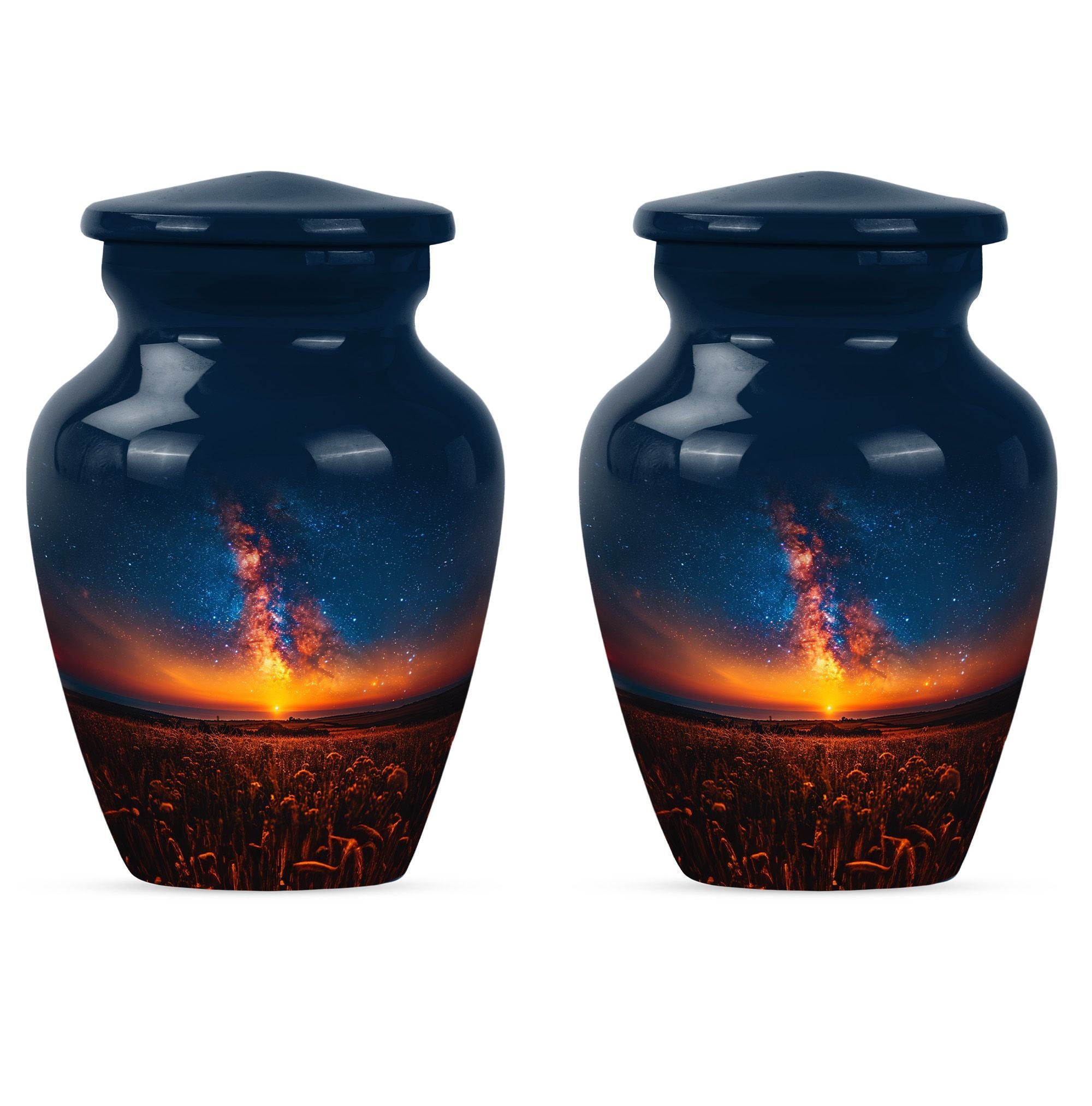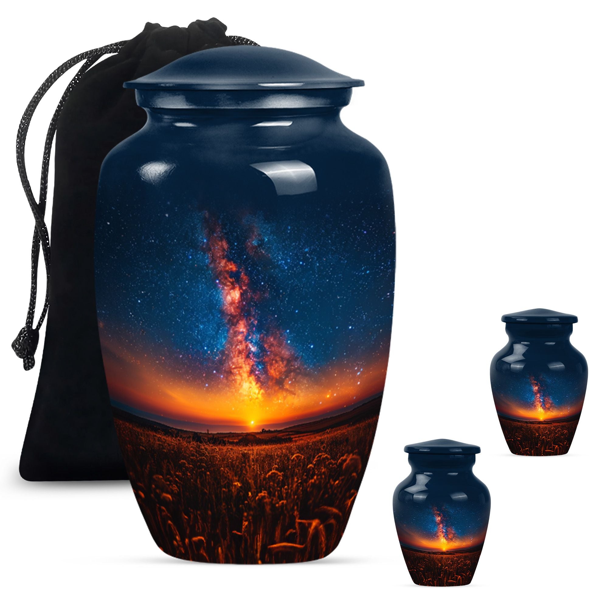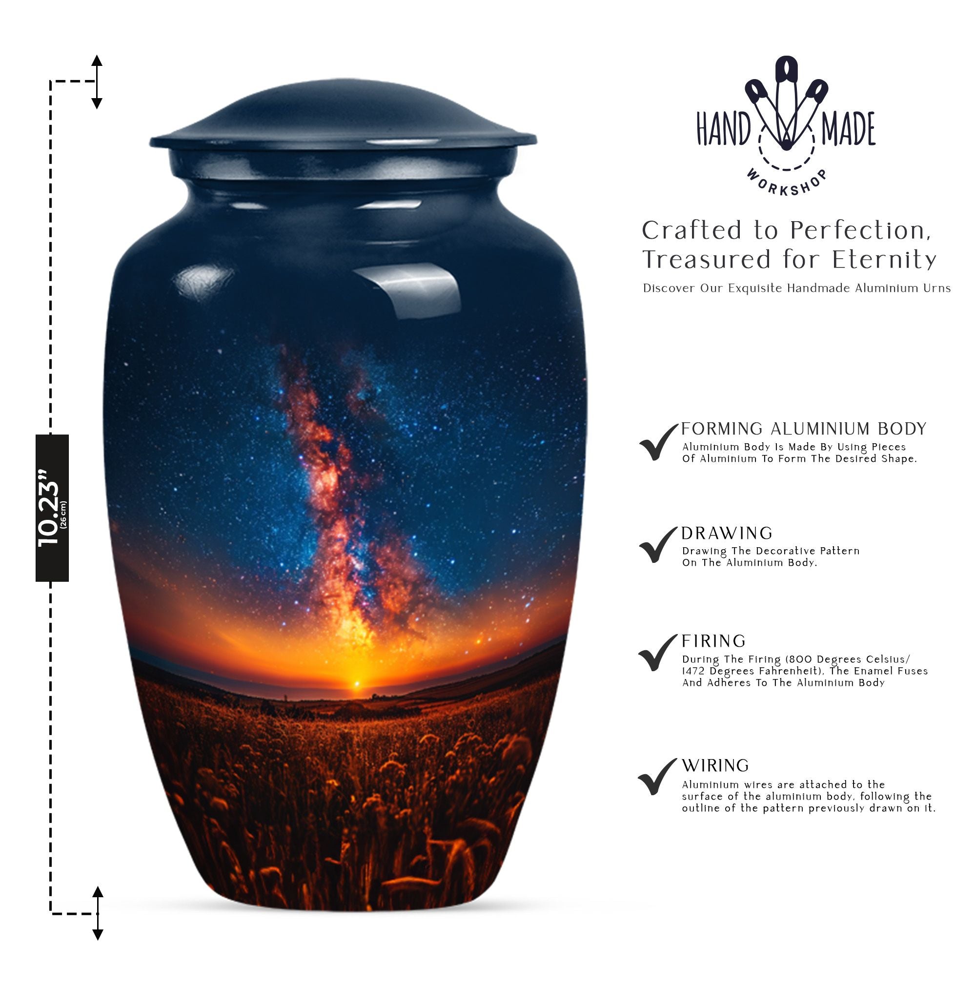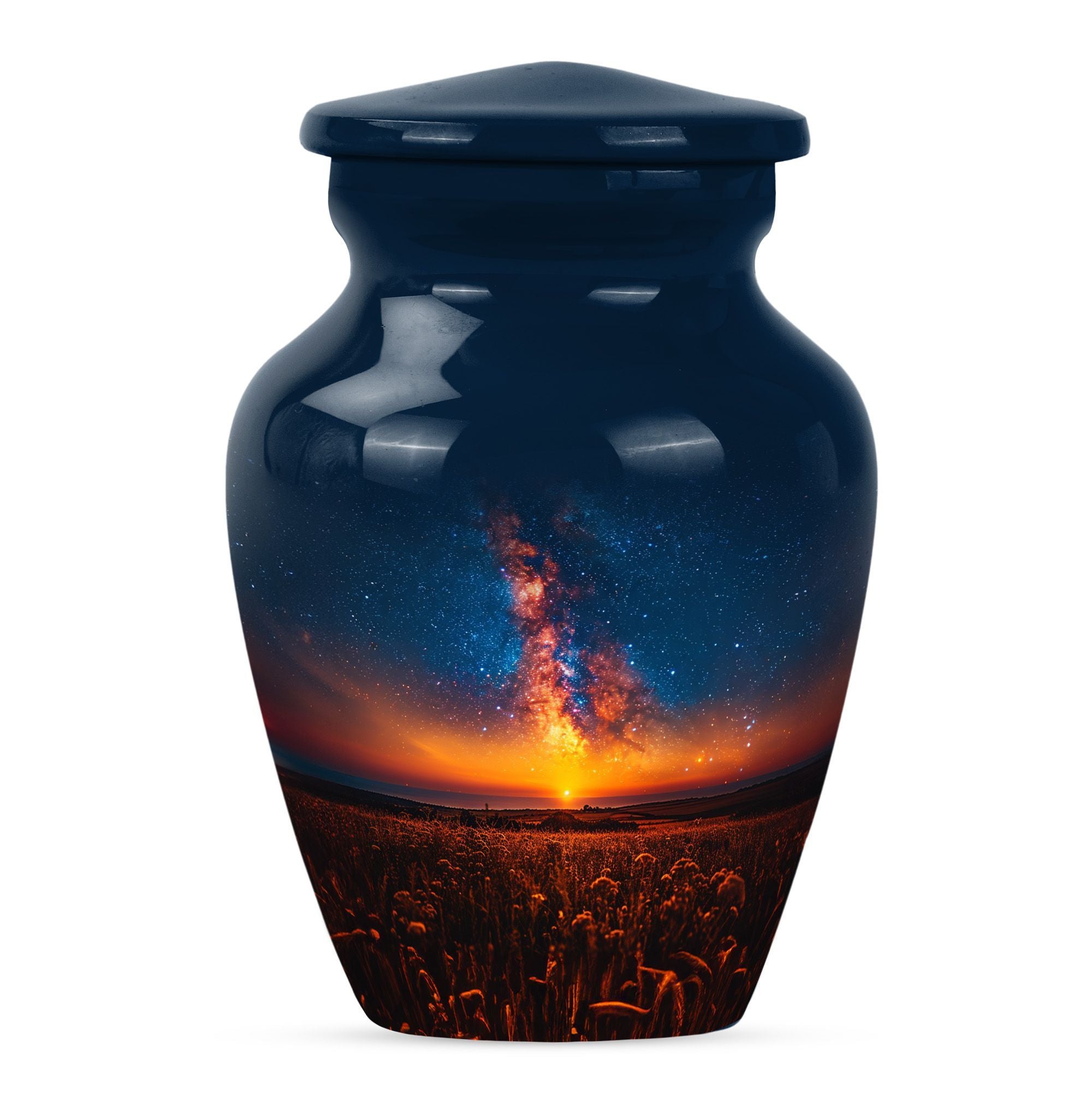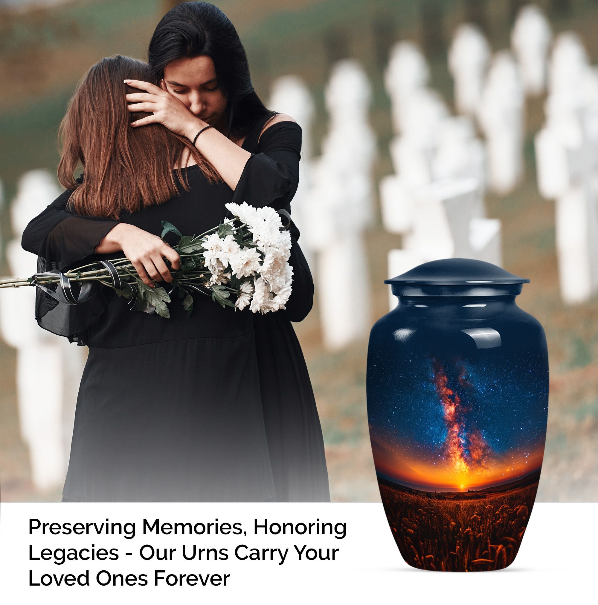 Undoubtedly dignified, the Galaxy Urn is a striking fusion of intimate sentiment and sophisticated craftsmanship. A top choice among cremation medium urns for human ashes, this memorial urn exudes elegance whilst keeping memorial decorum intact. Finished in a robust 'Abstract' theme, this large urn measures a generous 10 inches in height. Composed of sturdy yet lightweight aluminium, it weighs a solid 3.3 pounds and displays a capacity of 200 cubic inches for ashes. Your purchase incorporates a velvet pouch for secure containment and easeful transportation of your cherished one's remains. Adding a heartfelt touch, this urn can be further personalized with beautifully engraved names, memorializing your intimate connection. The Galaxy Urn, a notable example in the realm of burial cremation urns, mirrors the eternal respect and love you honor your beloved with. An outstanding choice for human cremation and funeral preparation.