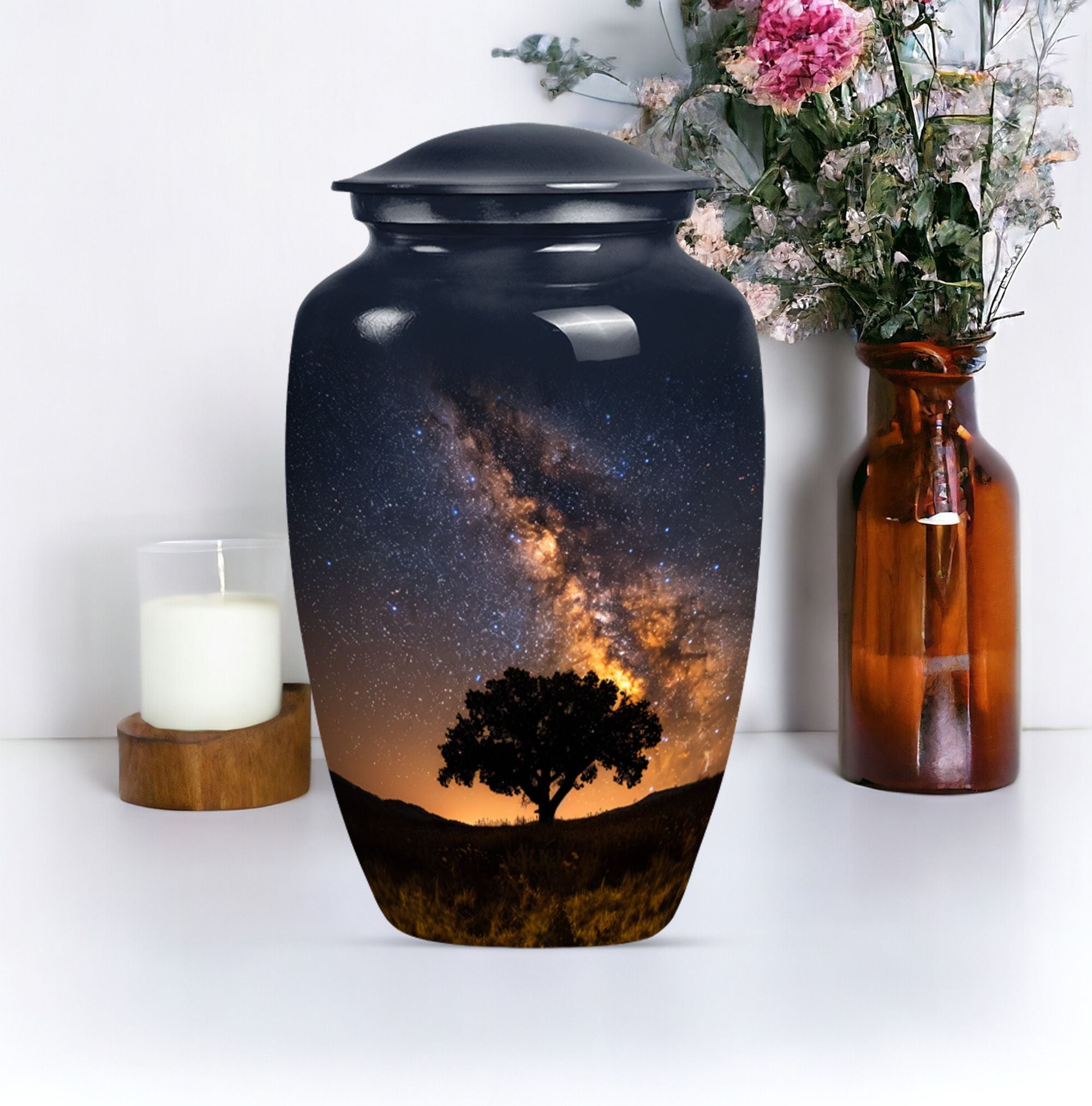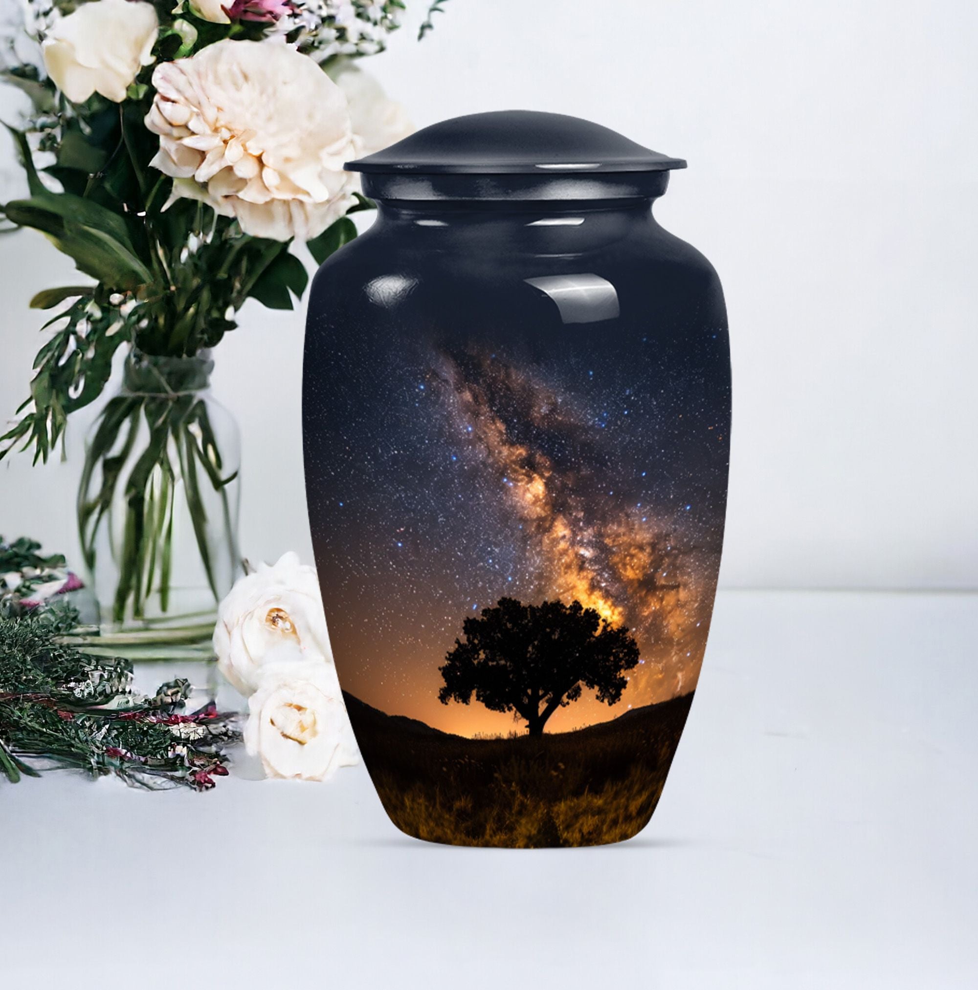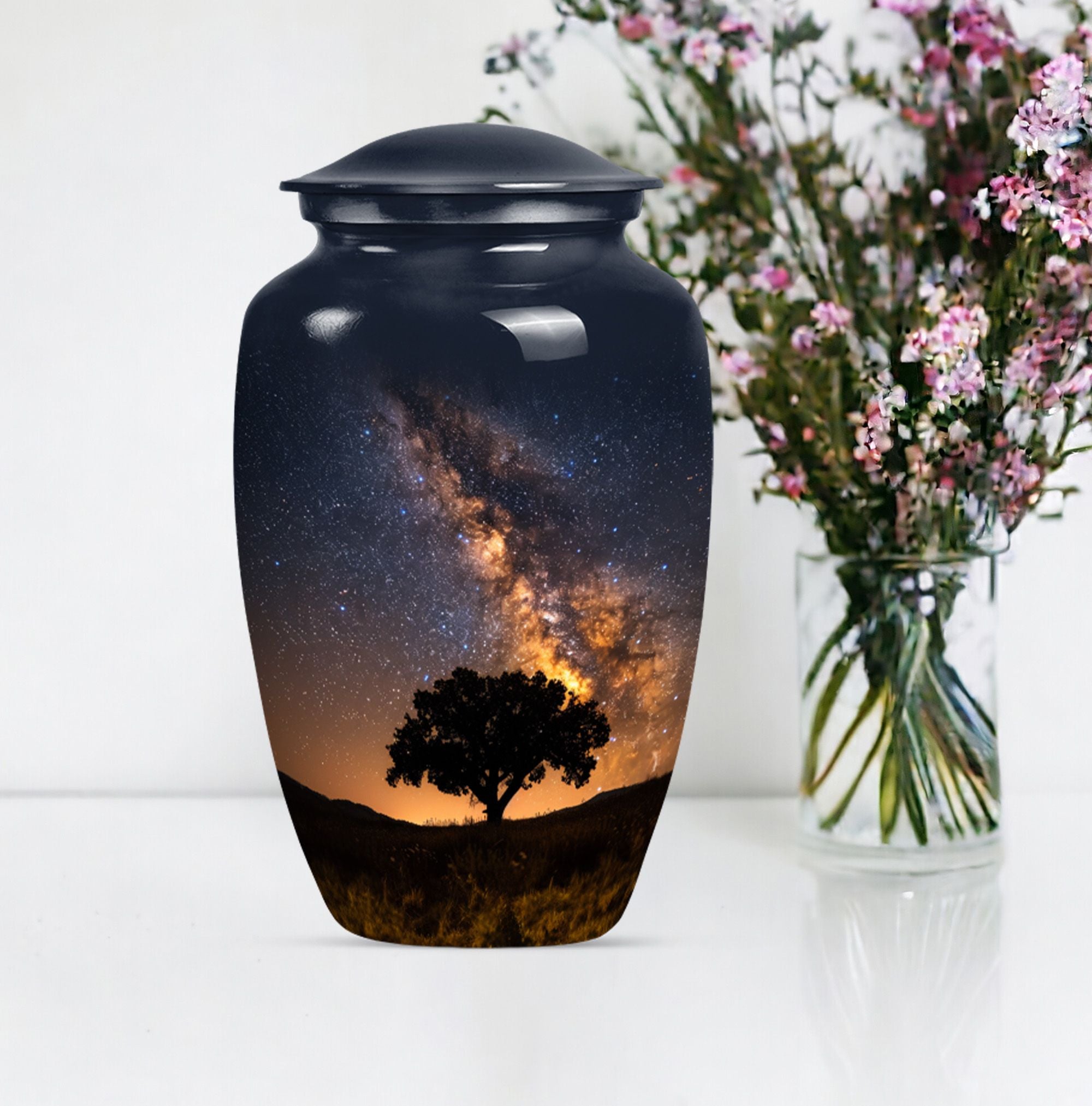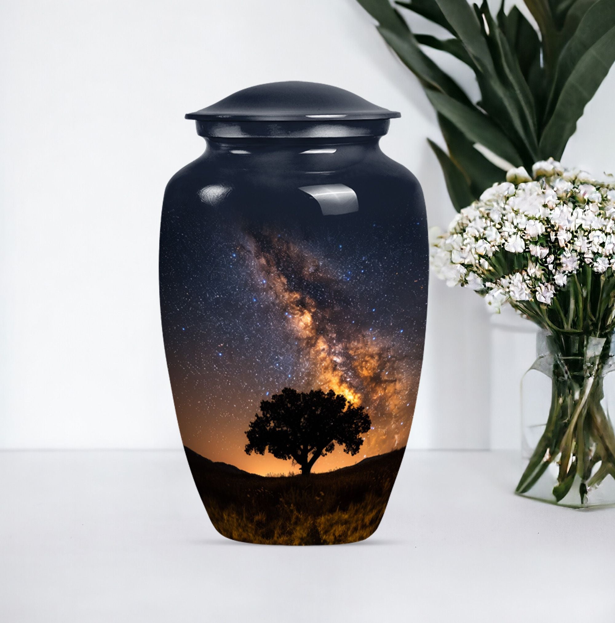 Crafted to honor the memory of loved ones, our 10-inch Galaxy Urn serves as a rightful tribute to their journey. This funeral burial urn, designed with an abstract theme, illustrates an epic fusion of nobility and tranquility. Weighing 3.3 pounds, this cremation urn has a capacity of 200 cubic inches, perfect for large urn requirement. Made with superior-quality Aluminium, it reflects an enchanting sheen and offers durability that withstands time. Your customization possibilities are unlimited with our offering, you can personalize it with engraved names, giving it an intimate touch. Inside the package, you'll find a velvet pouch for refined containment of ashes, adding a layer of respect and graceful handling. The Classic Urn design presents a synergy of tradition and innovation, serving as a beacon of cherished memories. Whether you're searching for 'urn human ash urn ash' or 'adult cremation urns,' our Galaxy Urn is bound to exceed your expectations in memorial ceremony supplies.