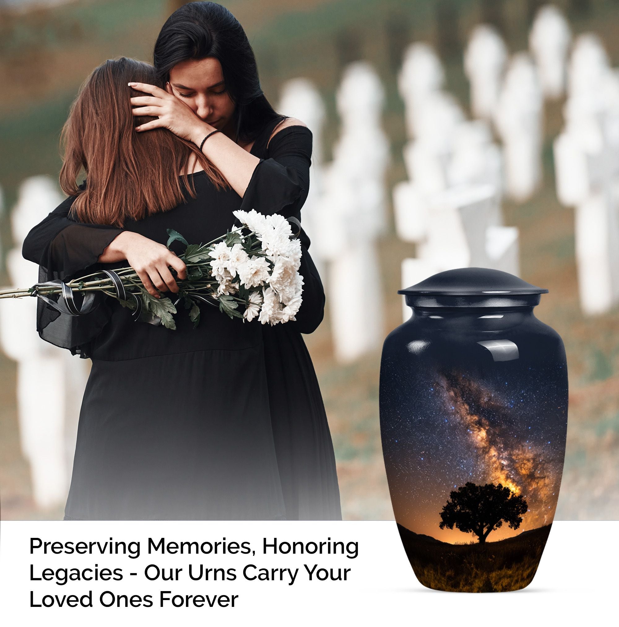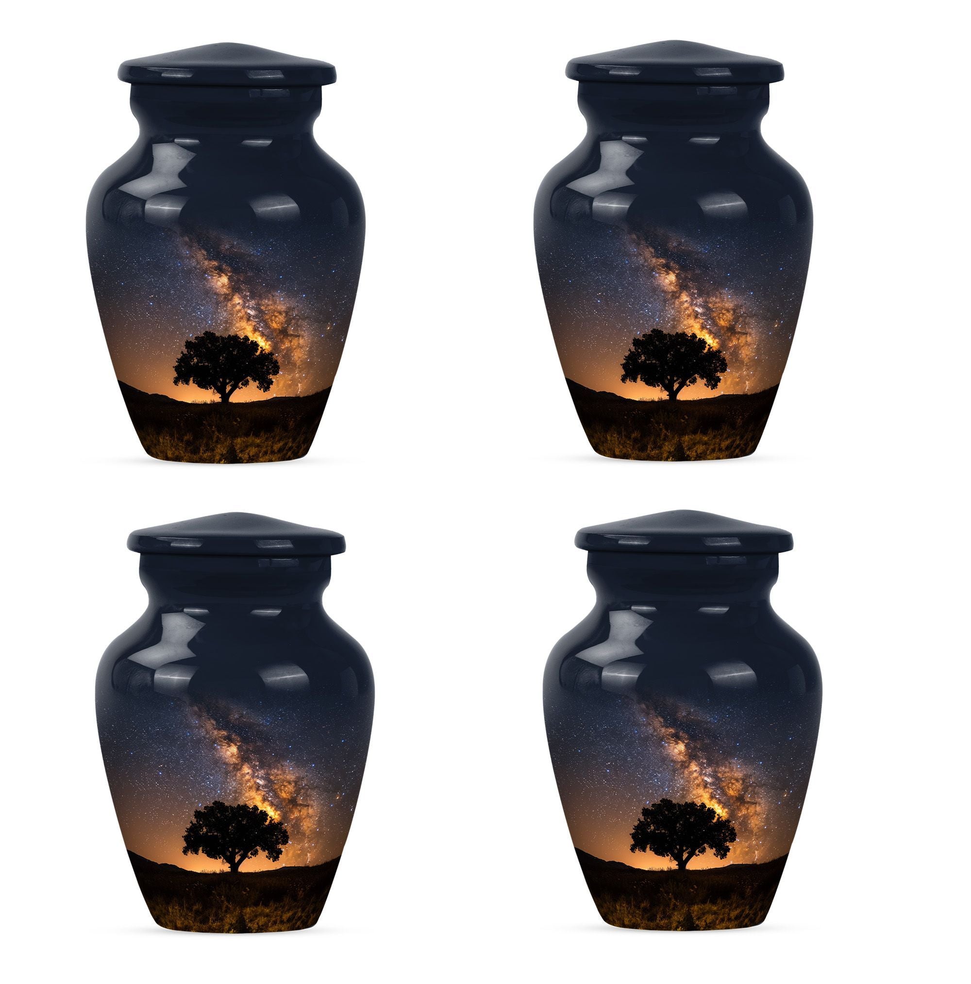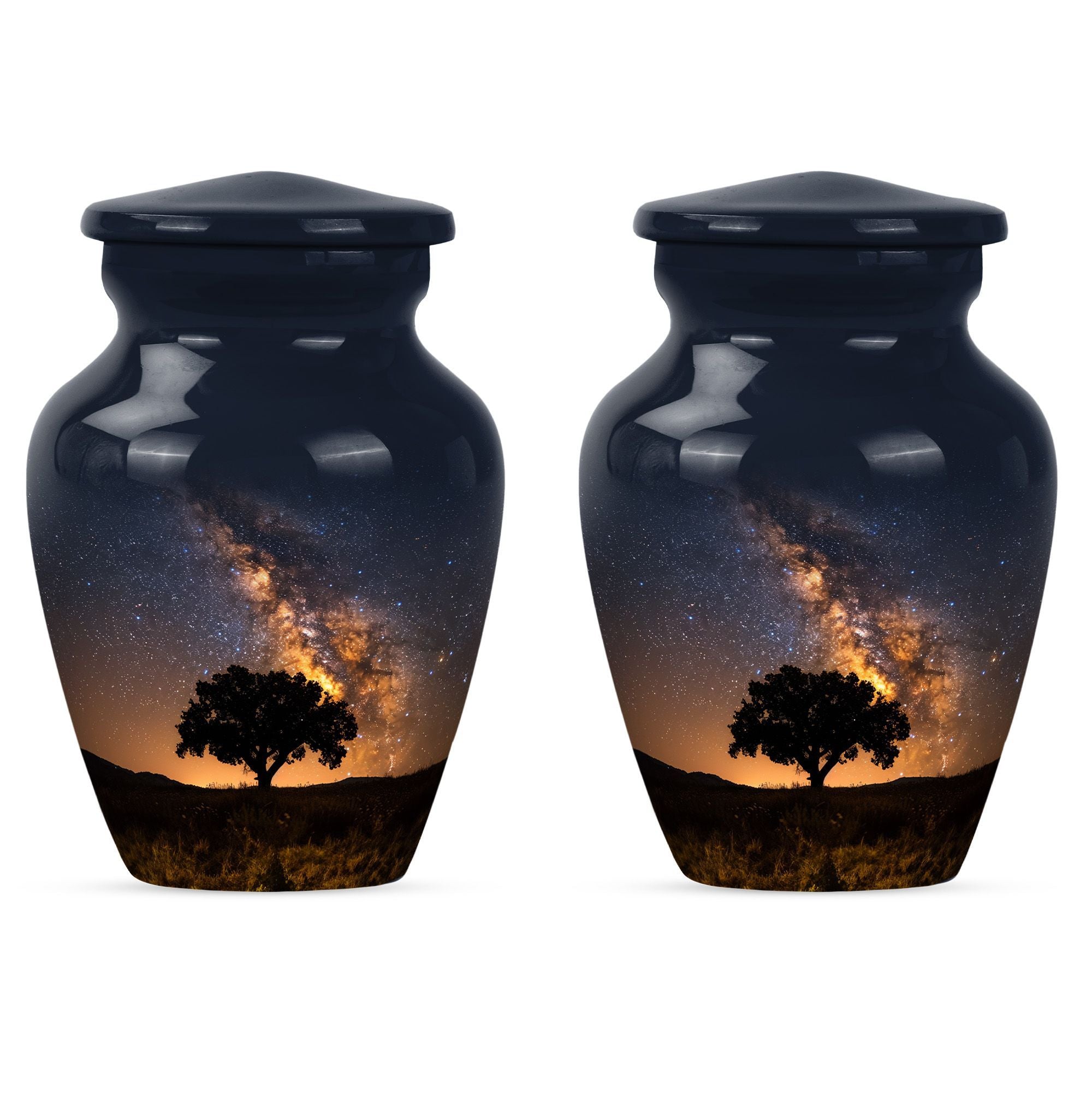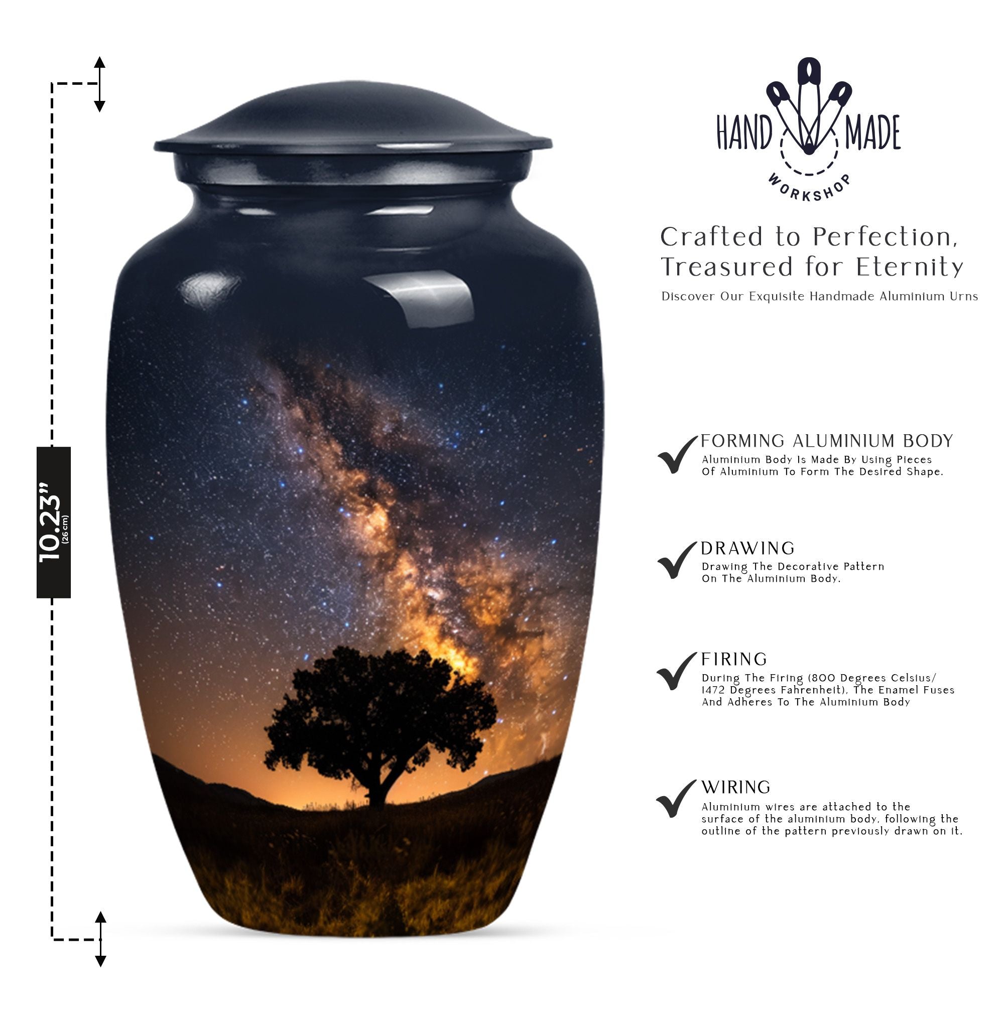 Crafted to honor the memory of loved ones, our 10-inch Galaxy Urn serves as a rightful tribute to their journey. This funeral burial urn, designed with an abstract theme, illustrates an epic fusion of nobility and tranquility. Weighing 3.3 pounds, this cremation urn has a capacity of 200 cubic inches, perfect for large urn requirement. Made with superior-quality Aluminium, it reflects an enchanting sheen and offers durability that withstands time. Your customization possibilities are unlimited with our offering, you can personalize it with engraved names, giving it an intimate touch. Inside the package, you'll find a velvet pouch for refined containment of ashes, adding a layer of respect and graceful handling. The Classic Urn design presents a synergy of tradition and innovation, serving as a beacon of cherished memories. Whether you're searching for 'urn human ash urn ash' or 'adult cremation urns,' our Galaxy Urn is bound to exceed your expectations in memorial ceremony supplies.